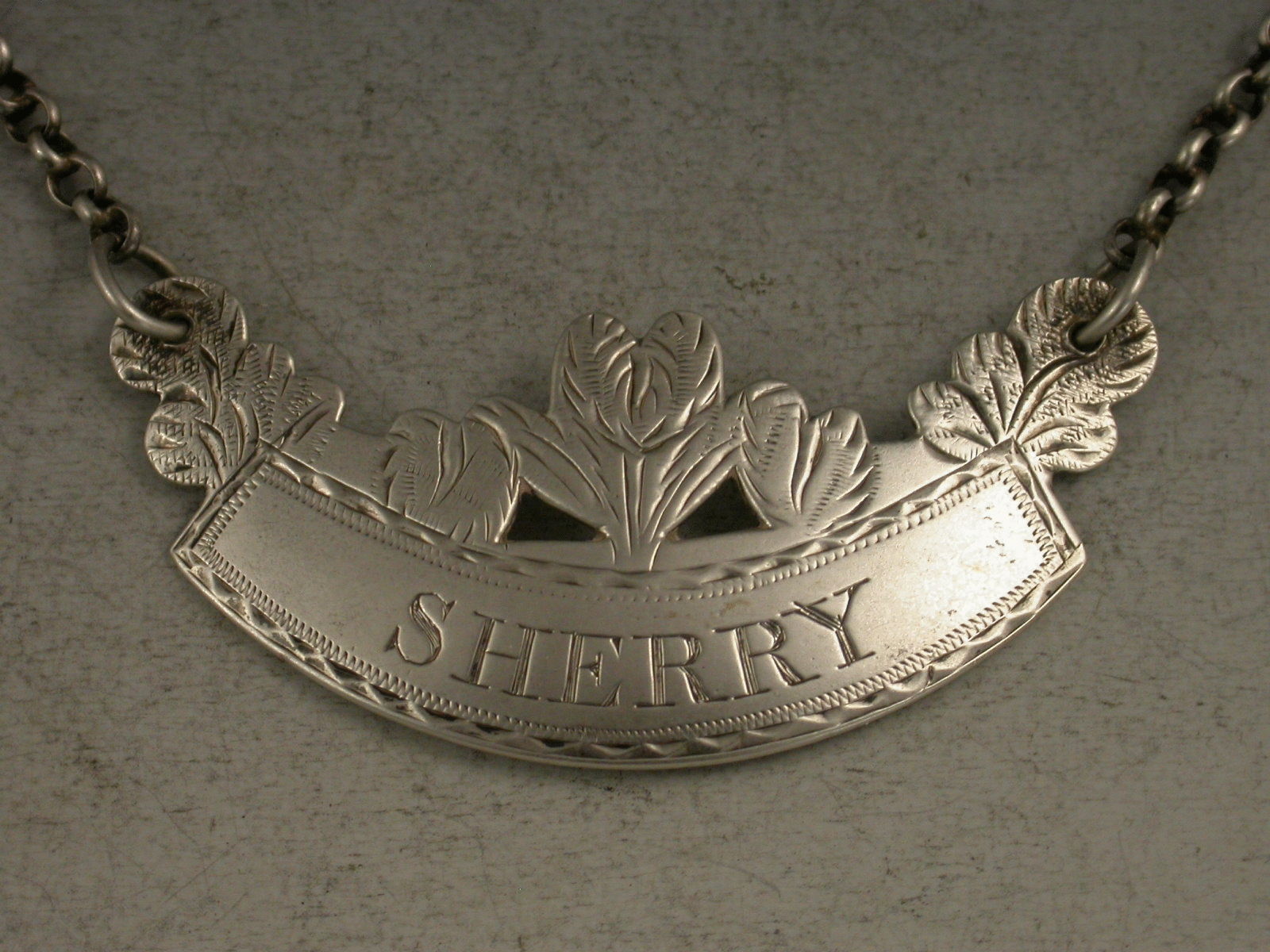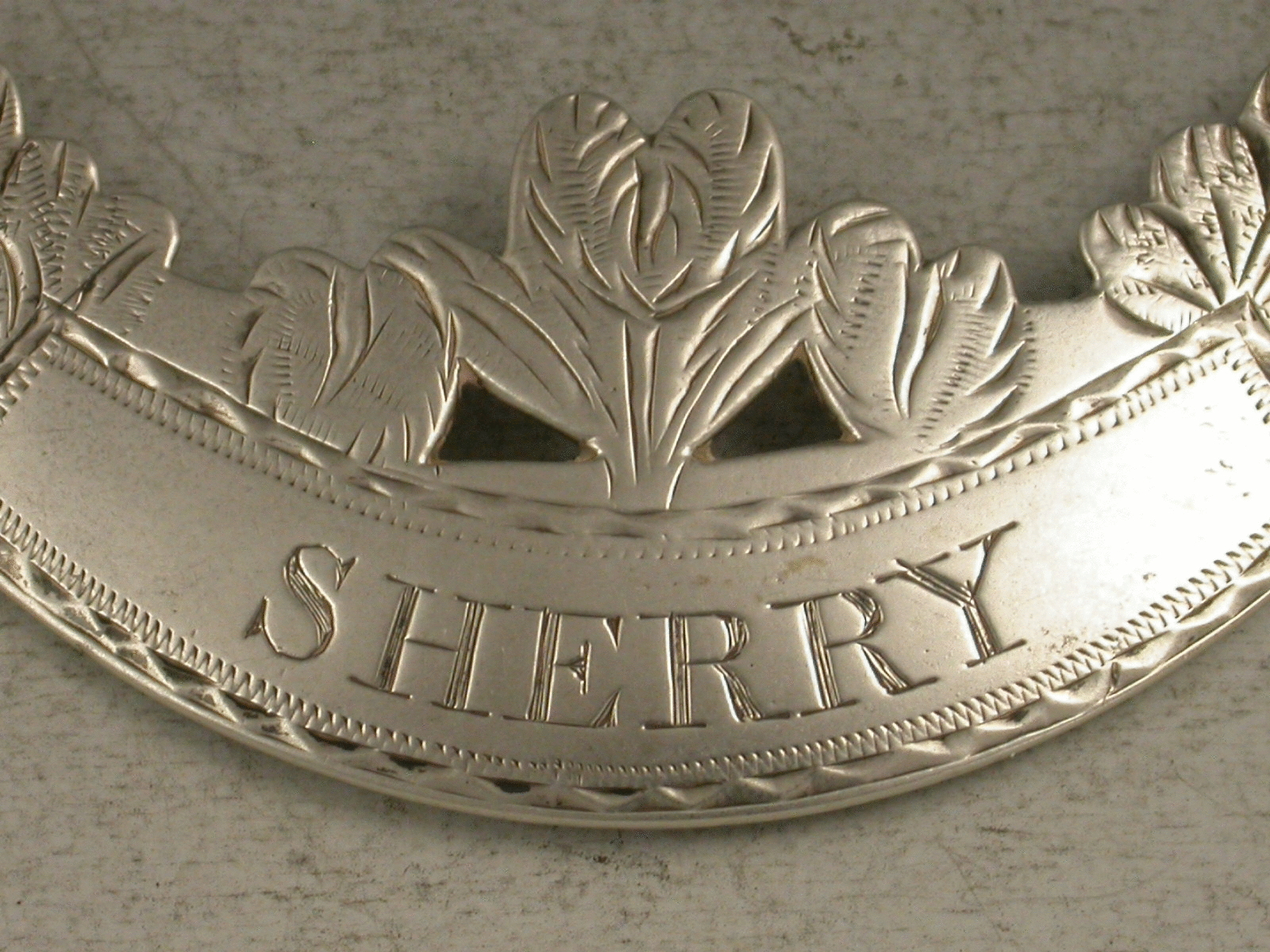 An extremely rare Irish Provincial silver Wine Label of shallow crescent form with scrolled leaf ends and “Prince of Wales feathers” type surmount, incised for Sherry, bright cut and prick dot engraved border. A copy of the “Prince of Wales feathers” label made in London, usually by the Bateman’s.