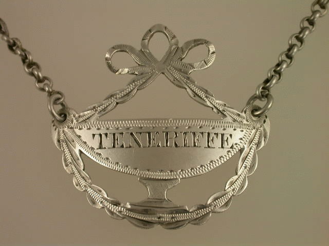 An extremely fine and rare George III Irish Provincial silver Wine Label of “Goblet, Festoon and Ribbon” form, with bright-cut and pricked engraving, incised for TENERIFFE.