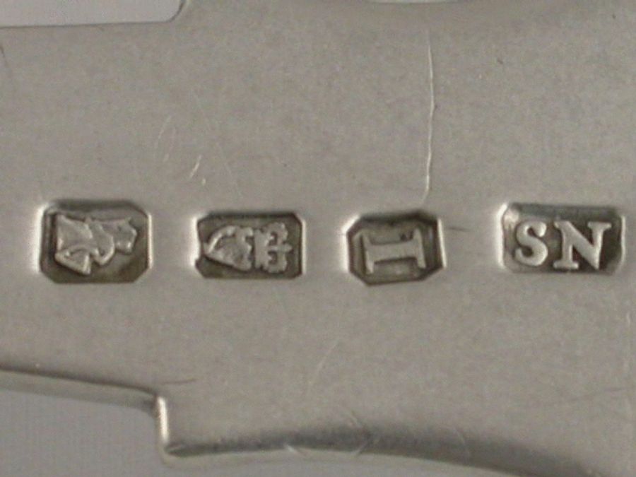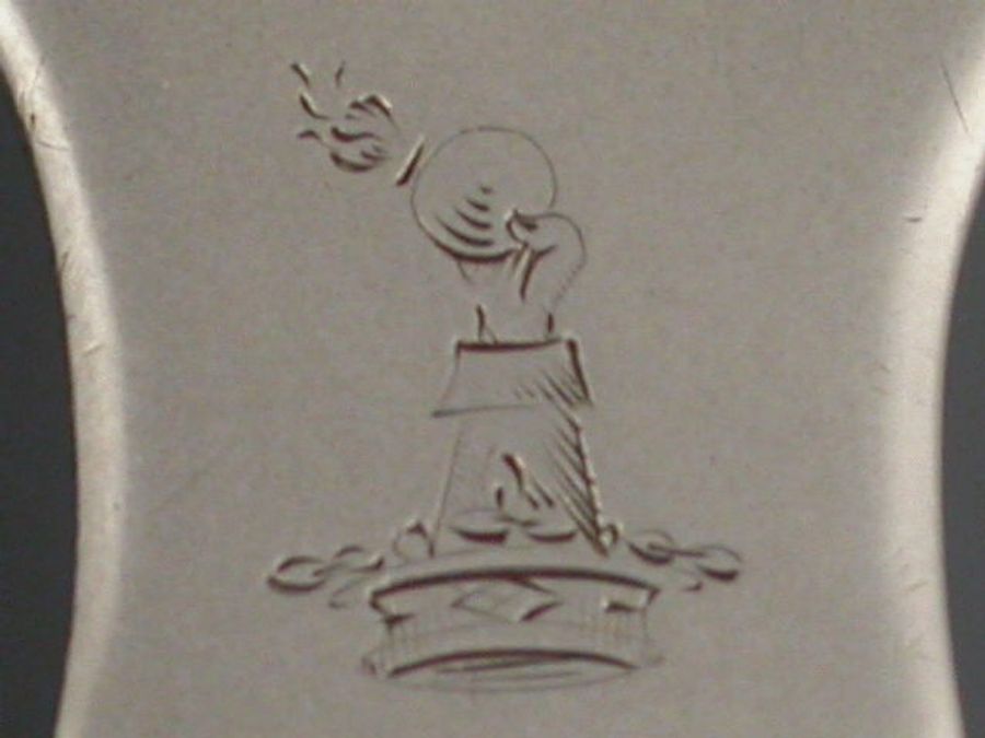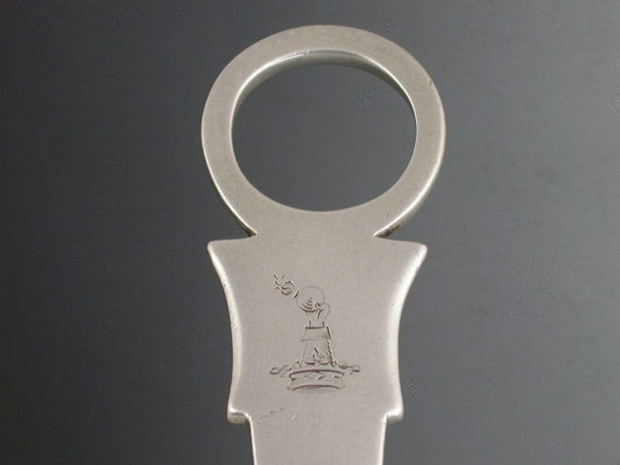 A good George III Irish silver Meat Skewer with plain ring terminal above a shield shaped cartouche engraved with a crest:-. “Out of a ducal coronet or, a cubit arm habited and gloved holding a fire-ball, all ppr”, probably for Spicer of Weare, in Topsham, Devon.