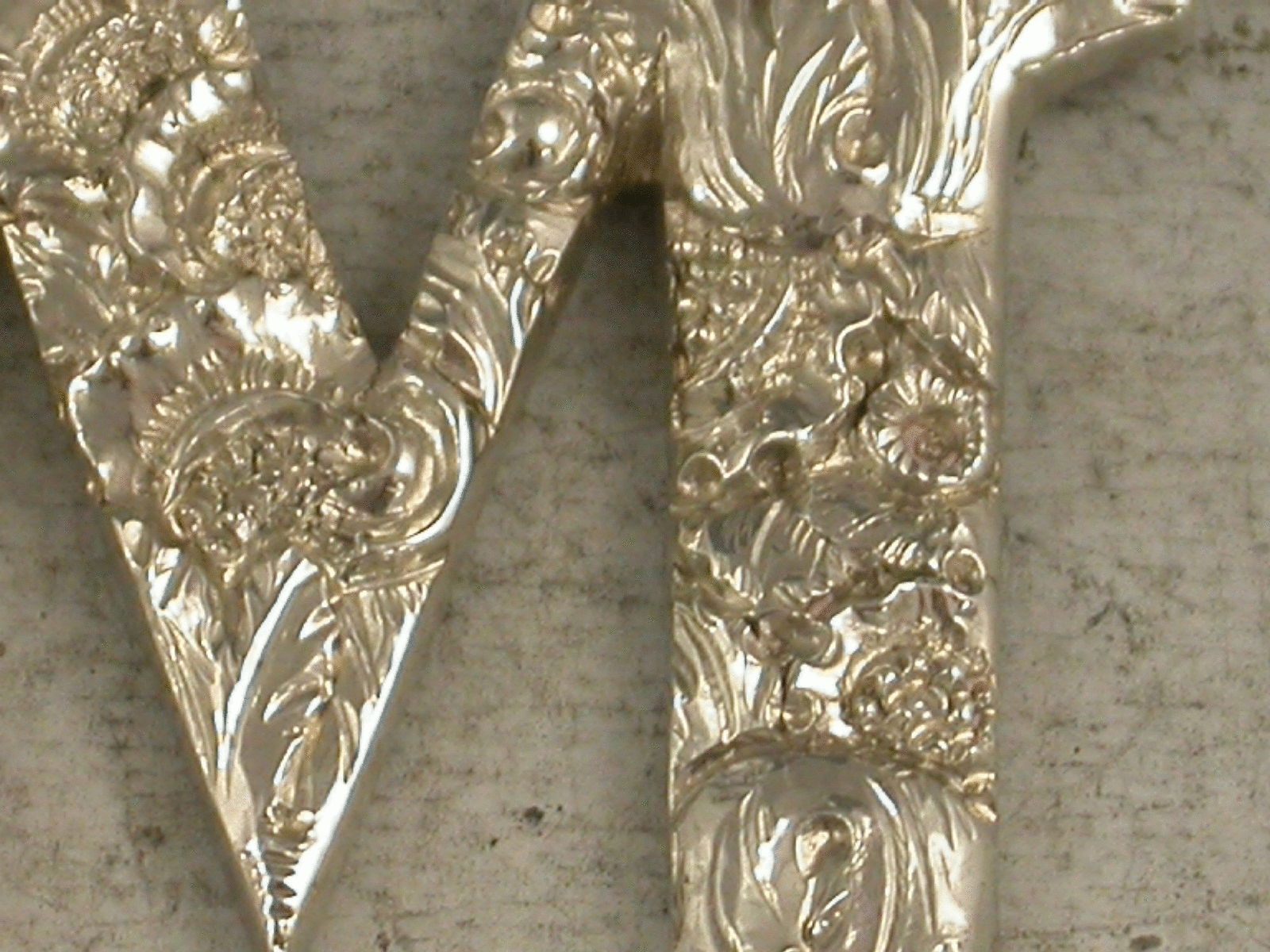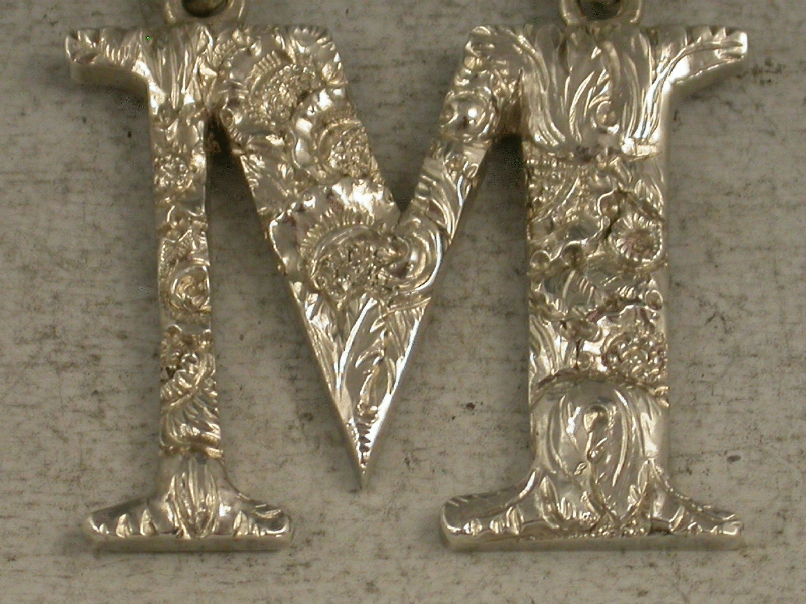 A good early Victorian cast silver Wine Label in the form of an initial letter ‘M’ (probably for Madeira), chased with flower heads and foliage.