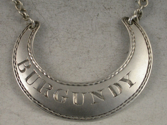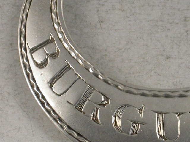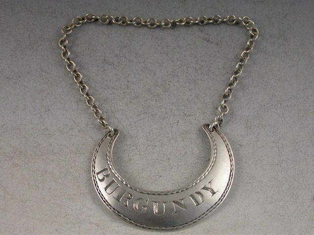 A rare 18th century Irish silver Wine Label of crescent form with bright cut wriggle work border, incised for BURGUNDY and typical of Irish labels, not centred.