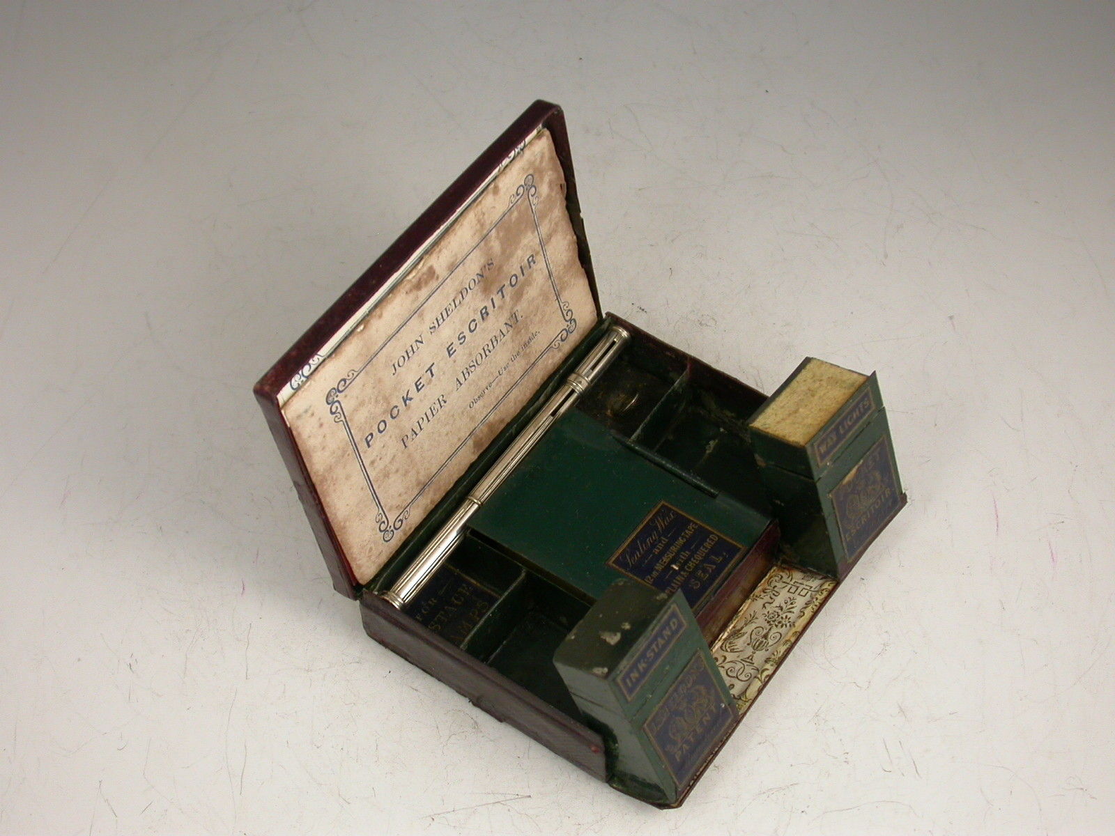 A rare leather cased metal Patent Pocket Escritoir, the tooled burgundy leather case with gilt lettering and the Royal Coat of Arms, a further outer case also with tooled gilt decoration. The lid with applied Sheldon Escritoir Almanack for 1845. The fitted interior with folding Inkstand and wax light containers, a folding taper stick, a hinged centre compartment with applied label containing sealing wax and a Sheldon's 12 inch measuring tape with plain and chequered seal, with further apertures for postage stamps, pens, gum or other wafer seals and the original Sheldon's German Silver combined Dip Pen / sprung coin and letter scale. Complete with original Blotting Card and instructions leaflet.