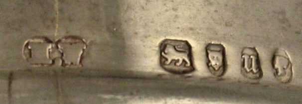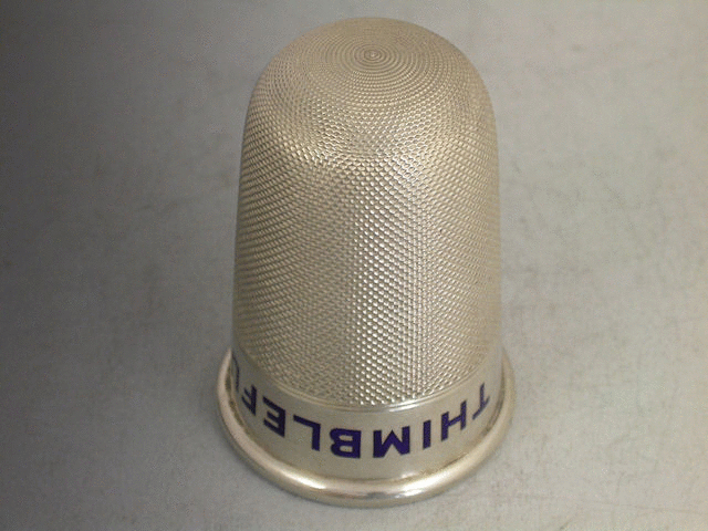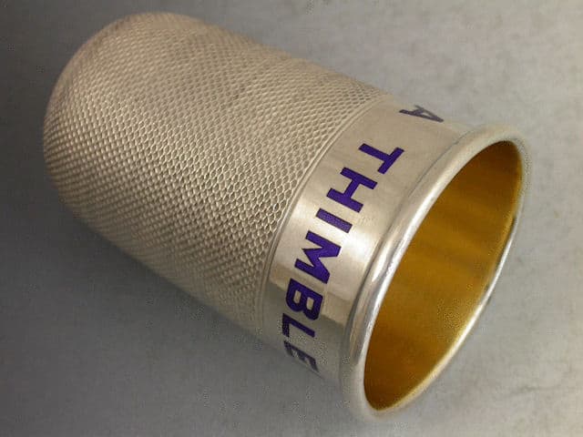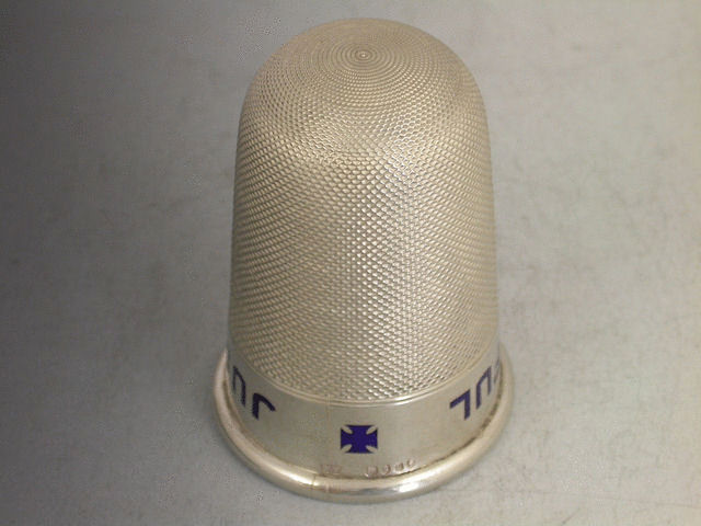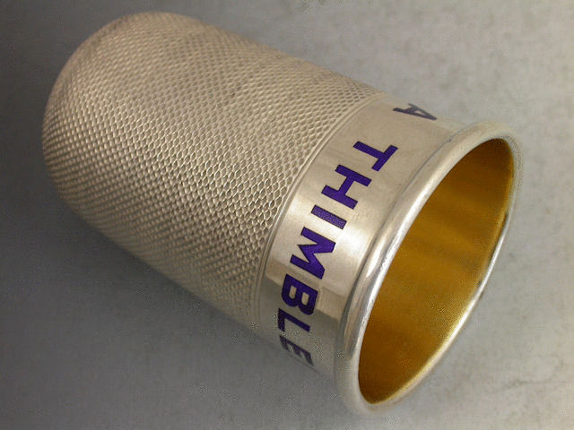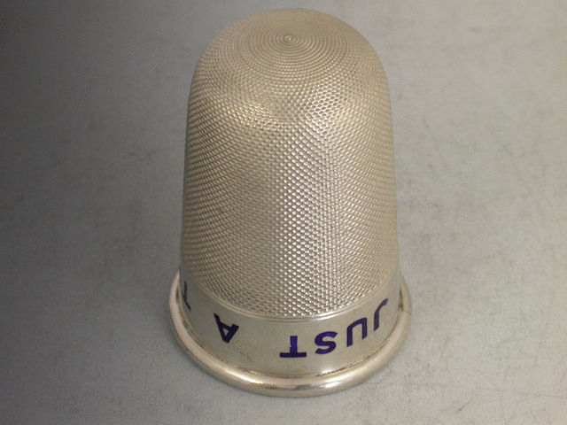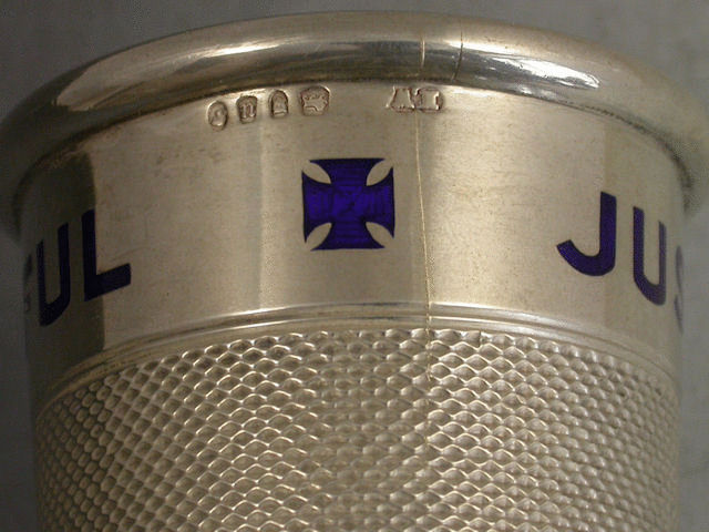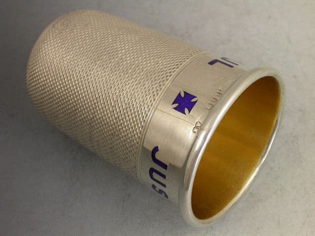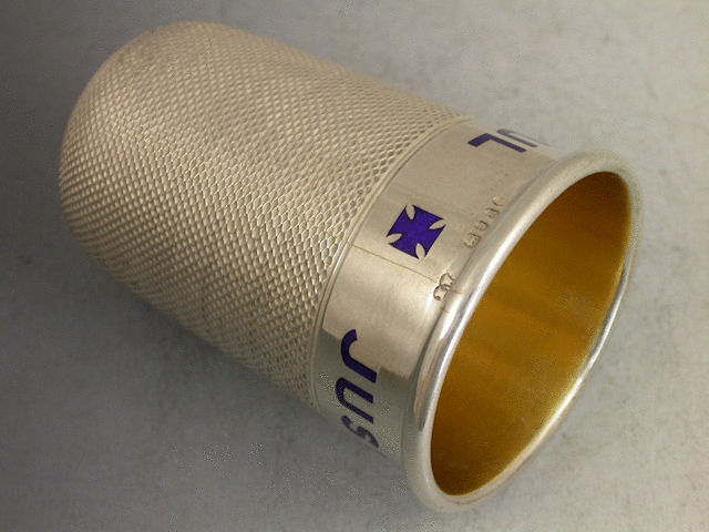 A rare Victorian Novelty silver and enamel ‘JUST A THIMBLEFUL’ Tot Cup, of good quality with pounced body and inset royal blue enamelling, silver gilt interior.