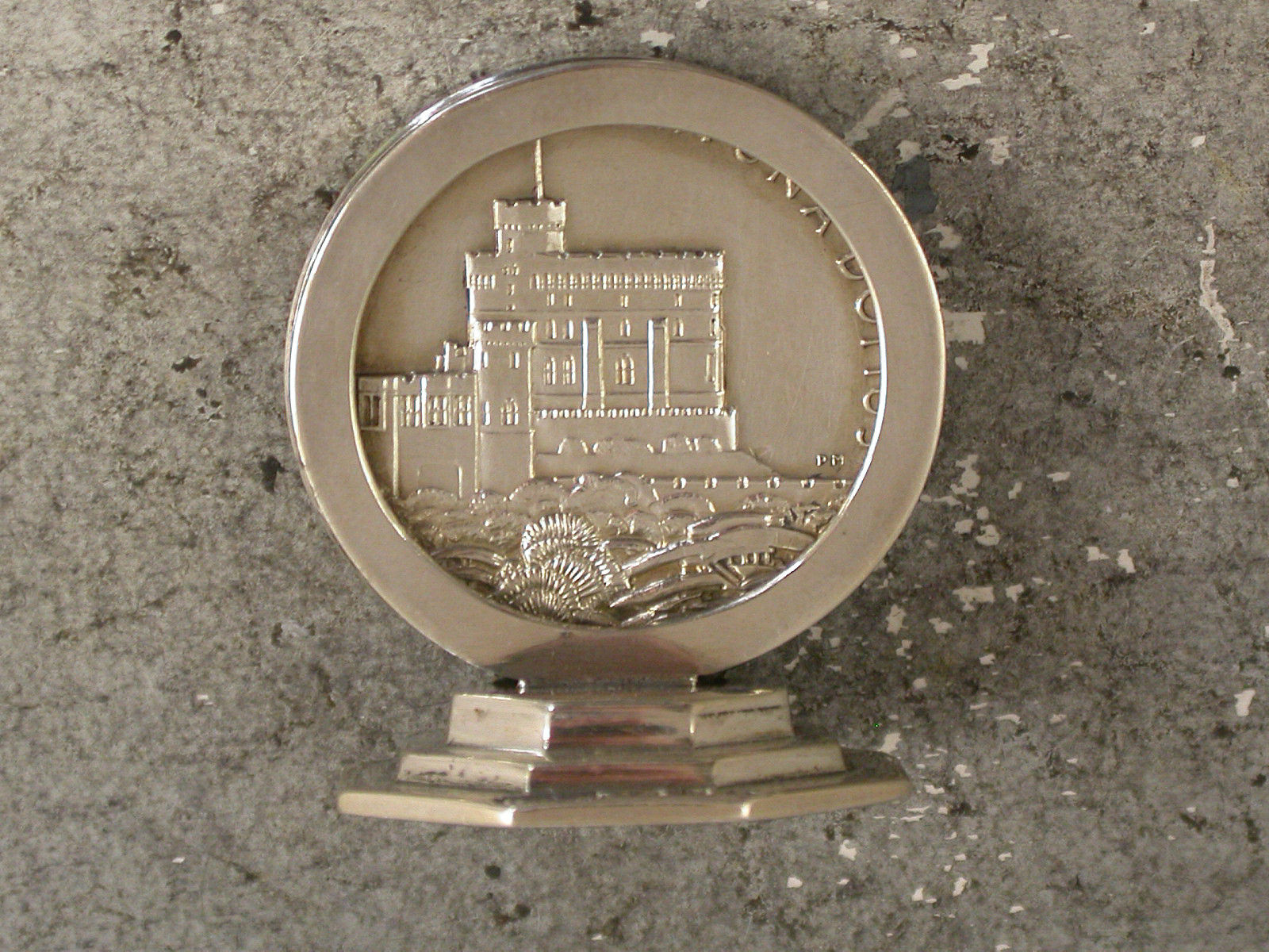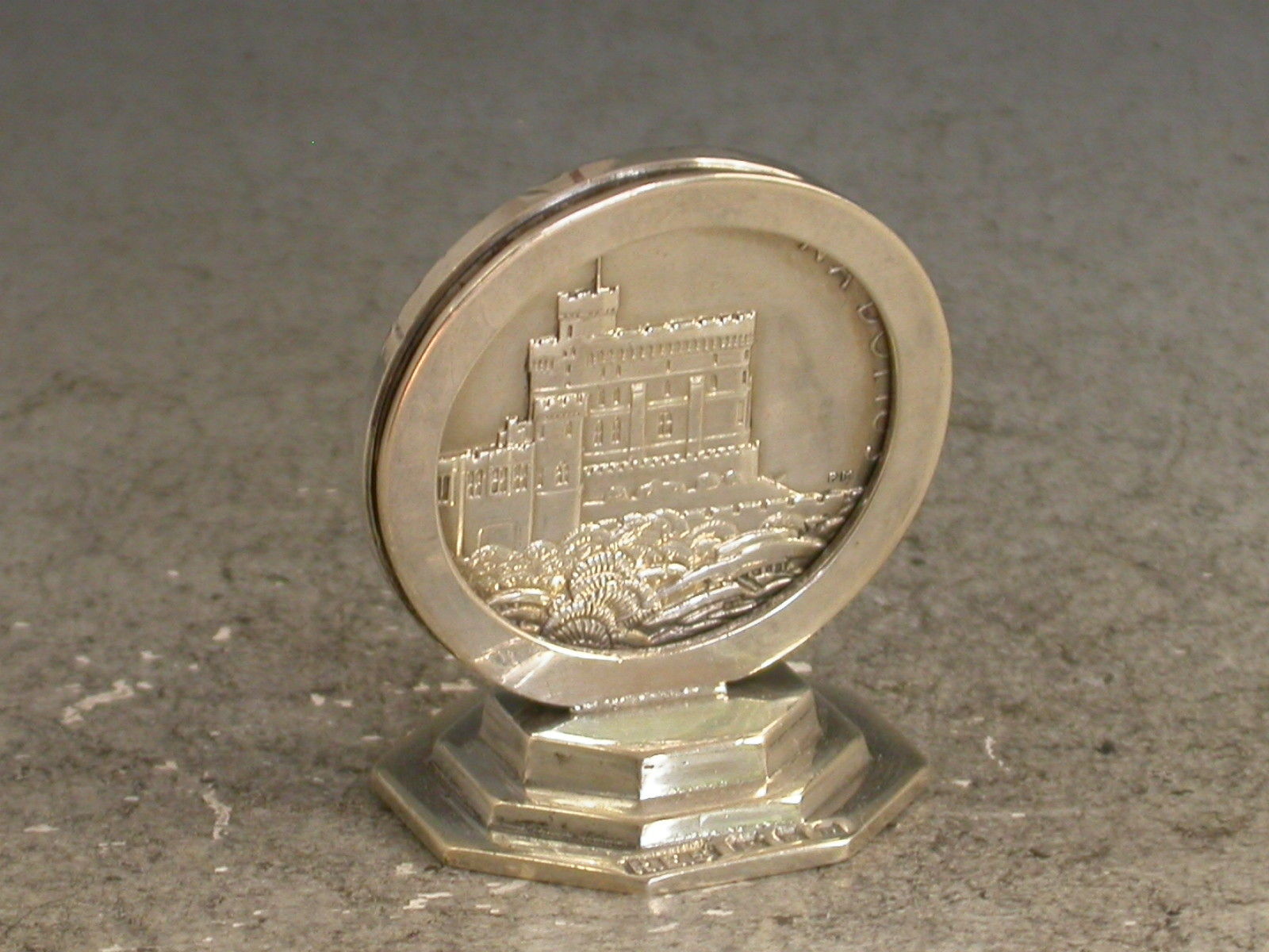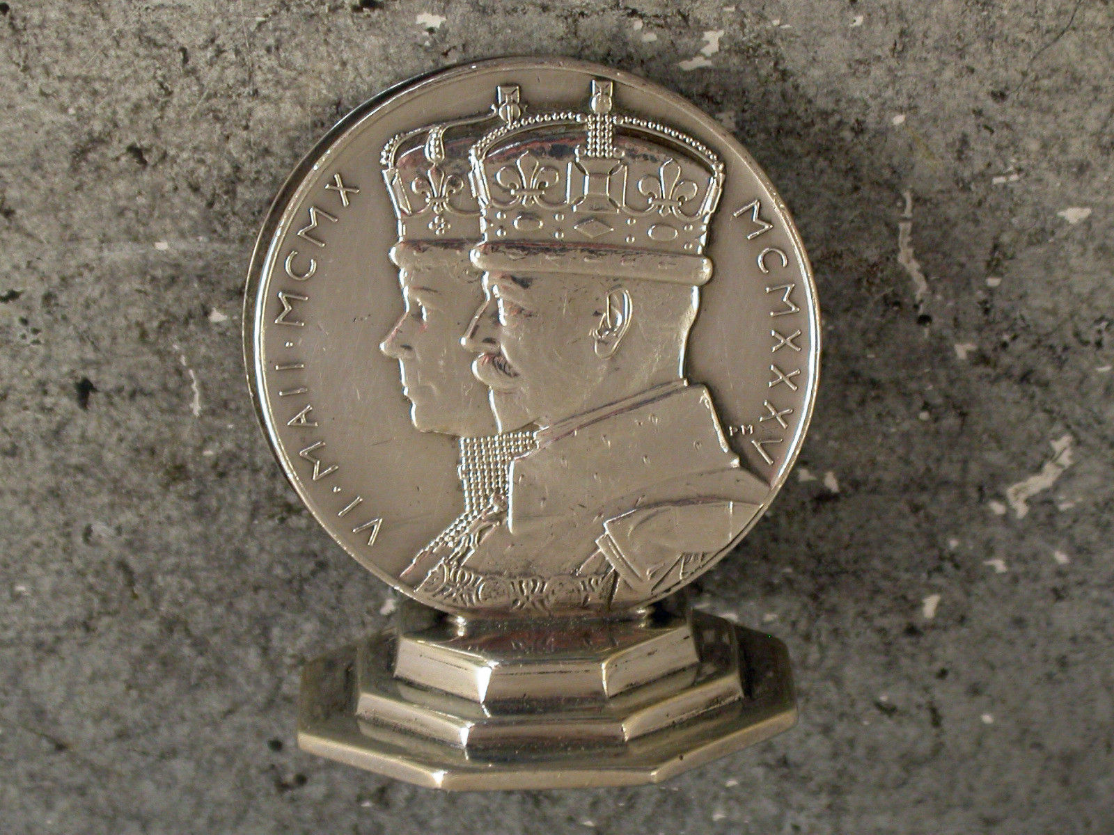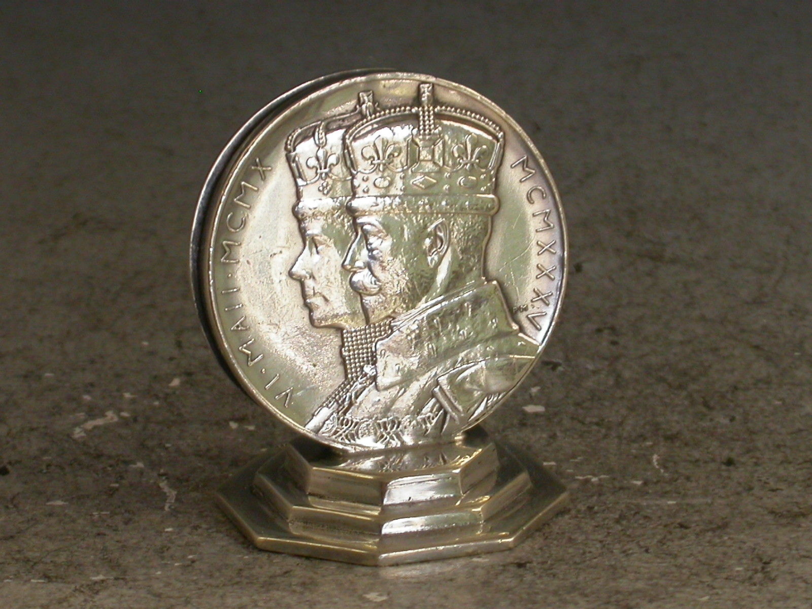 A George V silver Commemorative Menu Holder made from a silver Jubilee Medal set on an octagonal pedestal base. Made to celebrate the 25th Anniversary of the Coronation of King George V.