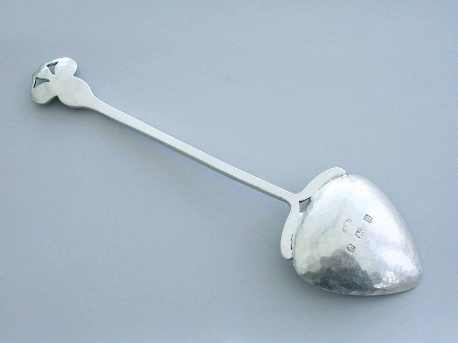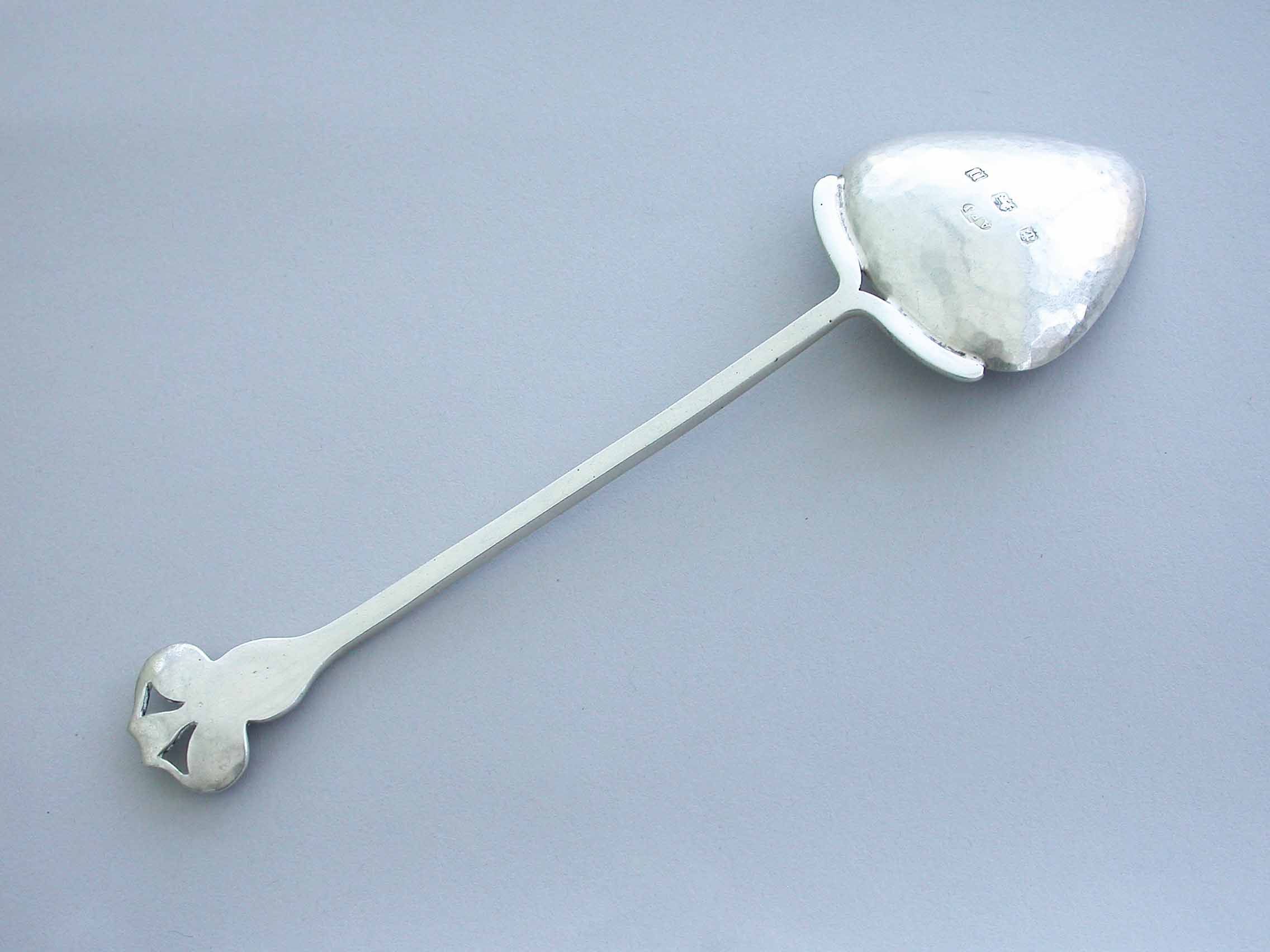 A large early 20th century Arts & Crafts hammered silver spoon, with triangular shaped bowl and pierced handle set with a cabochon Ruskin stone.