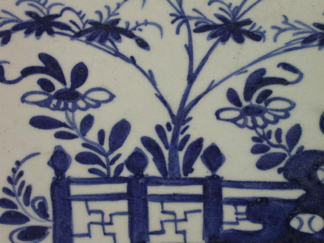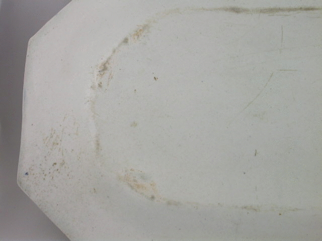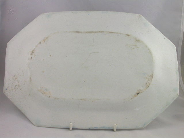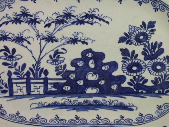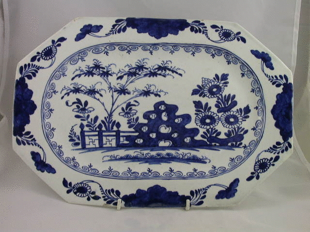 A very large Bow rectangular Serving Dish with cut corners, painted in underglaze blue with an oriental garden scene within a leaf and foliate border.