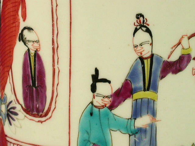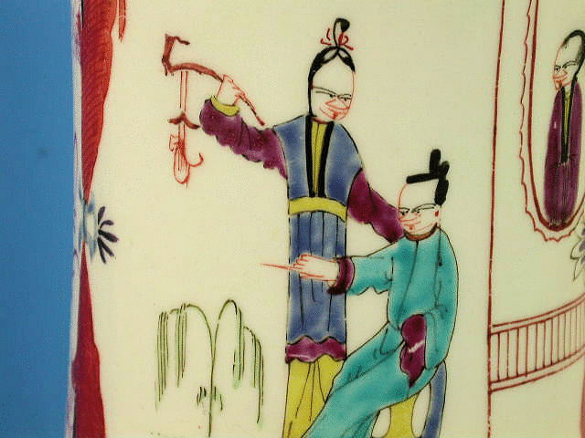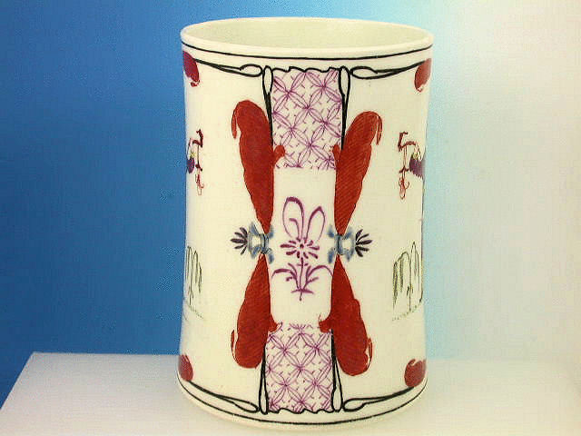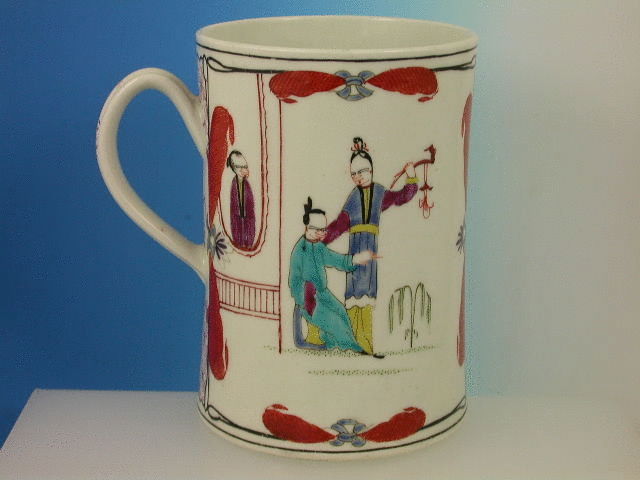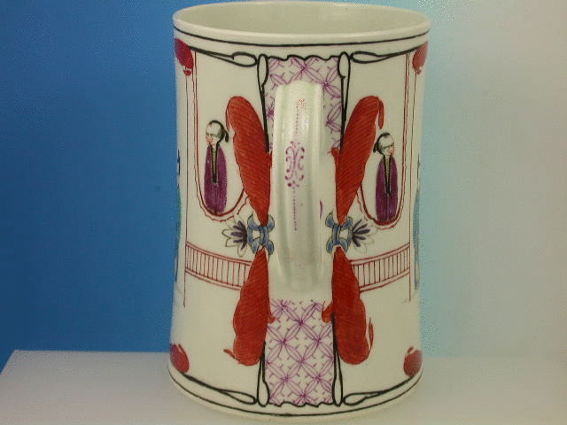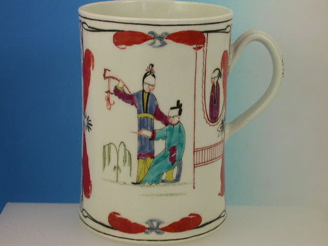 A fine large Dr Wall Worcester cylindrical Mug with grooved strap handle, painted in the Chinese manner with panels of upright figures enclosed within drapes and alternate panels of puce cross hatched floral decoration, black line rims to all the panels.