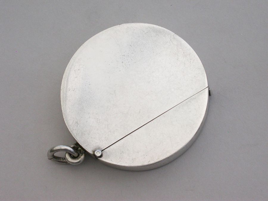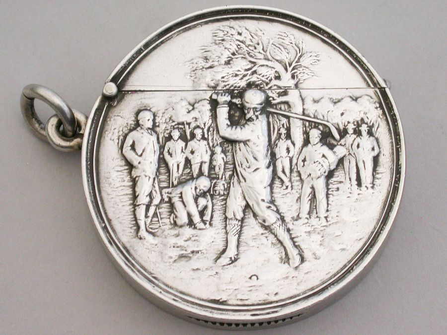 A large Edwardian circular silver Vesta Case with hinged flip-top lid, the face die-struck with a golfing scene. A striker to the base and attached suspension ring.