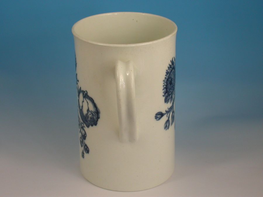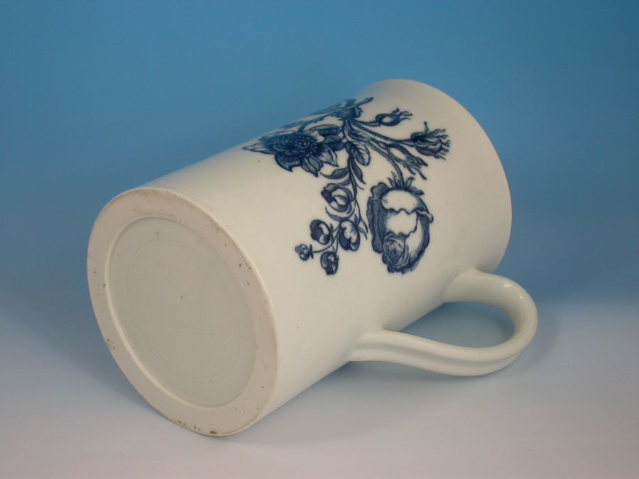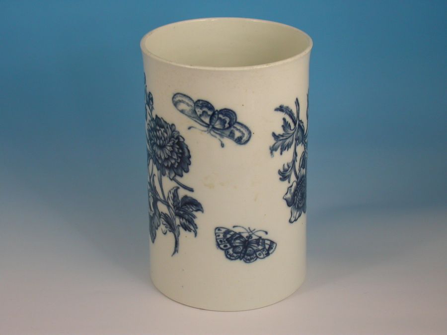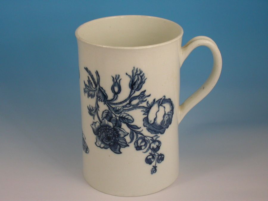 A fine large First Period Worcester cylindrical Mug with grooved strap handle, printed in under-glaze blue with 'The Natural Sprays Group'. IIC7 in BFS