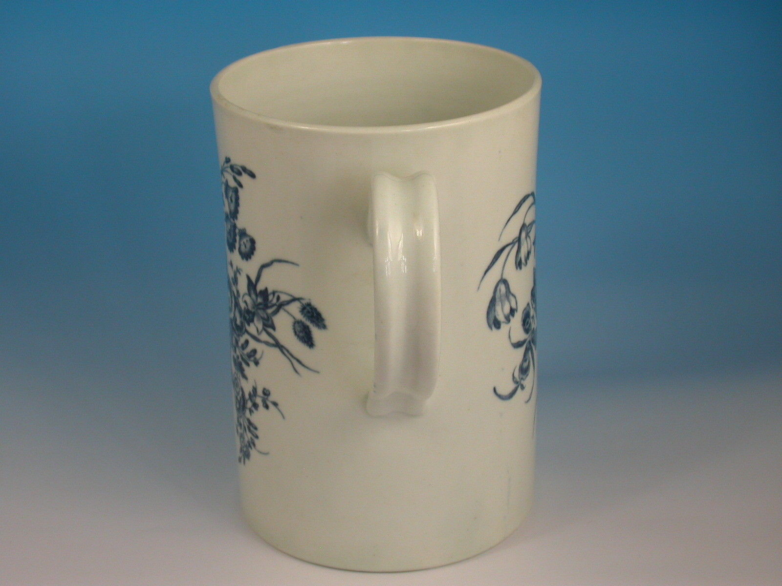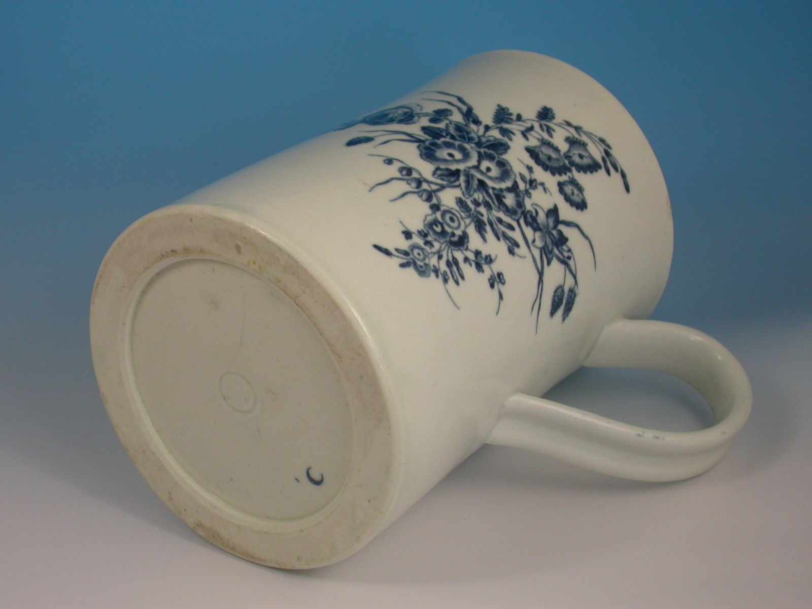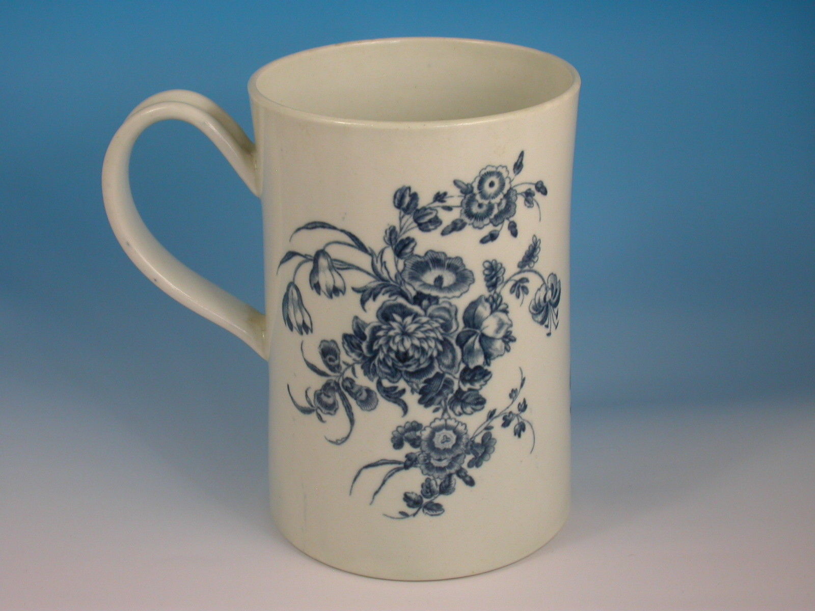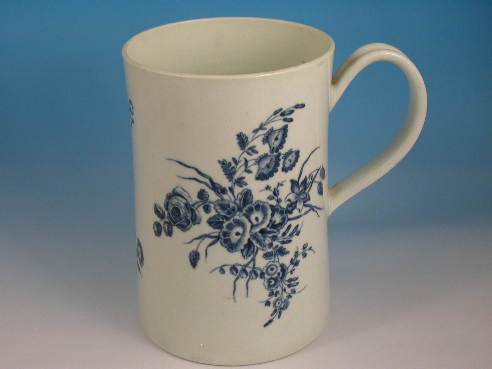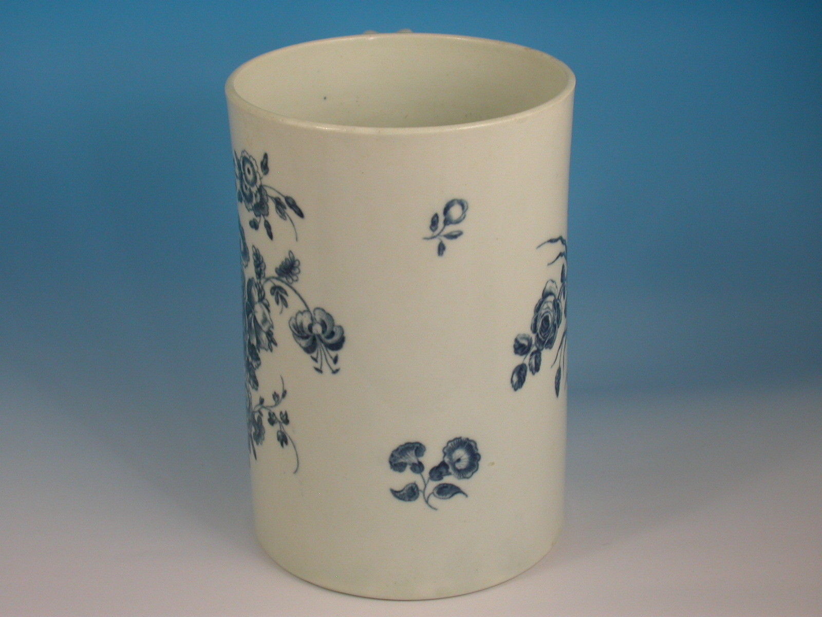 A fine large First Period Worcester flared cylindrical Mug with grooved strap handle, printed in under-glaze blue with a variant of the 'Rose and Chrysanthemum Spray Group' (IIC9 in BFS).