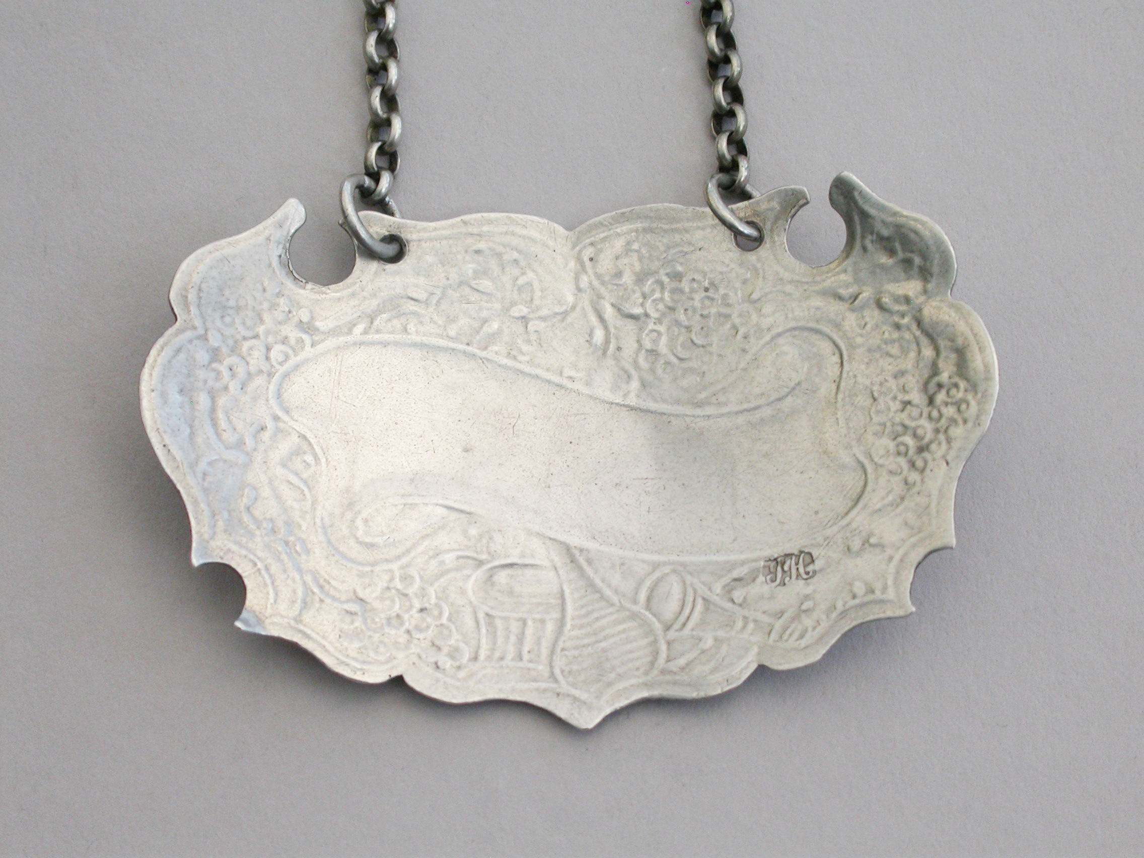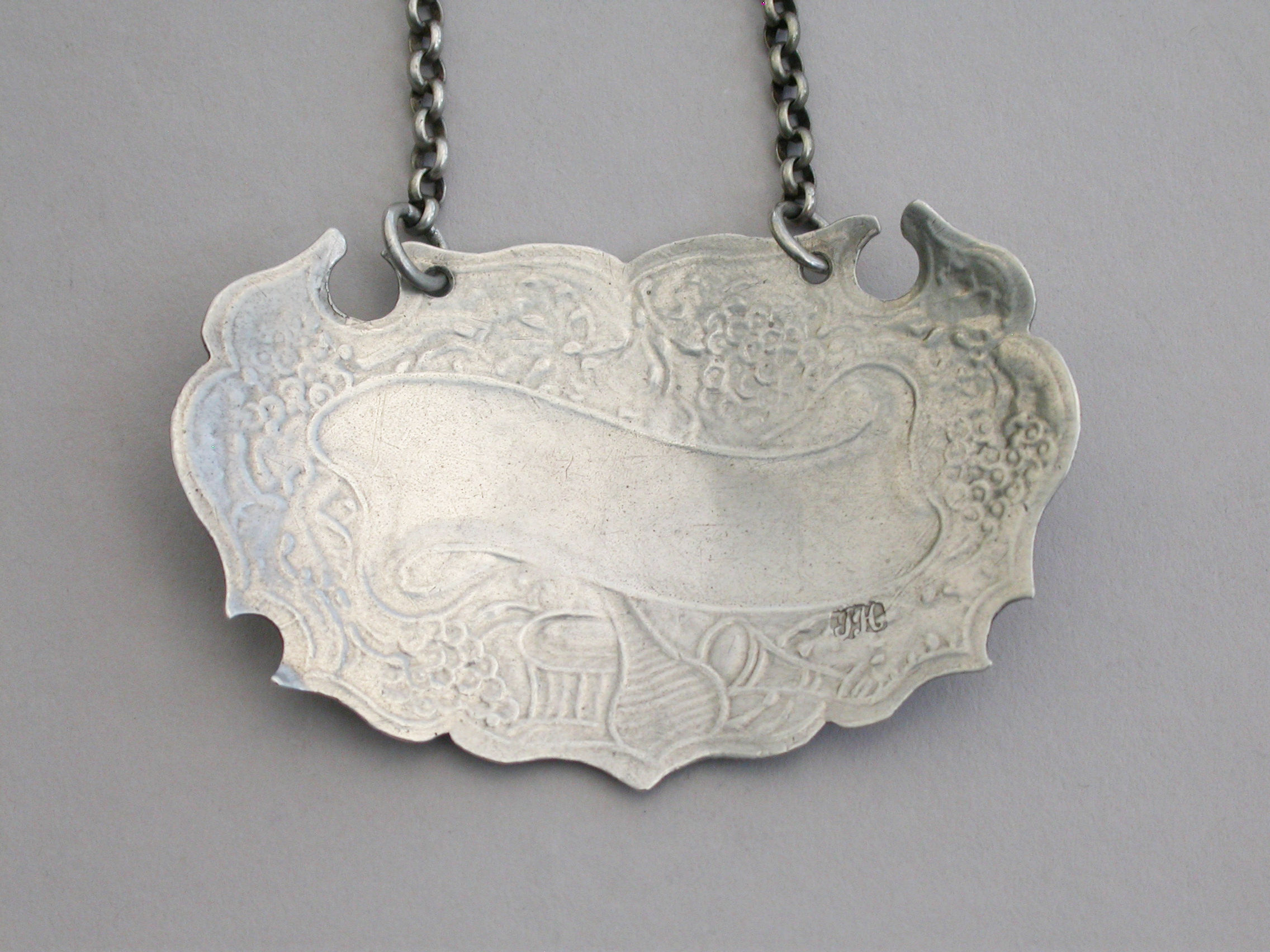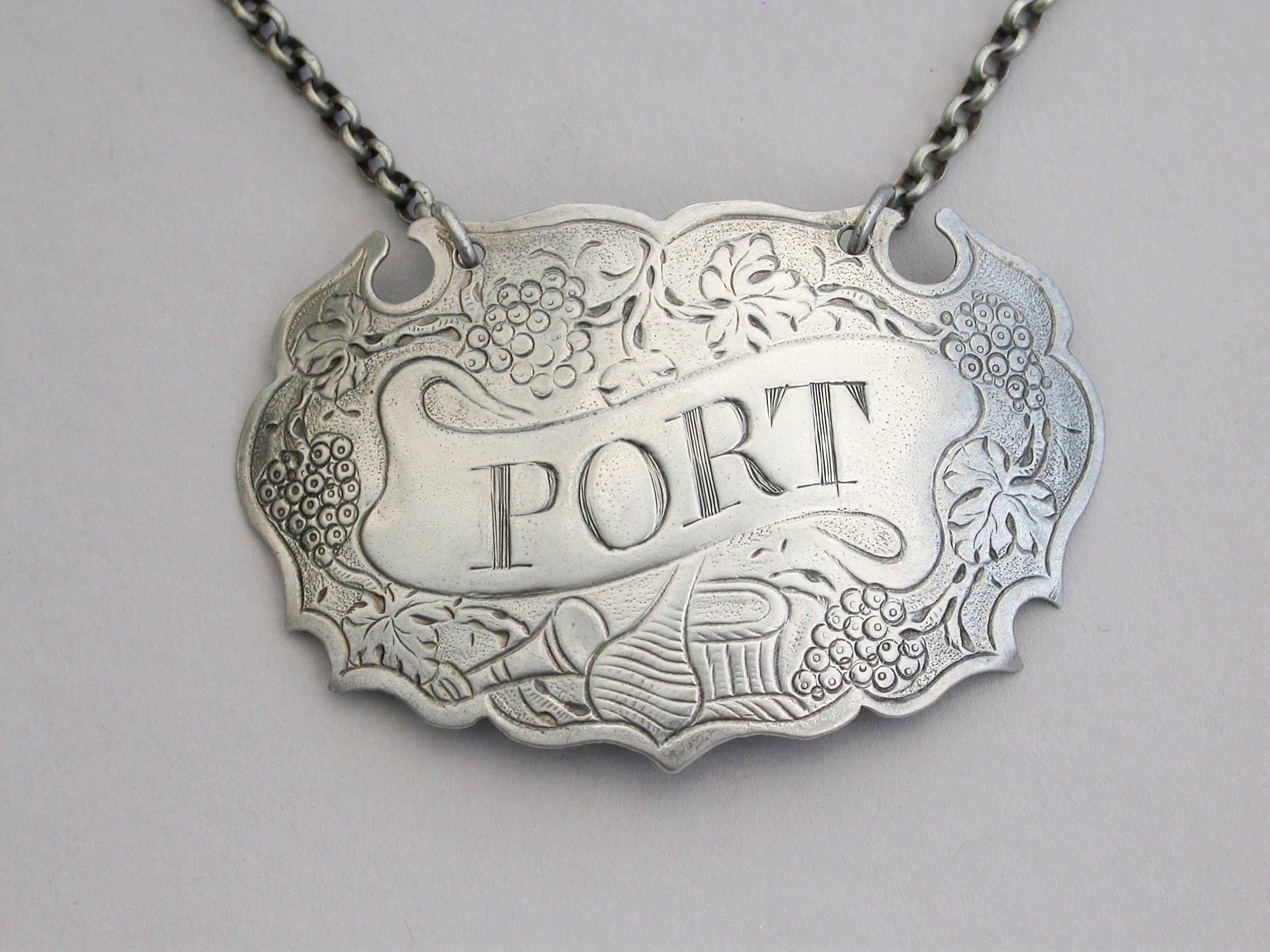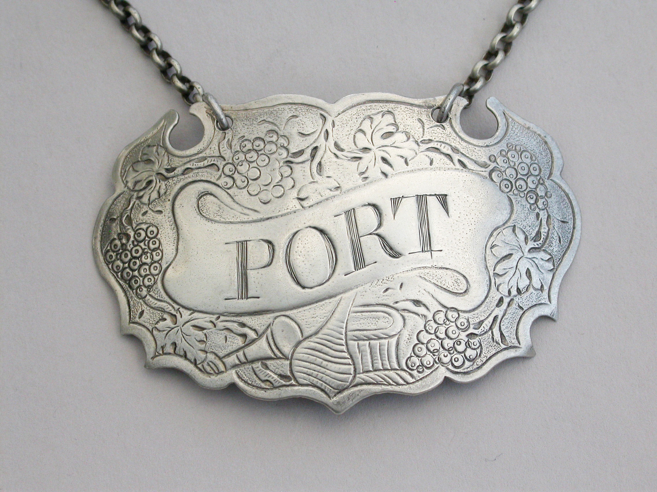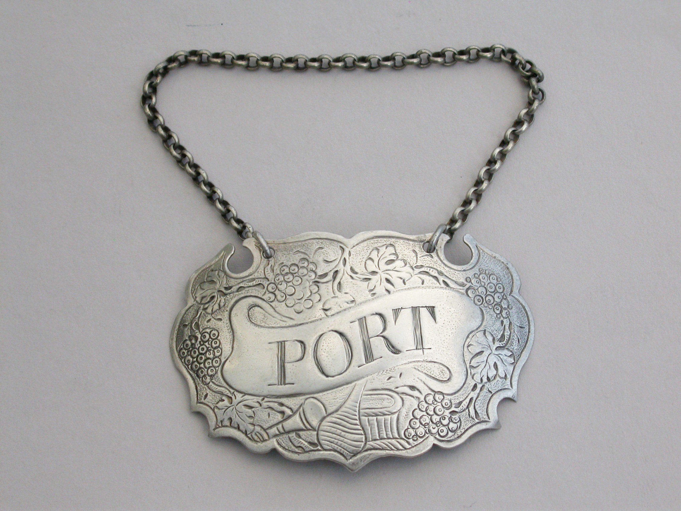 A rare and unusual large George II silver Wine Label of chased escutcheon form with fruiting vine border, incised for Port on a scrolling name plate, a wine glass, a bottle and a basket below. A very unusual variant of an early chased escutcheon and one from the only known set of four(see literature).