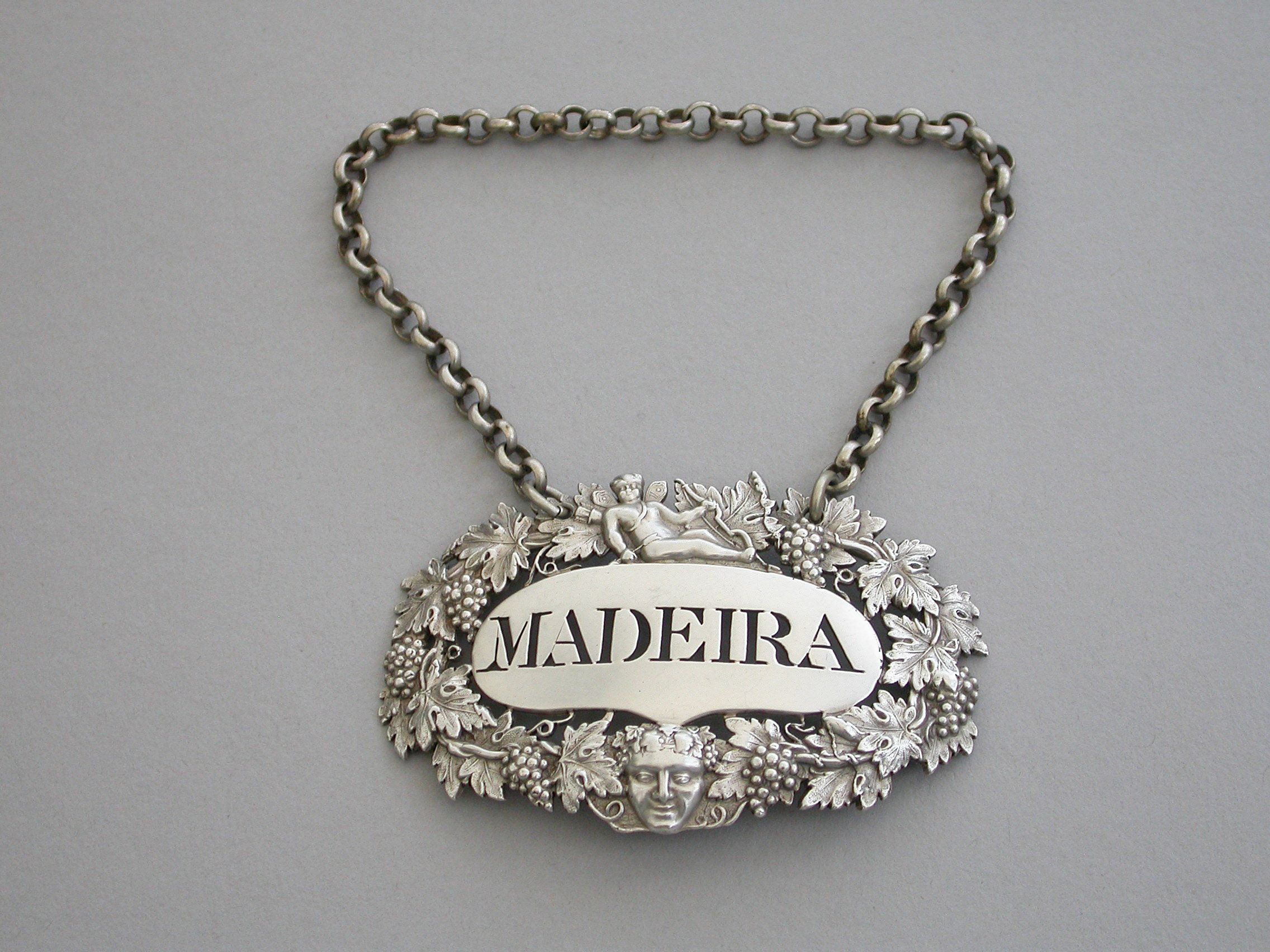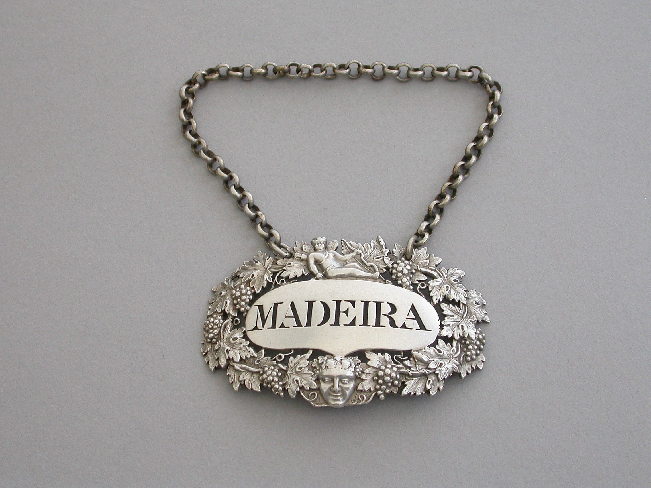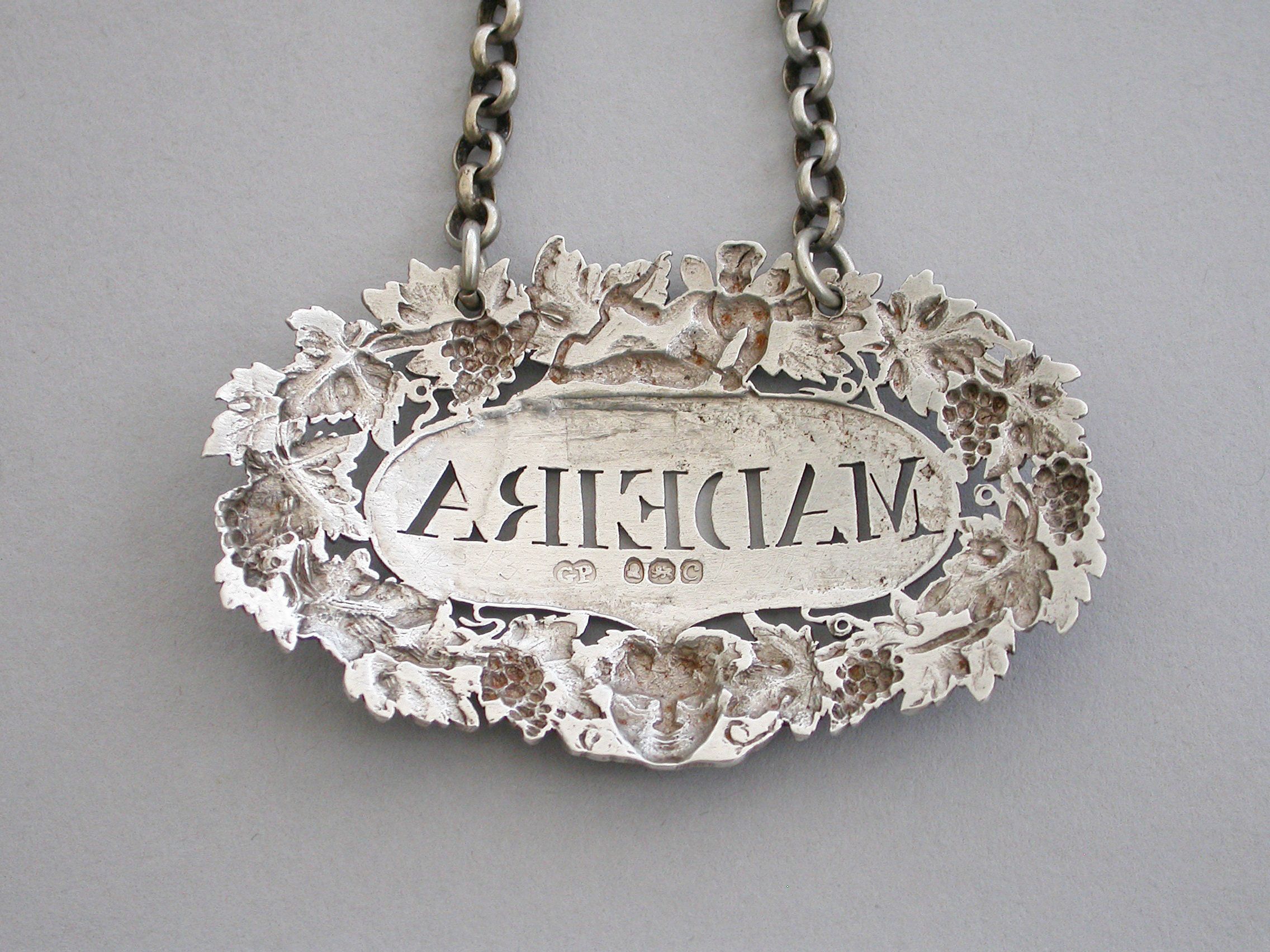 A good George III cast silver Wine Label of large pierced oval form with border of vine leaves and grapes, a reclining cupid with bow and arrows above and Bacchus mask below the shaped name plate pierced for Madeira.