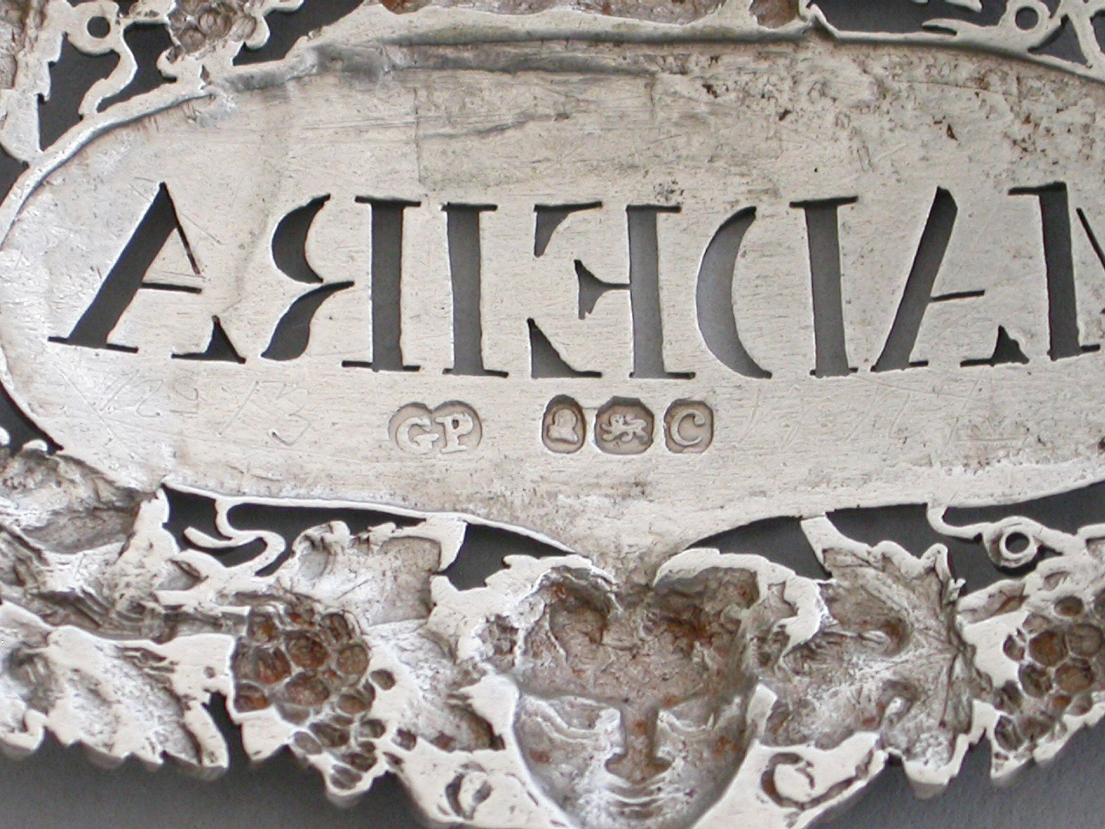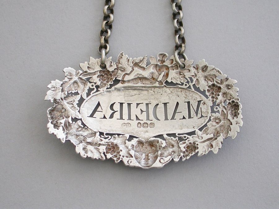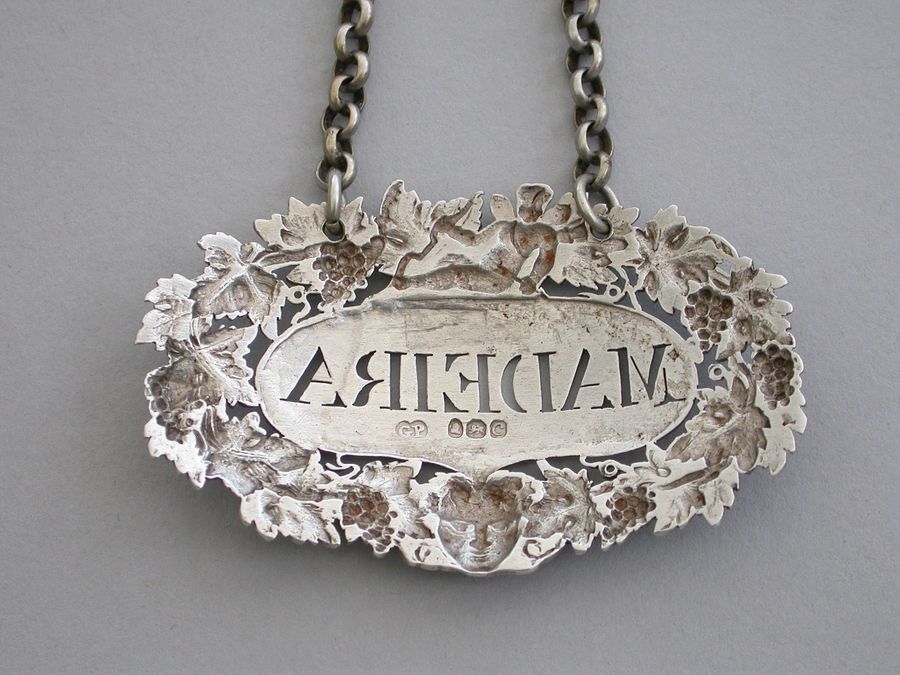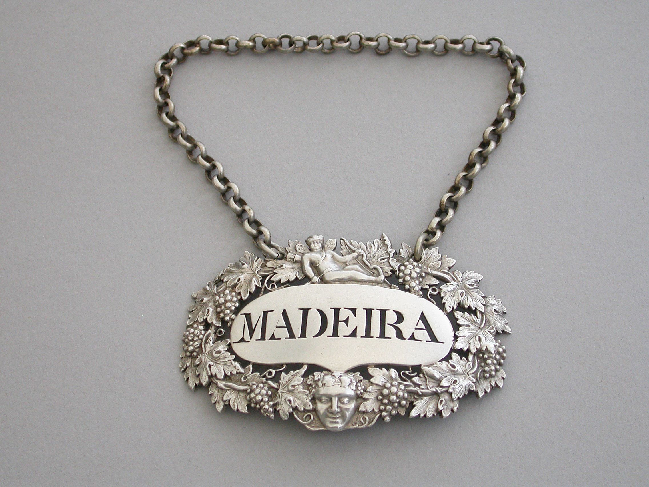 A good George III cast silver Wine Label of large pierced oval form with border of vine leaves and grapes, a reclining cupid with bow and arrows above and Bacchus mask below the shaped name plate pierced for Madeira.