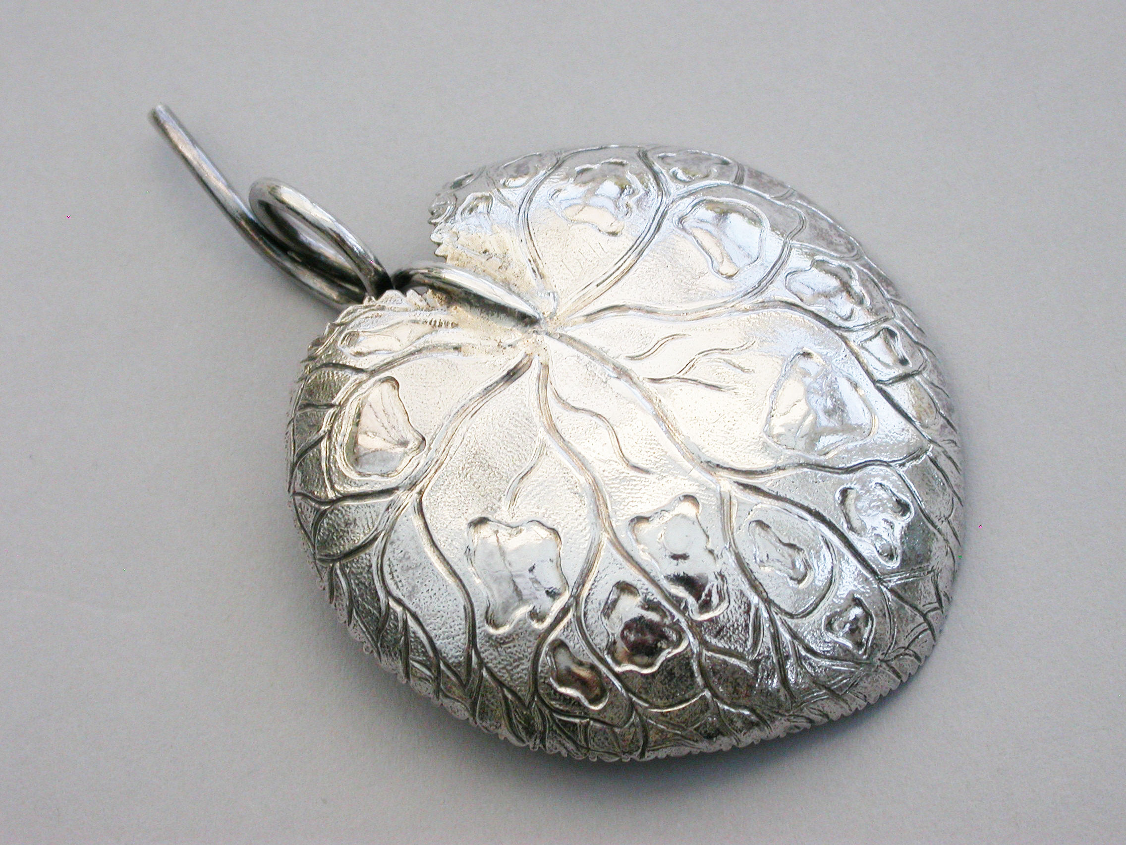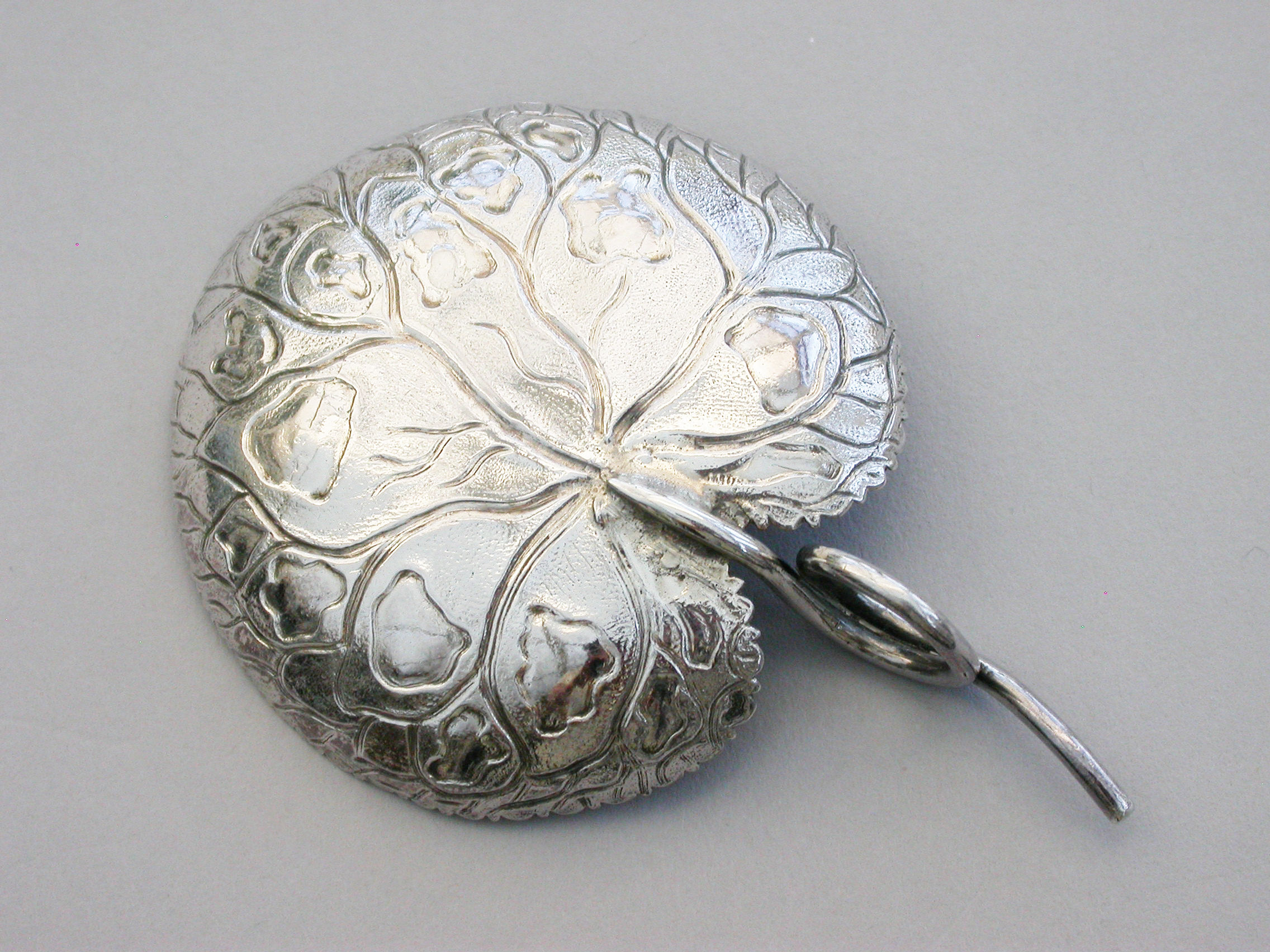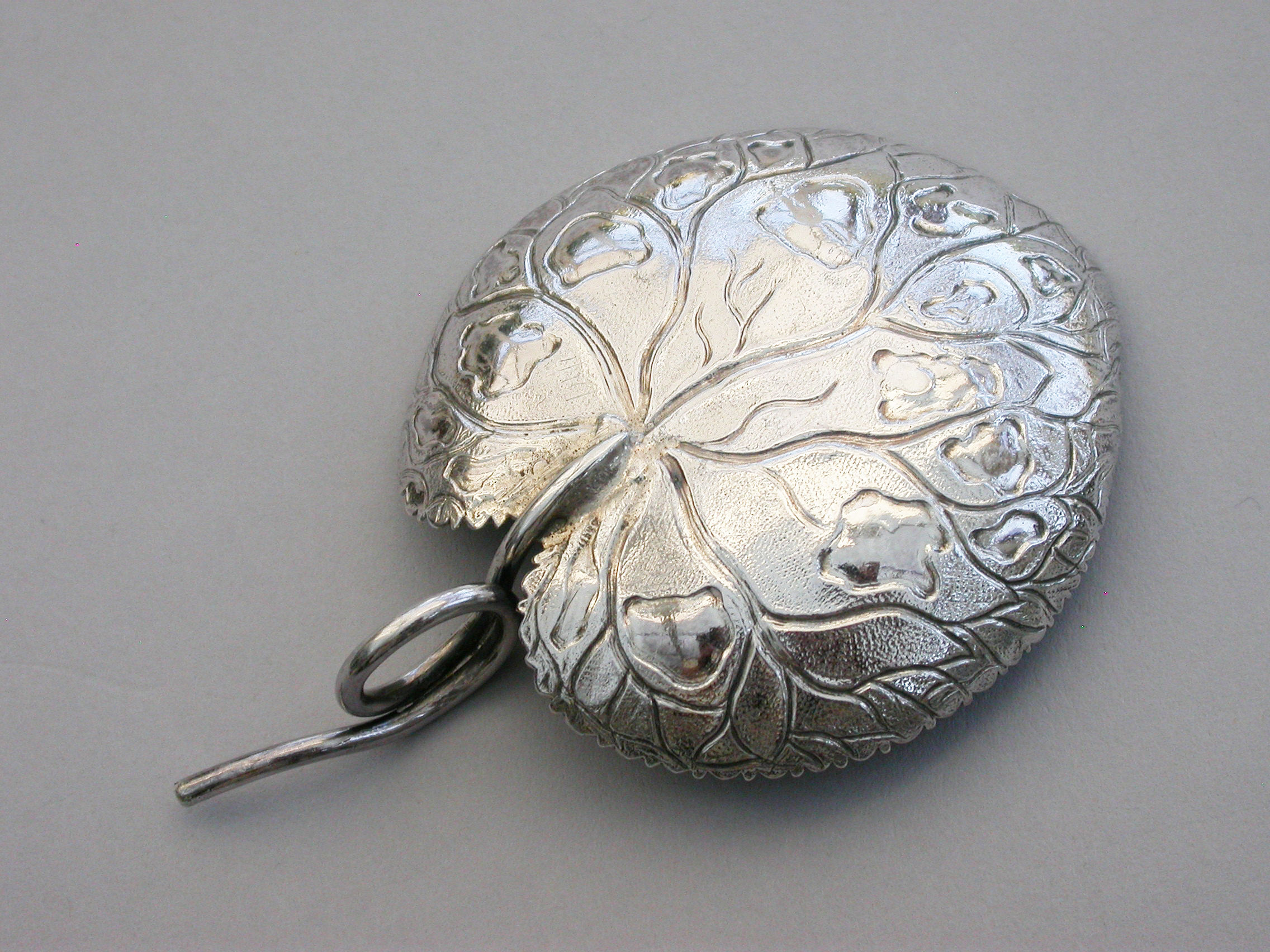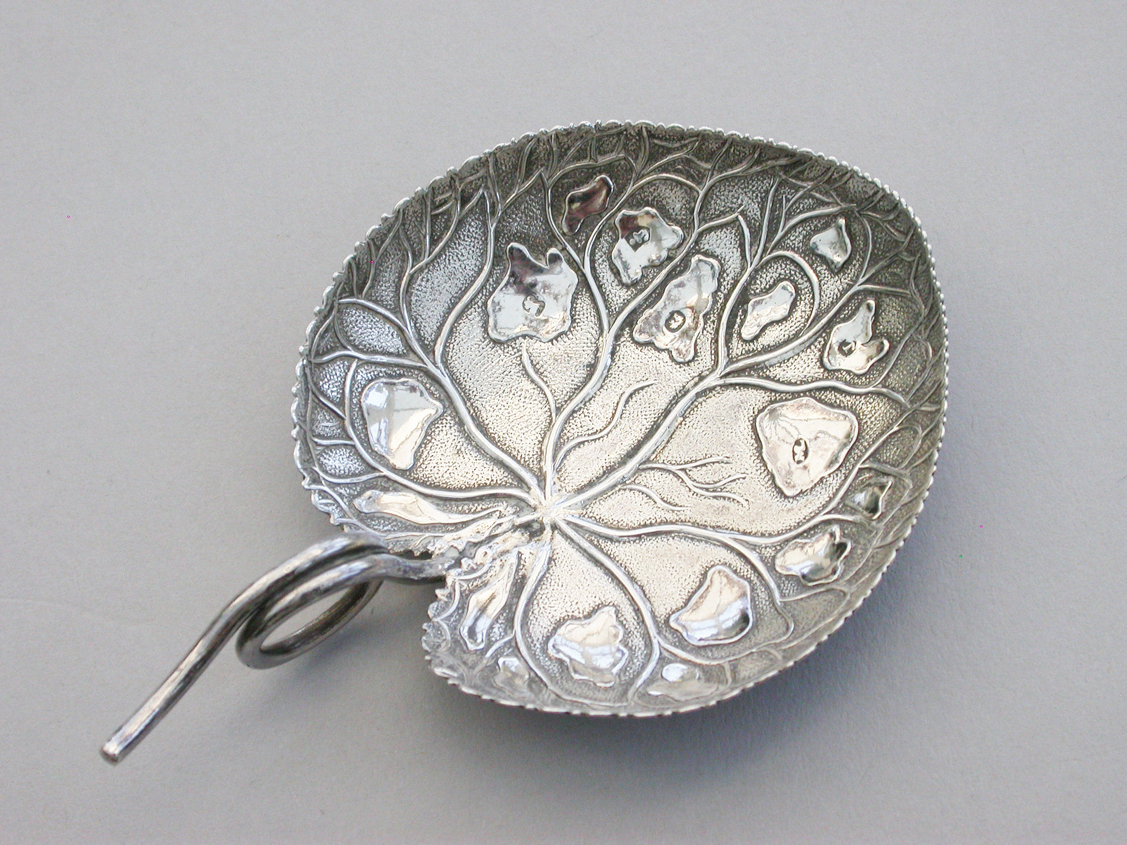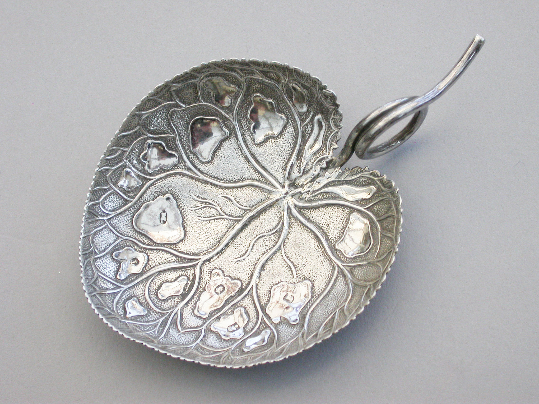 An extremely rare George III silver Caddy Spoon with looped tendril handle, the die-stamped bowl in the form of a lily leaf with serrated border and a matt background.