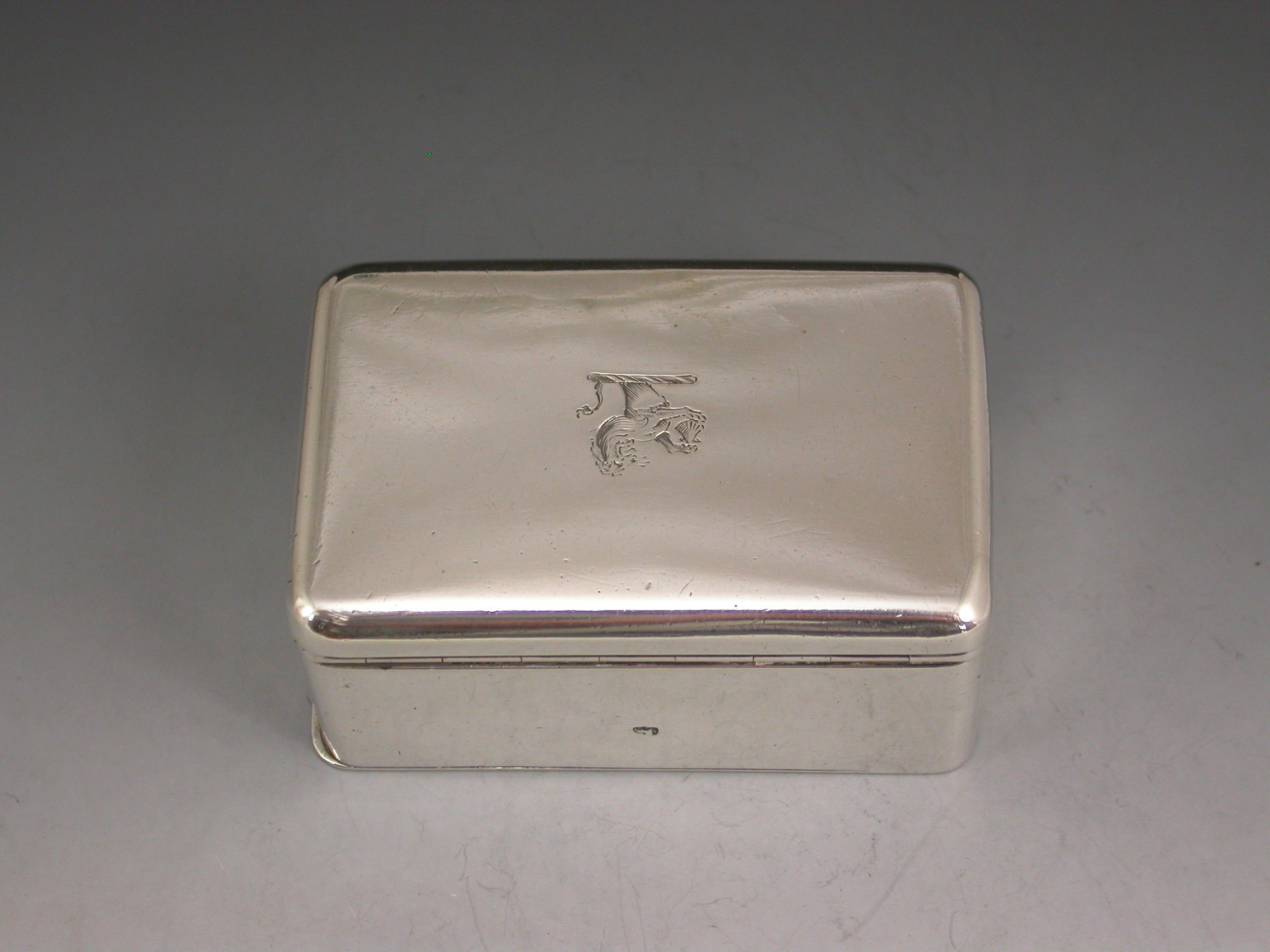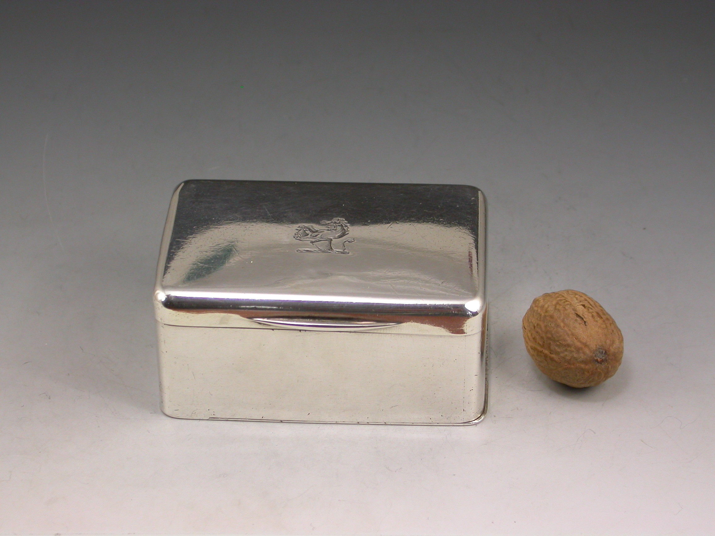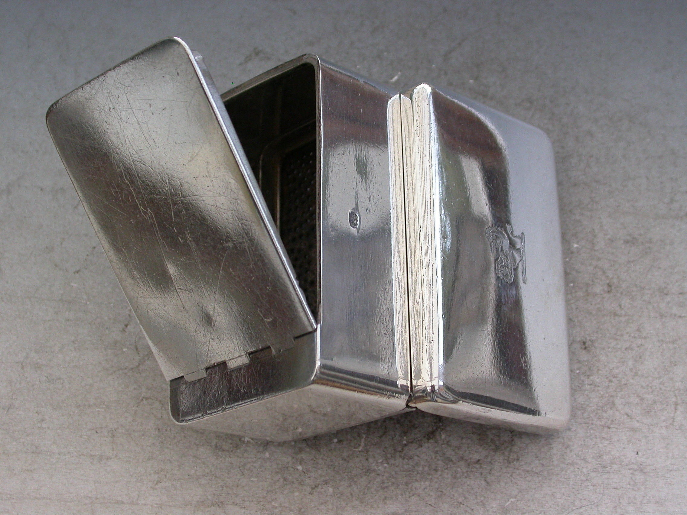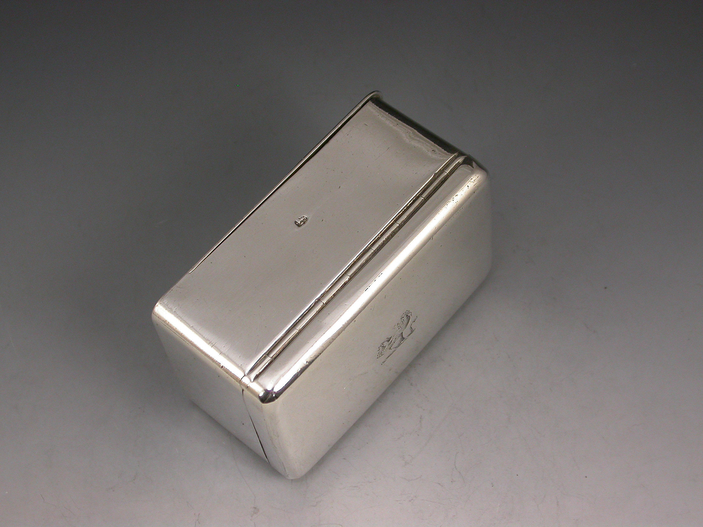 A huge George III silver Nutmeg Grater of plain rounded rectangular form, the hinged cover engraved with a crest depicting a demi-lion holding a scallop shell, the interior with original pierced steel grater and the base with flat concealed hinge.