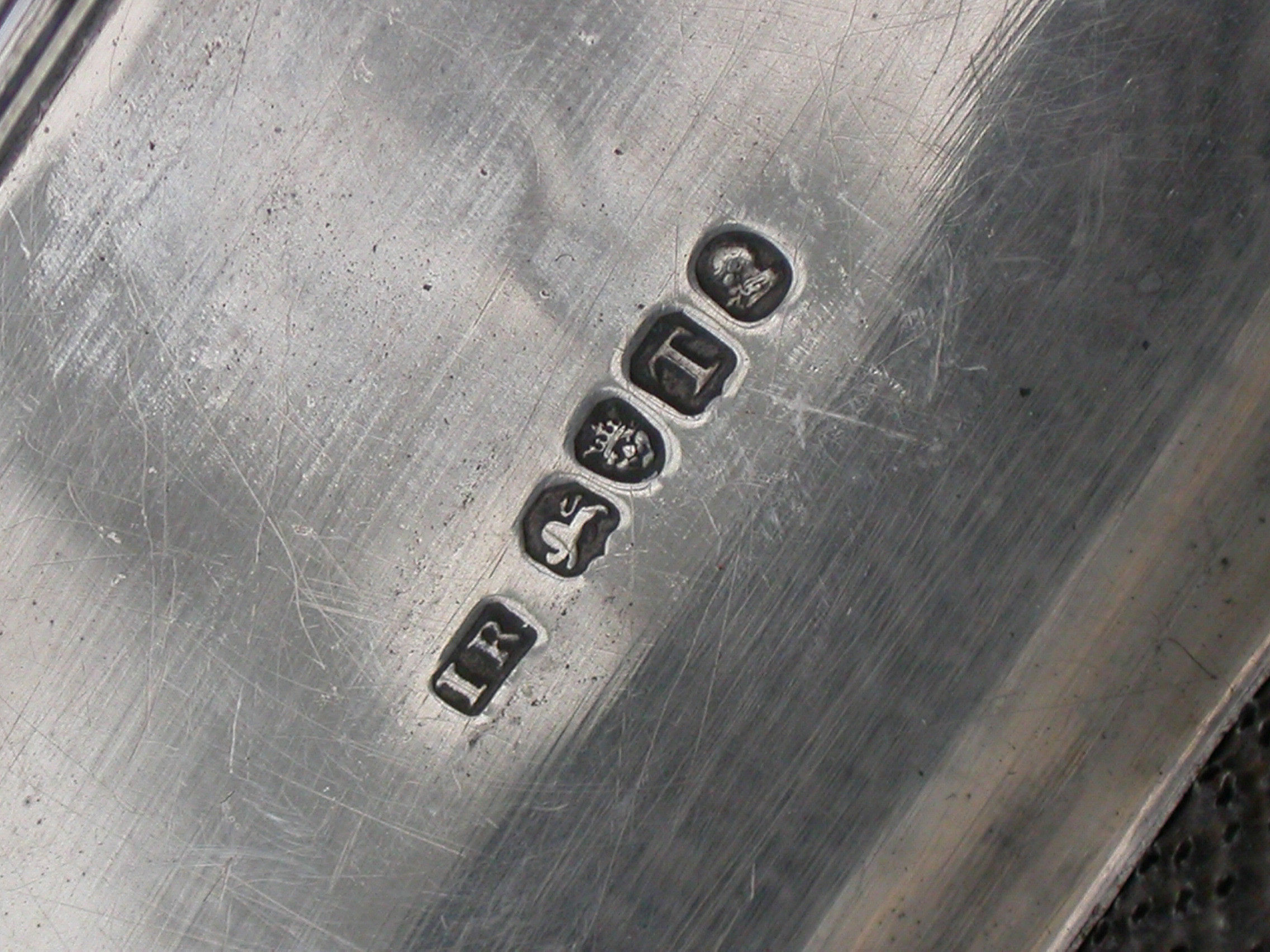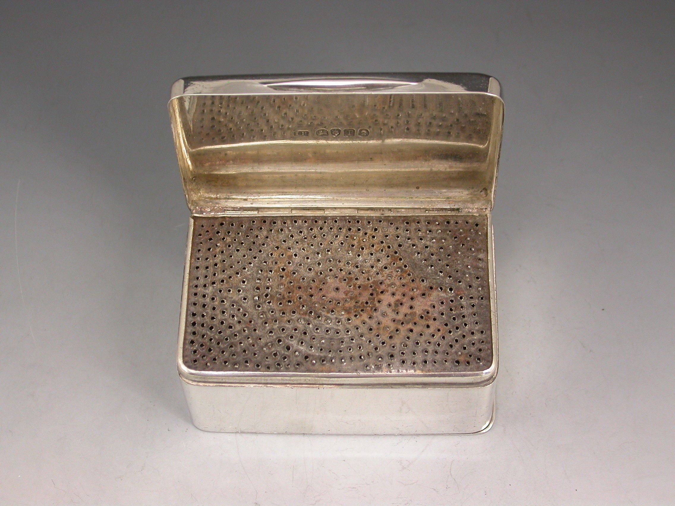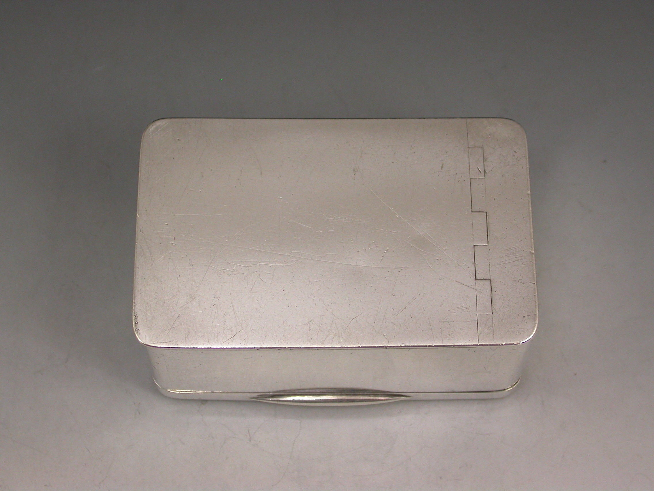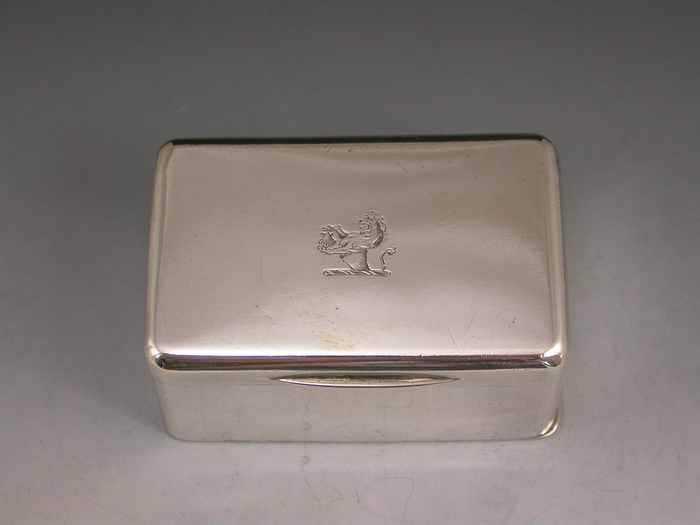A huge George III silver Nutmeg Grater of plain rounded rectangular form, the hinged cover engraved with a crest depicting a demi-lion holding a scallop shell, the interior with original pierced steel grater and the base with flat concealed hinge.