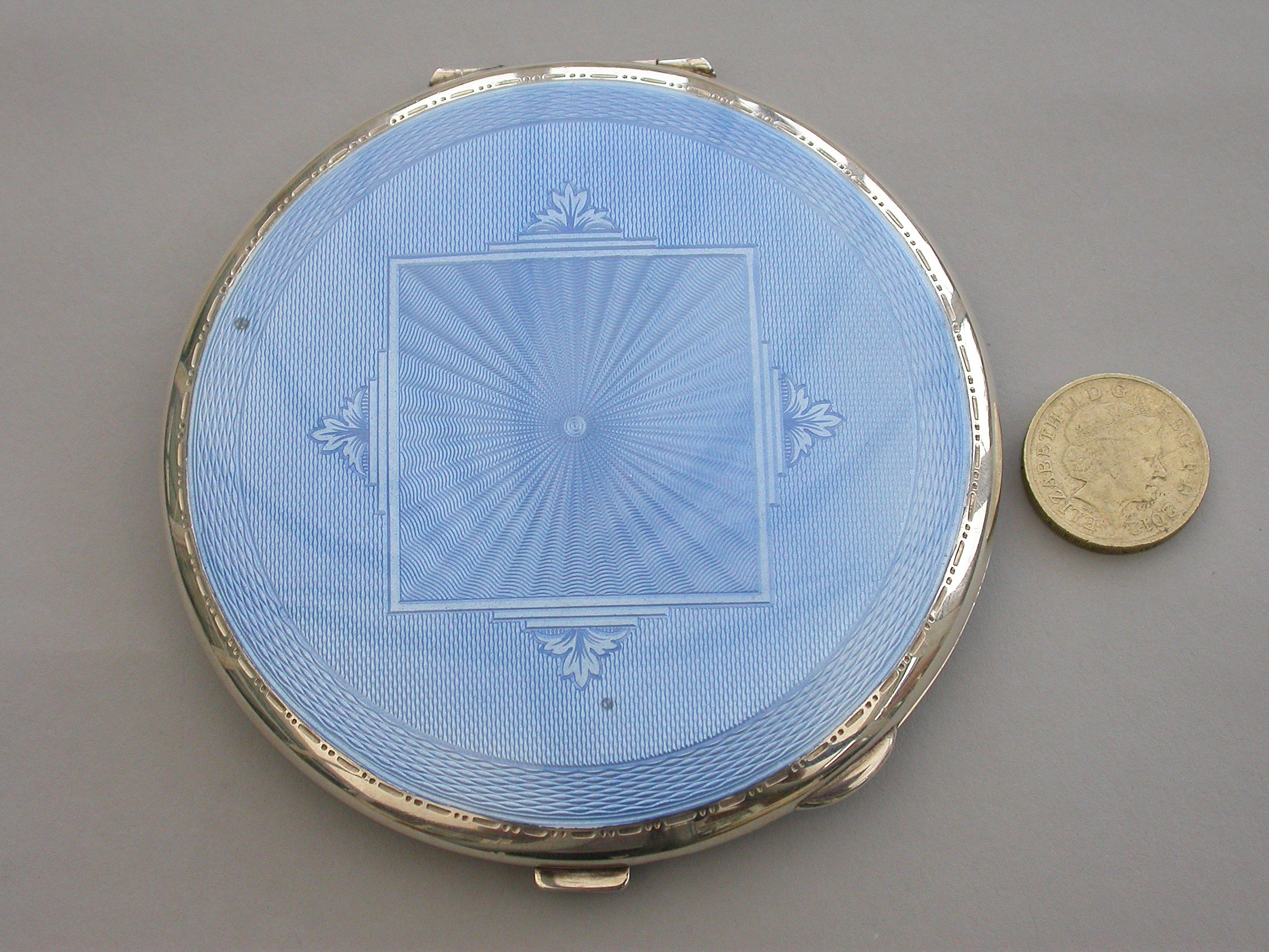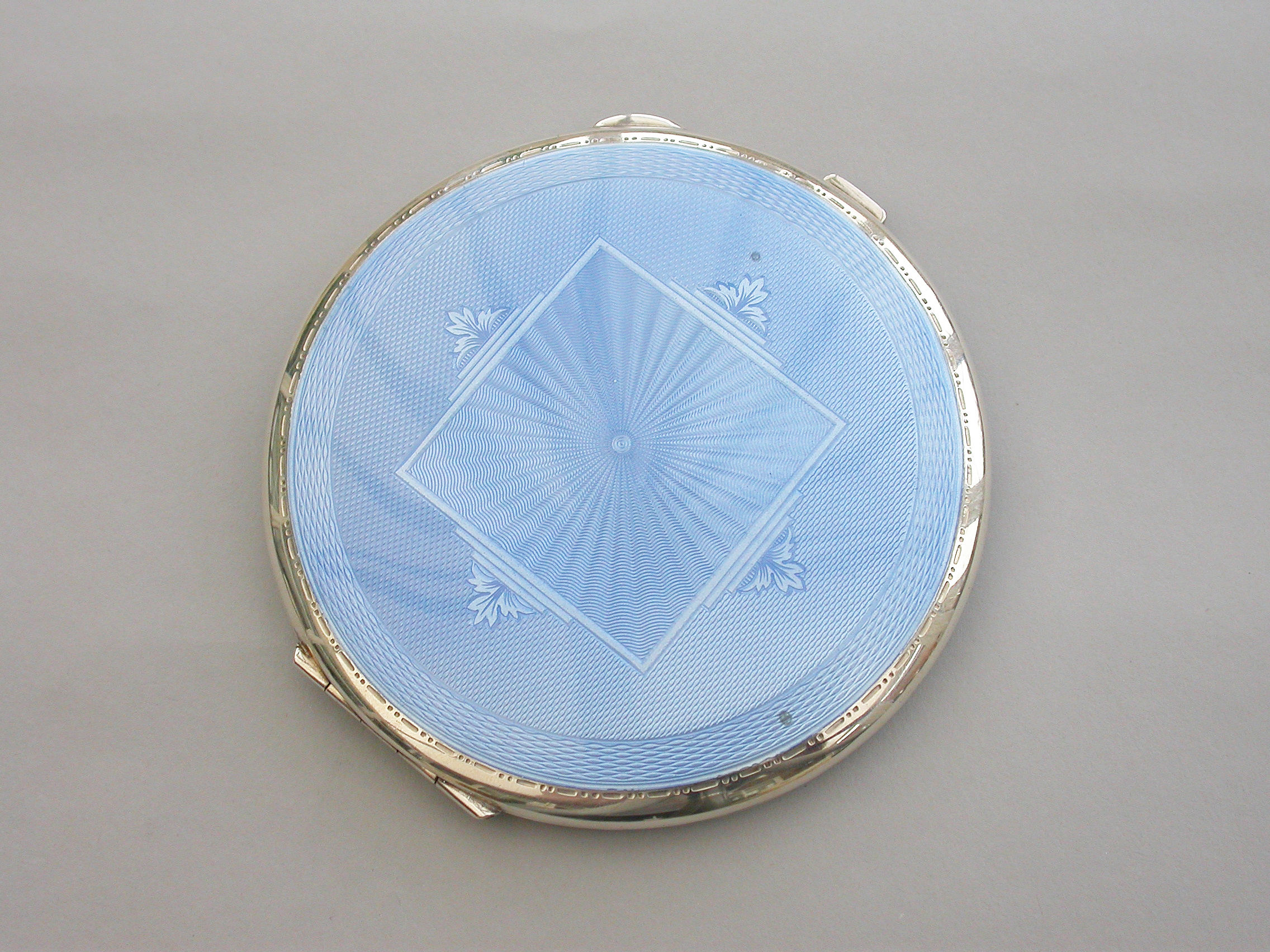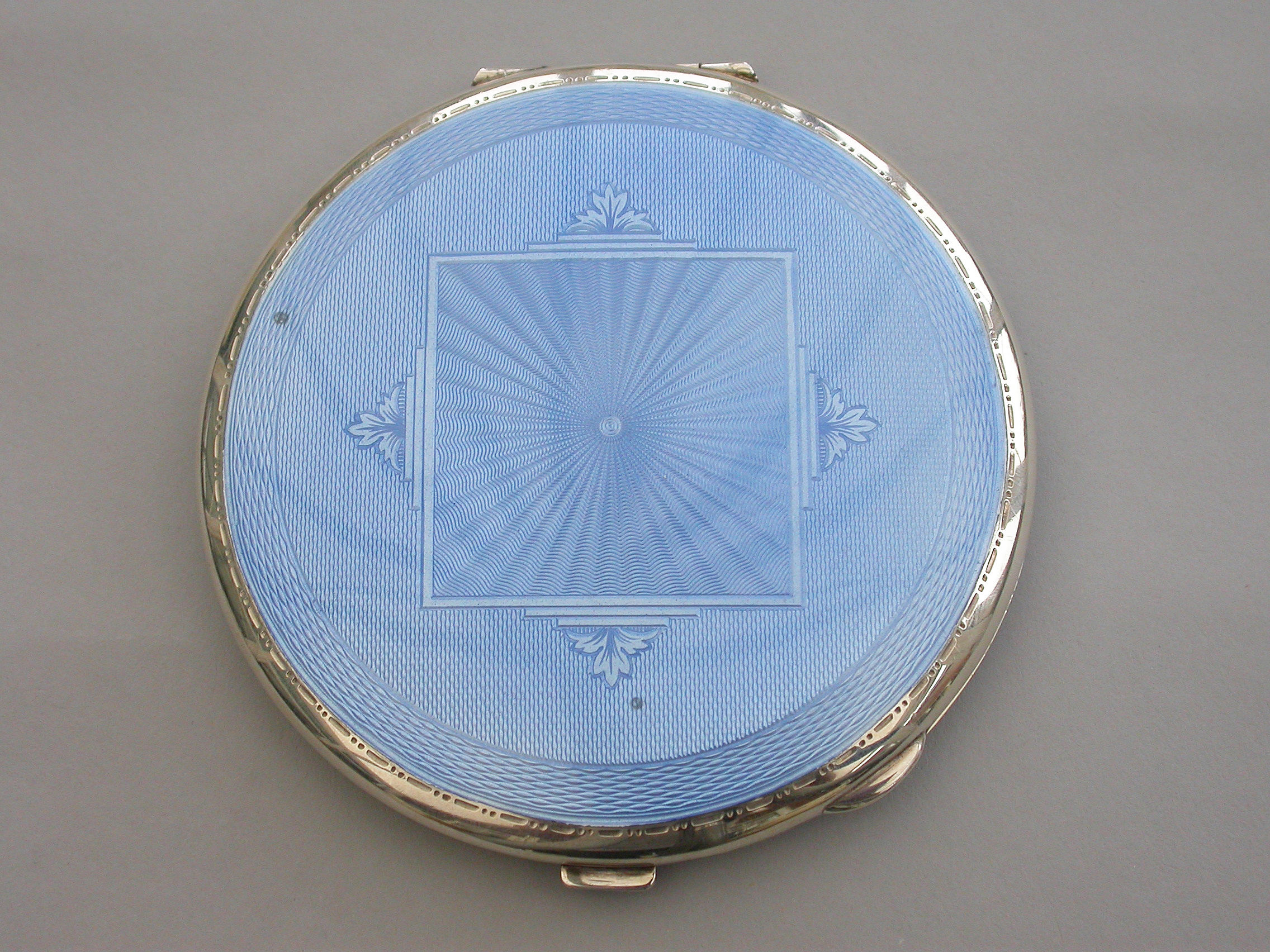 A good quality mid 20th century large circular silver and sky blue guilloche enamel Compact decorated in the Art Deco style with geometric patterns. Engine turned base, internal mirror and powder compartment.
