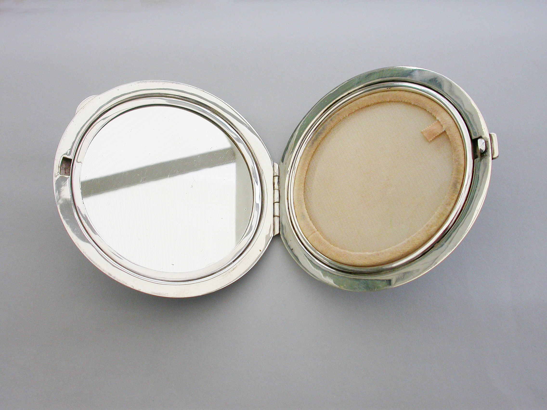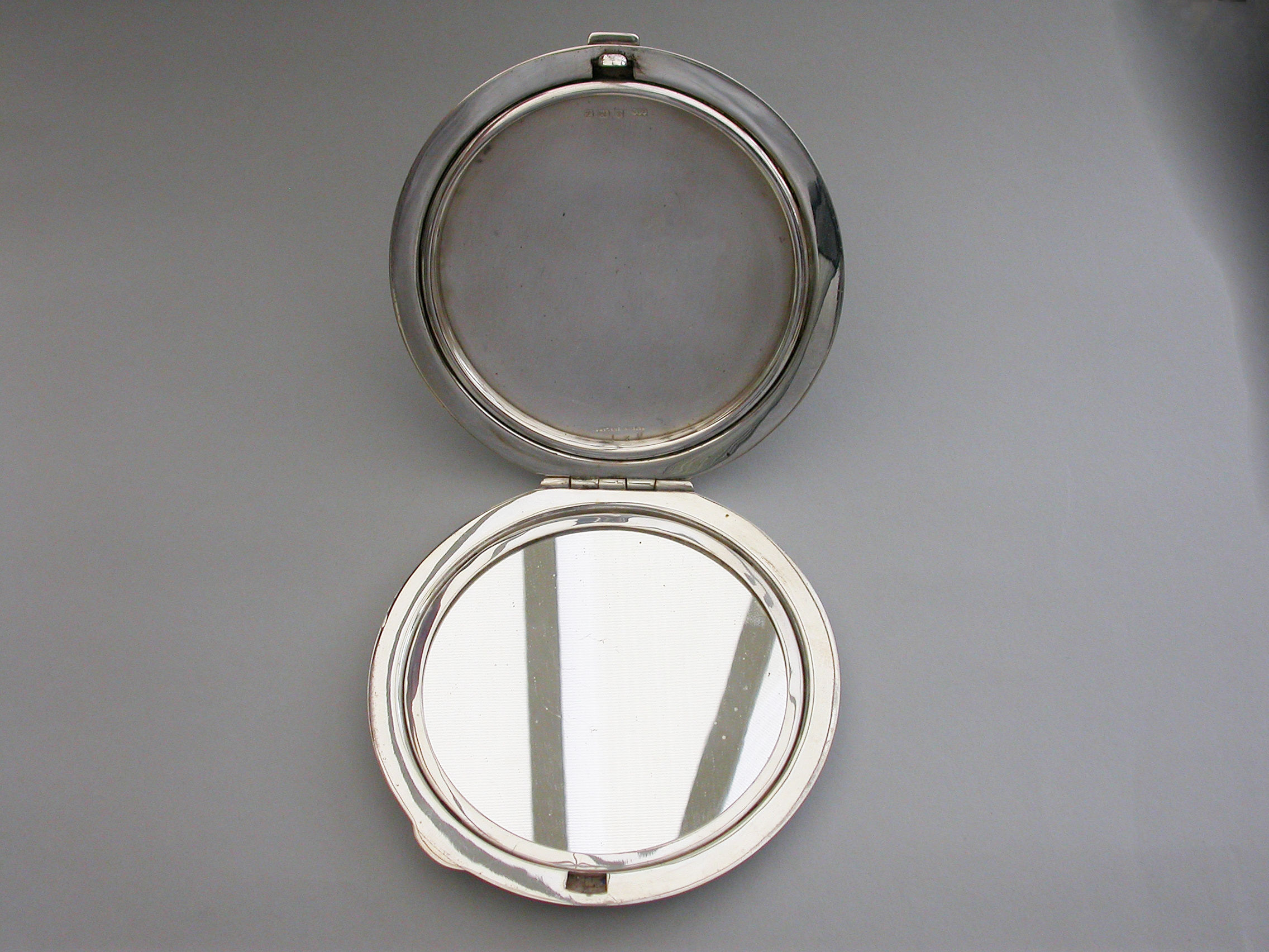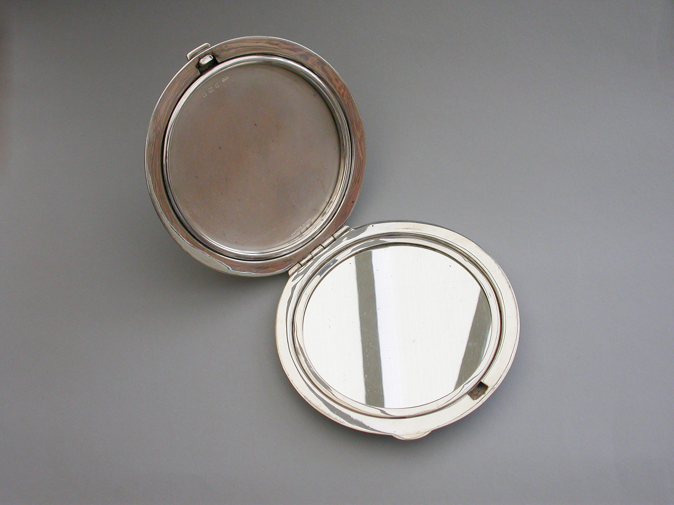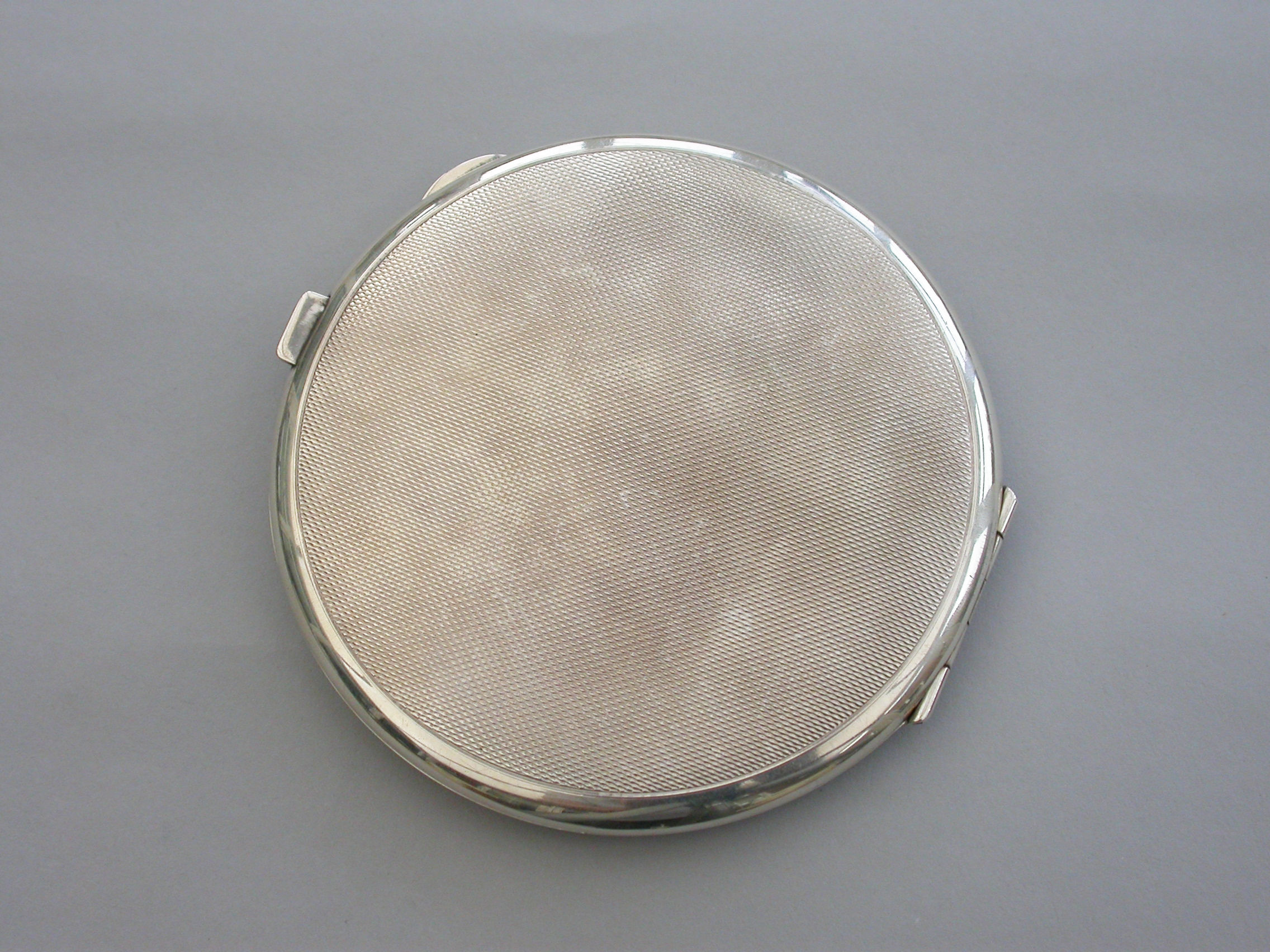 A good quality mid 20th century large circular silver and sky blue guilloche enamel Compact decorated in the Art Deco style with geometric patterns. Engine turned base, internal mirror and powder compartment.