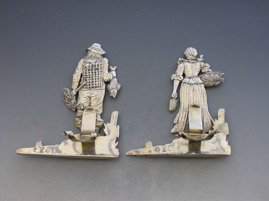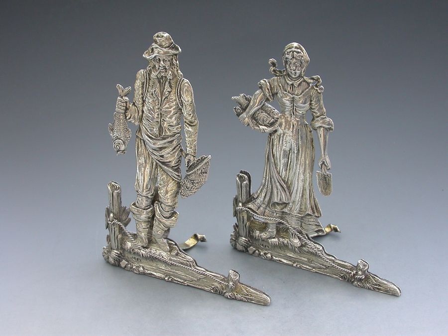 A good quality pair of late Victorian German silver Menu Stands of substantial proportions, the double sided figures formed as a Fisherman and Fisherwomen wearing traditional costumes, he holding a fish in one hand and a net in the other with a wicker fish basket on his back, she holding a fish basket in one hand and a trowel in the other. Scroll shape stands and clips to the reverse.
