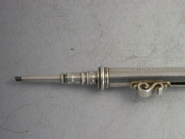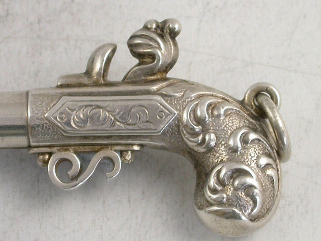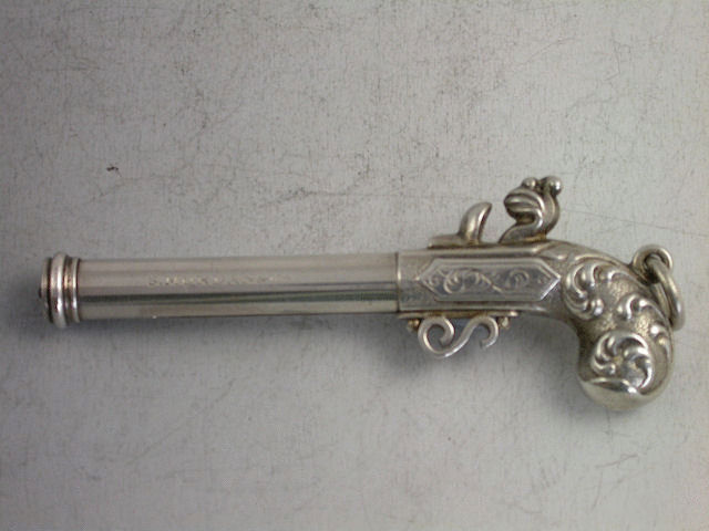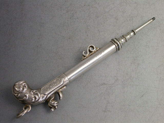 A rare Victorian Novelty silver Propelling Pencil in the form of a Percussion Pistol, the trigger guard sliding to propel the pencil. Stamped - S.Mordan & Co c1850.