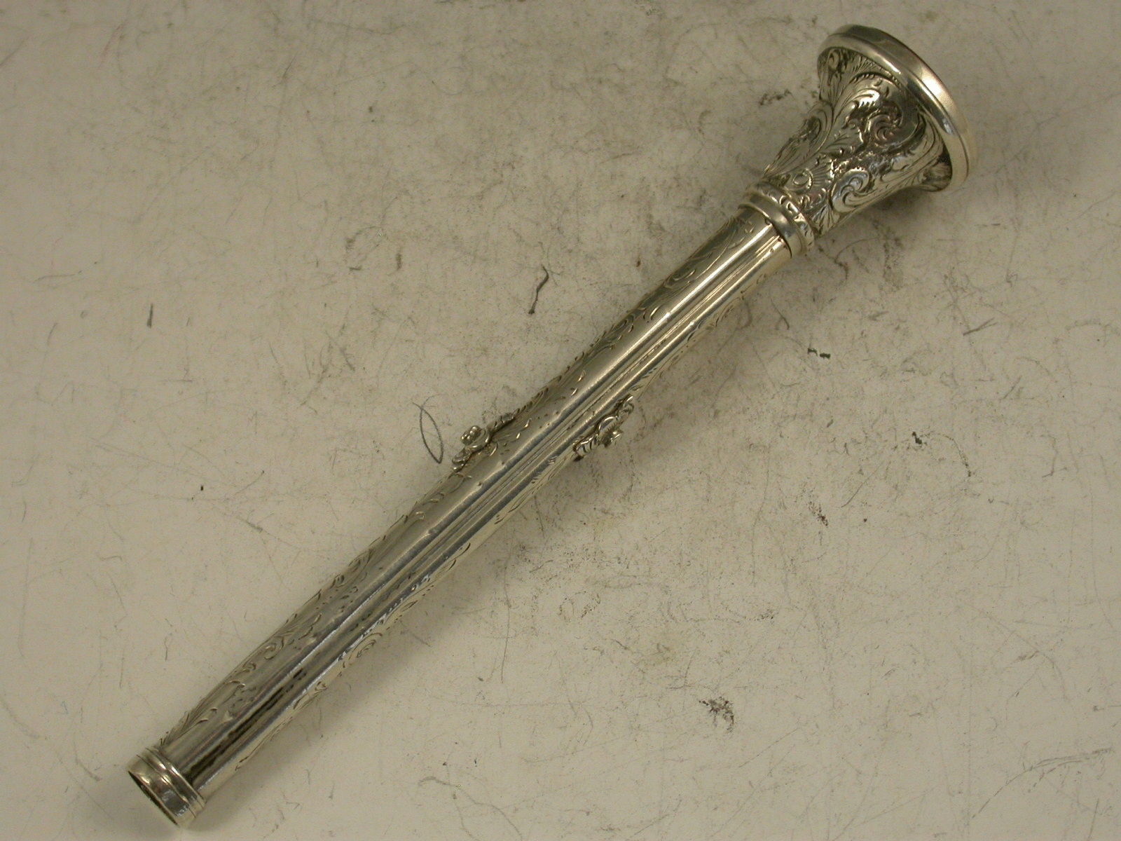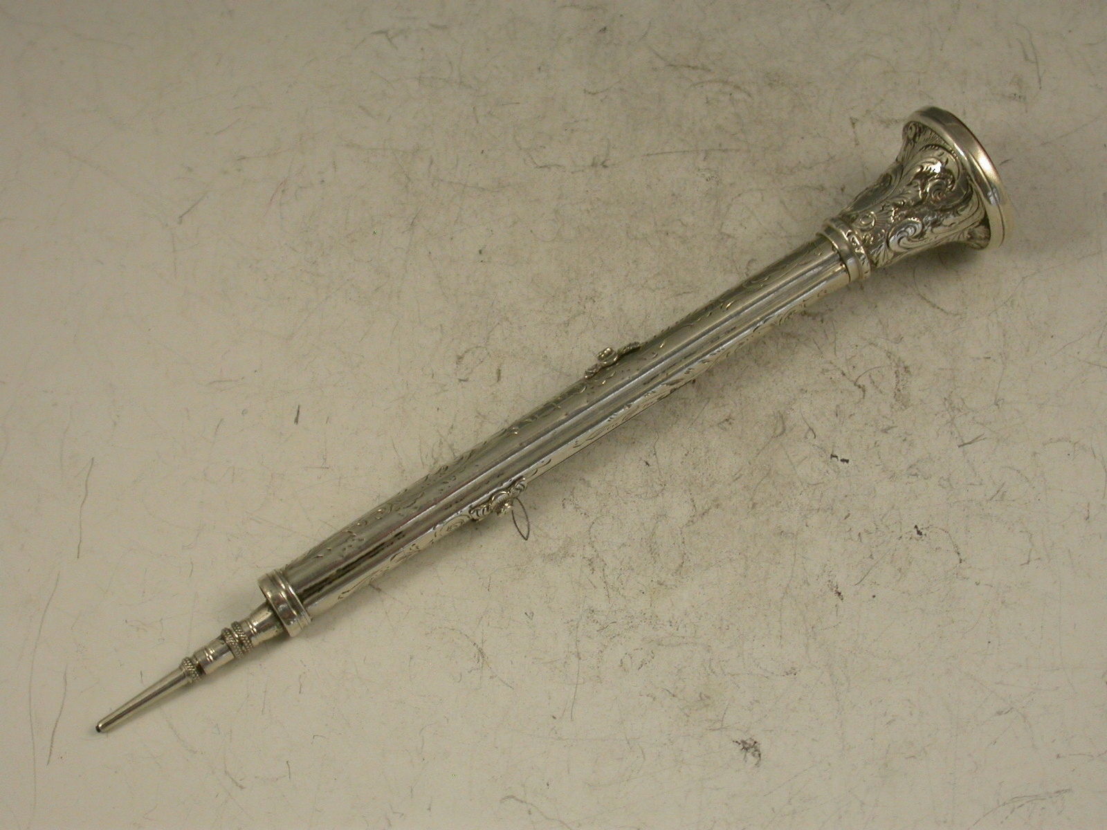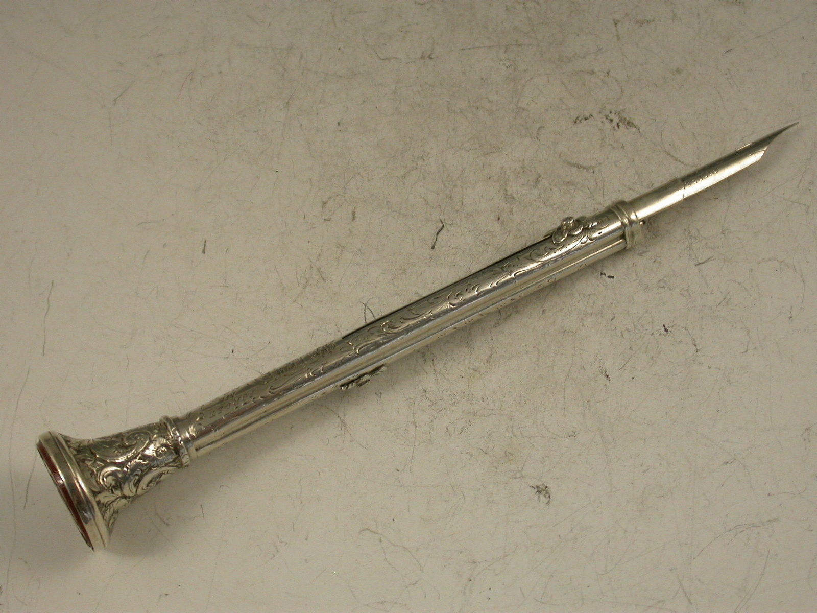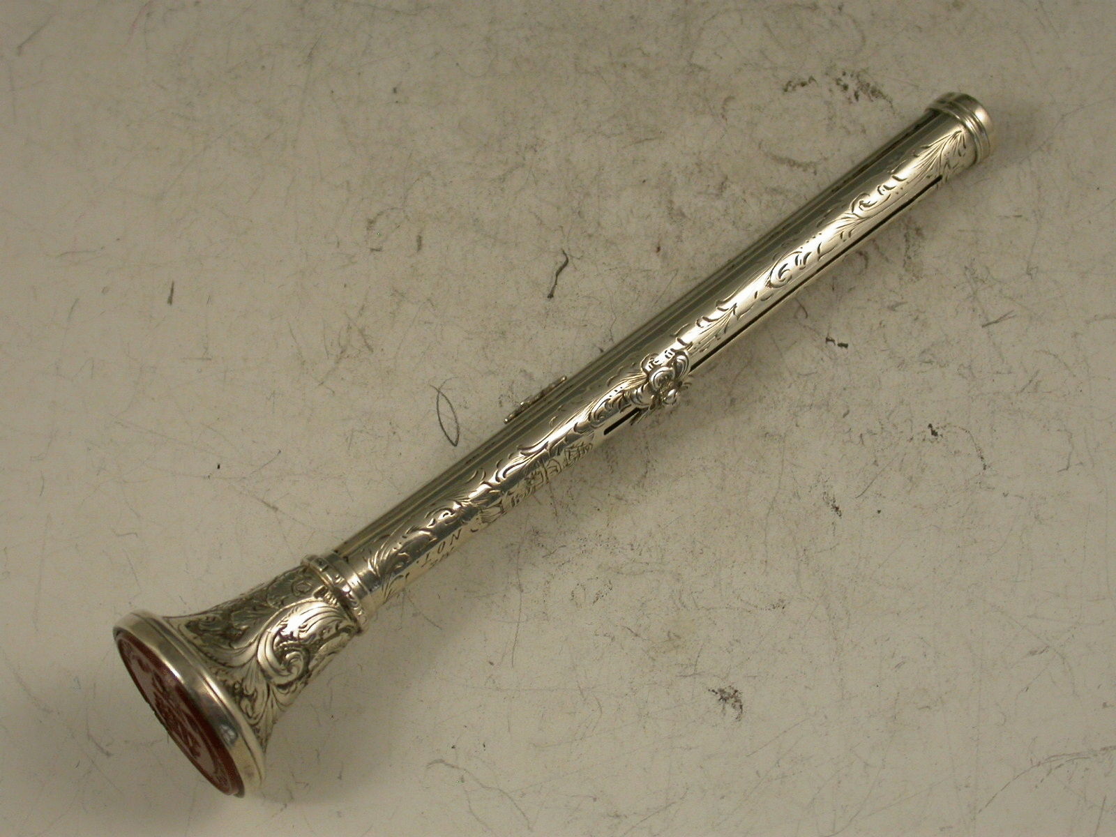 A superb and large Victorian silver combination sliding Propelling Pencil and Dip Pen, the barrel engraved with foliate scrolls and 'Forget Me Not', the terminal set with a Carnelian seal engraved with the crest and motto of Charles Norton Elvin of East Dereham, Norfolk, in an engraved large trumpet shaped mount covering a lead reservoir.