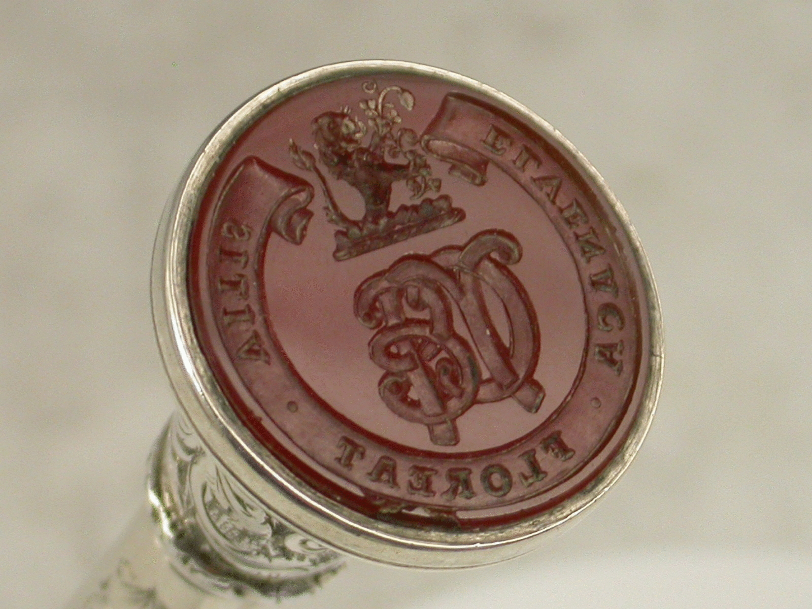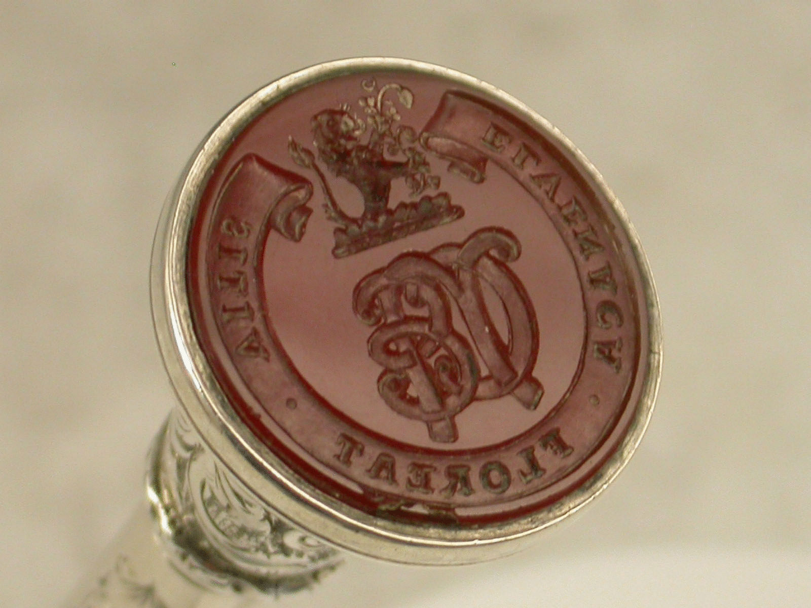 Charles Norton Elvin was author of 'A Dictionary of Heraldry', and other titles on Heraldry. His crest: 'issuing from rocks ppr., a demi-lion rampant or, holding between the paws a vine-branch fructed, also ppr', and motto: 'Elvenaca floreat vitis' (Let the vine of Elvine flourish) depicted on the seal.