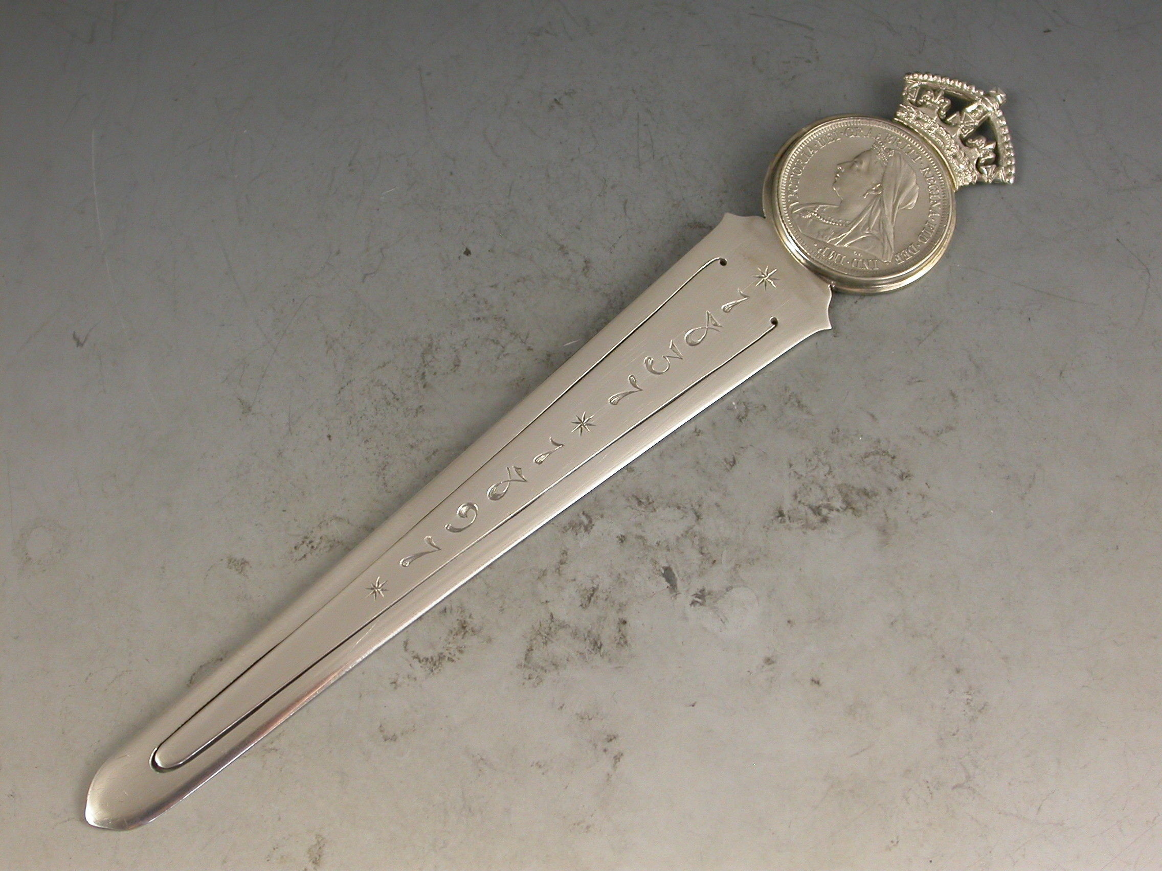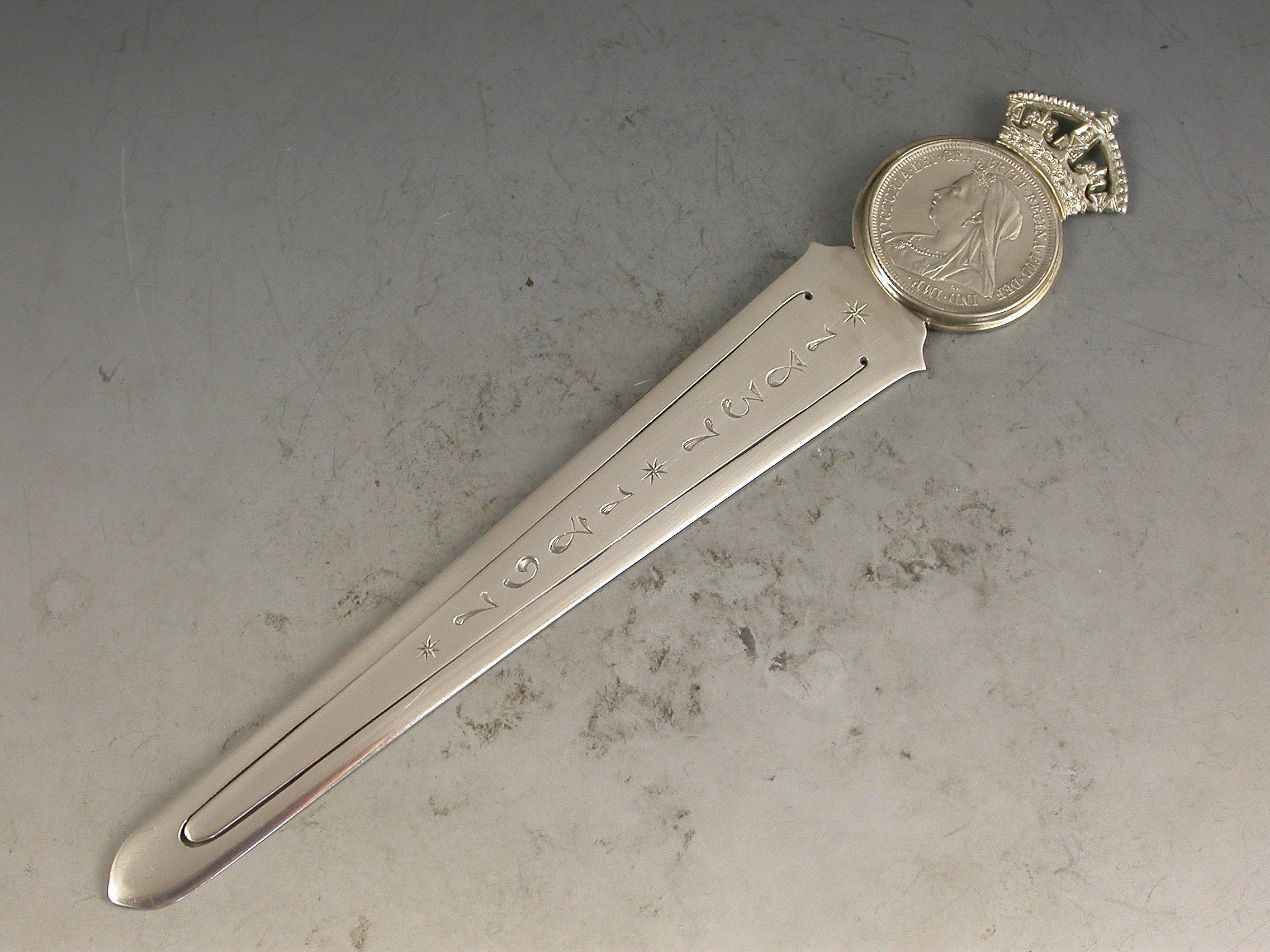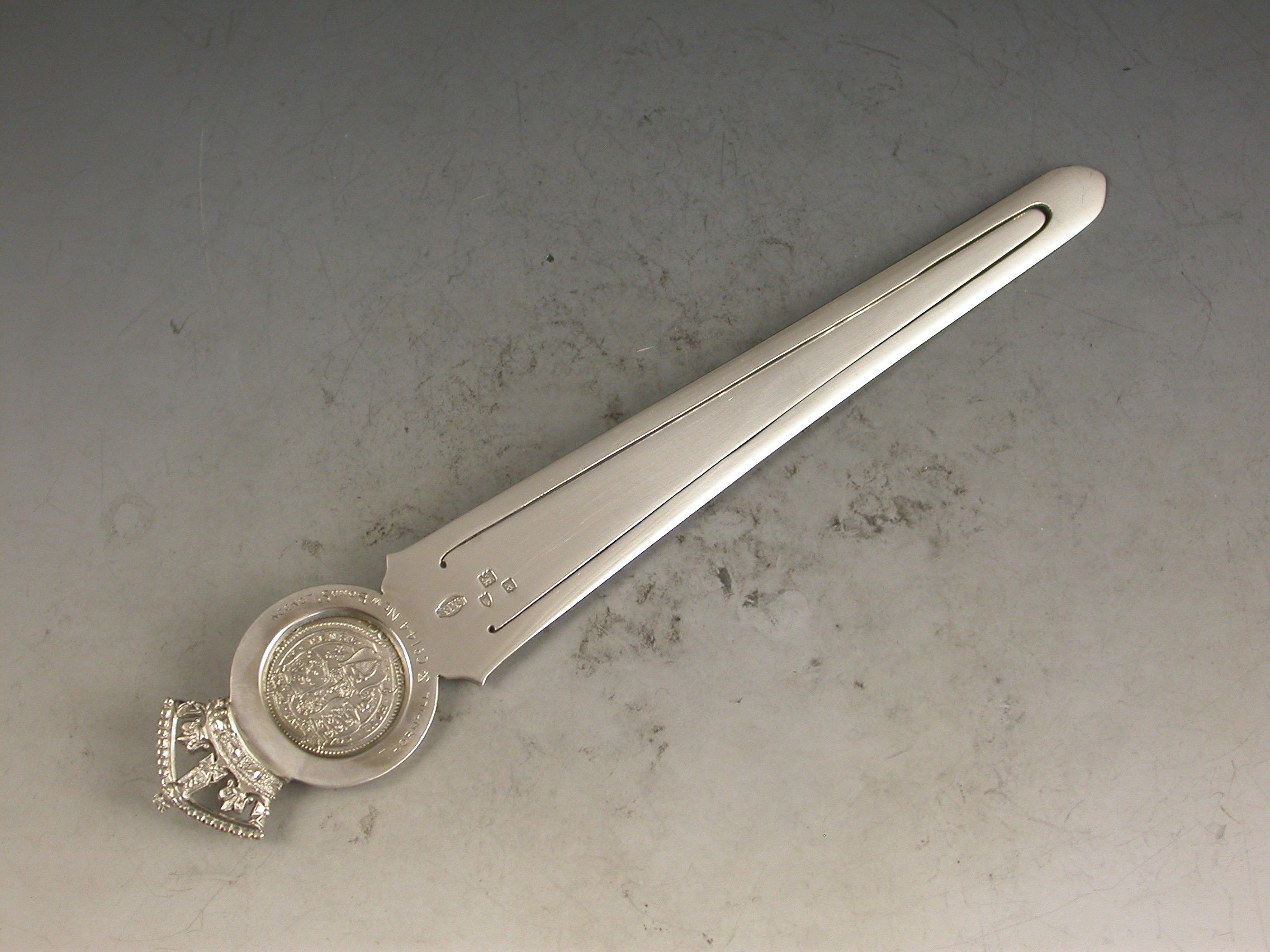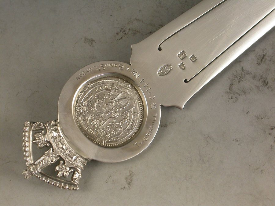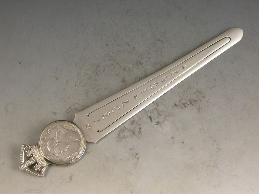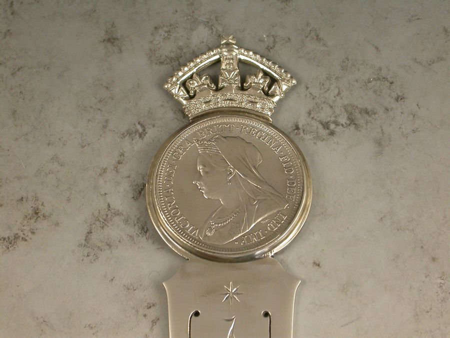 A superb large Victorian silver Bookmark, made to commemorate the 60th anniversary of the coronation of Queen Victoria in 1837 and her Diamond Jubilee in 1897. The long tapering blade engraved with the dates 1837 – 1897. The circular mount set with a Victorian silver florin below a crown finial.