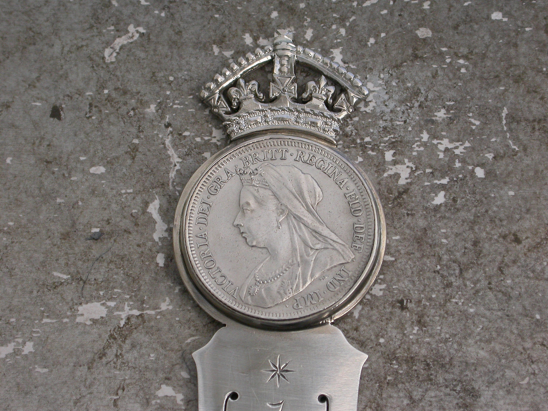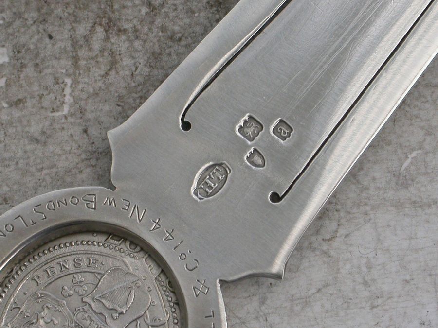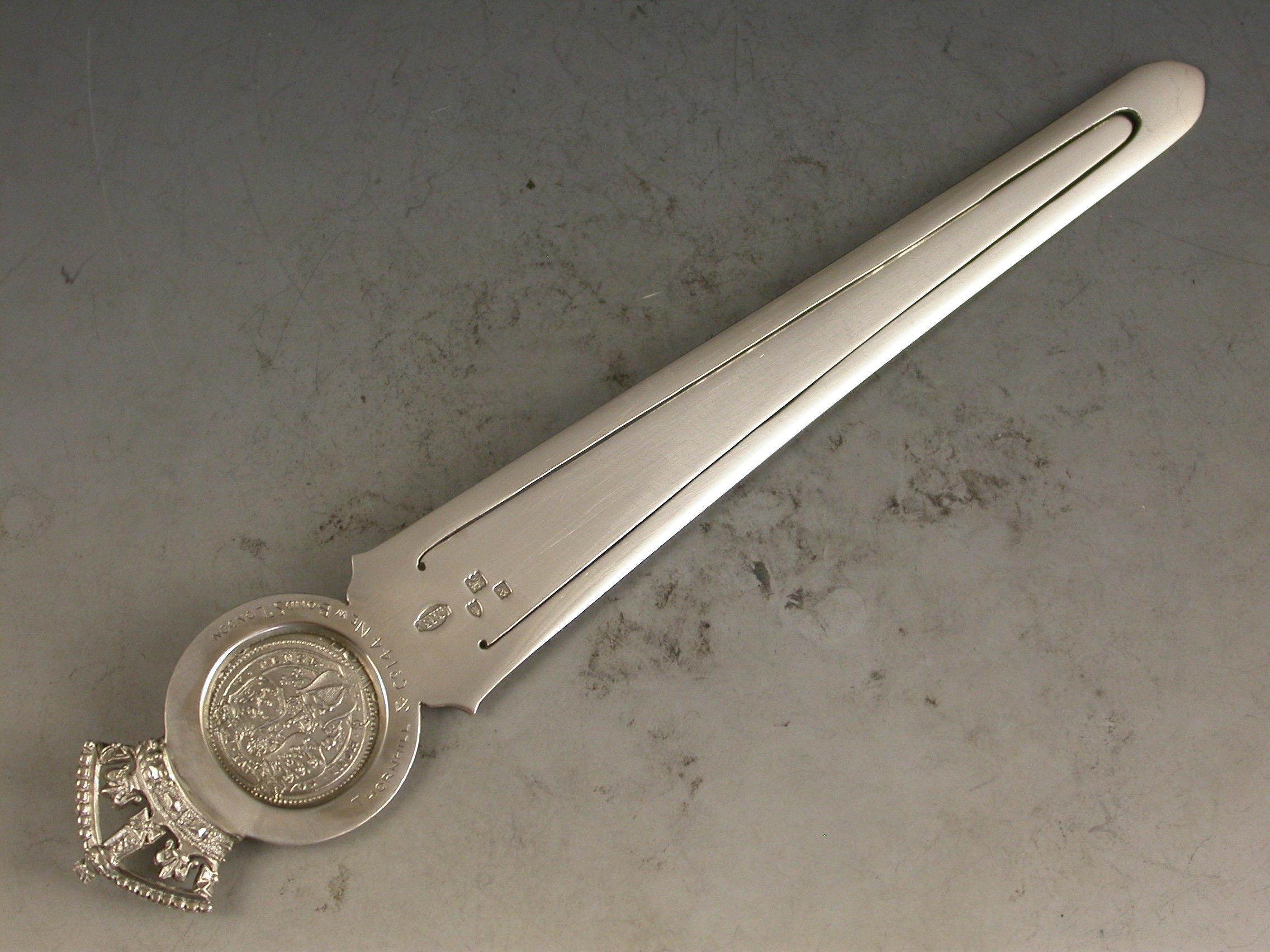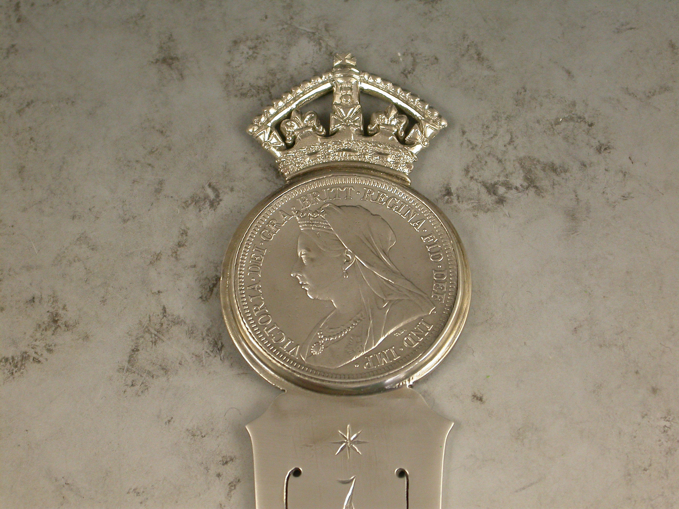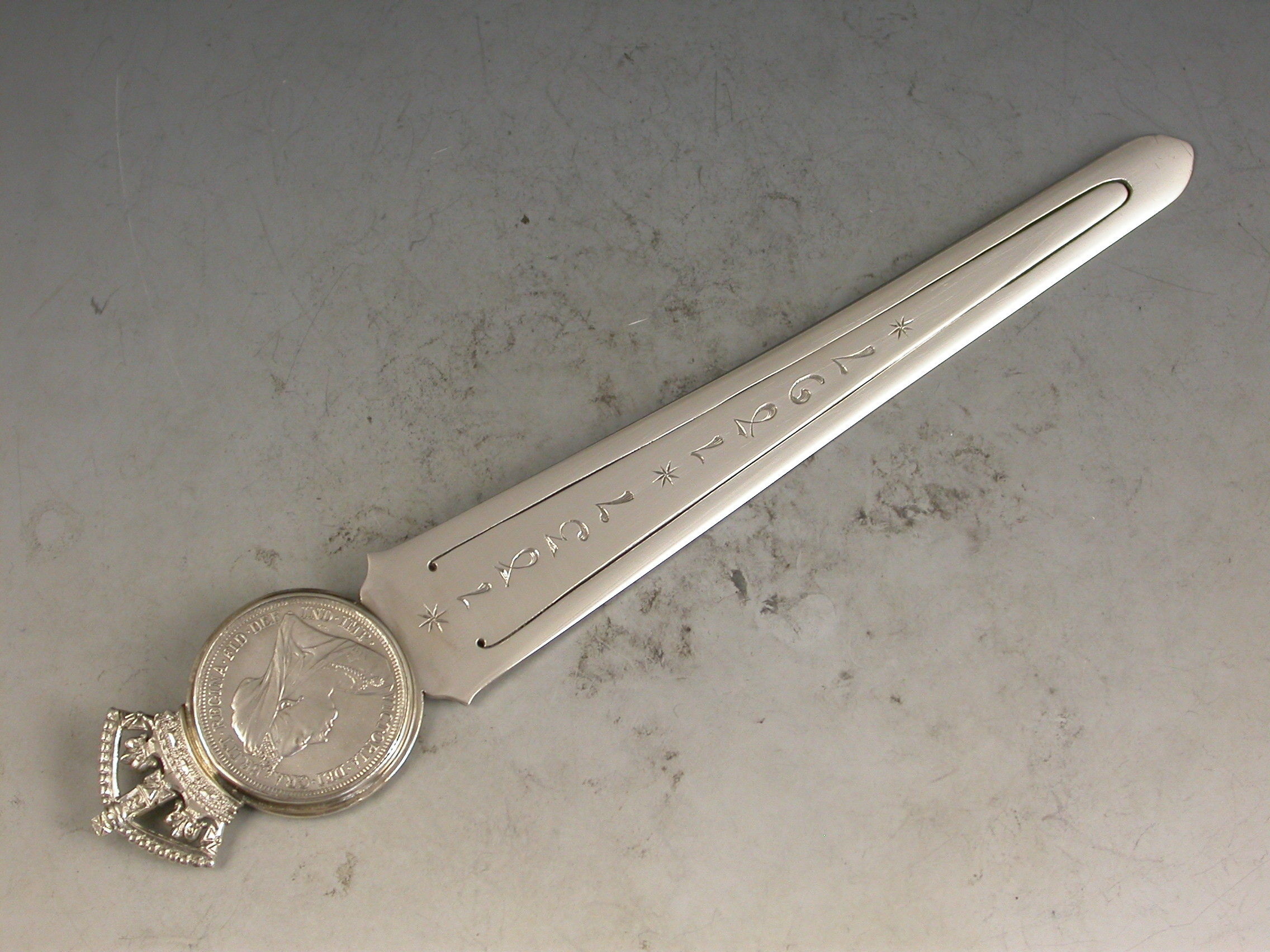 A superb large Victorian silver Bookmark, made to commemorate the 60th anniversary of the coronation of Queen Victoria in 1837 and her Diamond Jubilee in 1897. The long tapering blade engraved with the dates 1837 – 1897. The circular mount set with a Victorian silver florin below a crown finial.