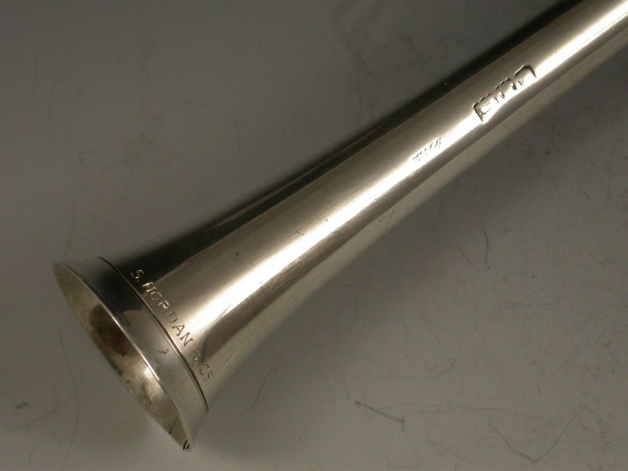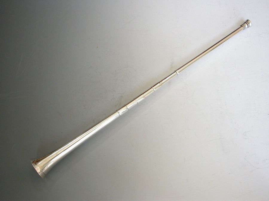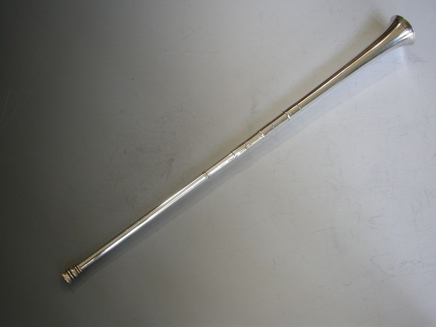 An extremely large (note standard size example in photos for comparison) Victorian novelty silver Propelling Pencil made in the form of a hunting horn, with three raised collars.