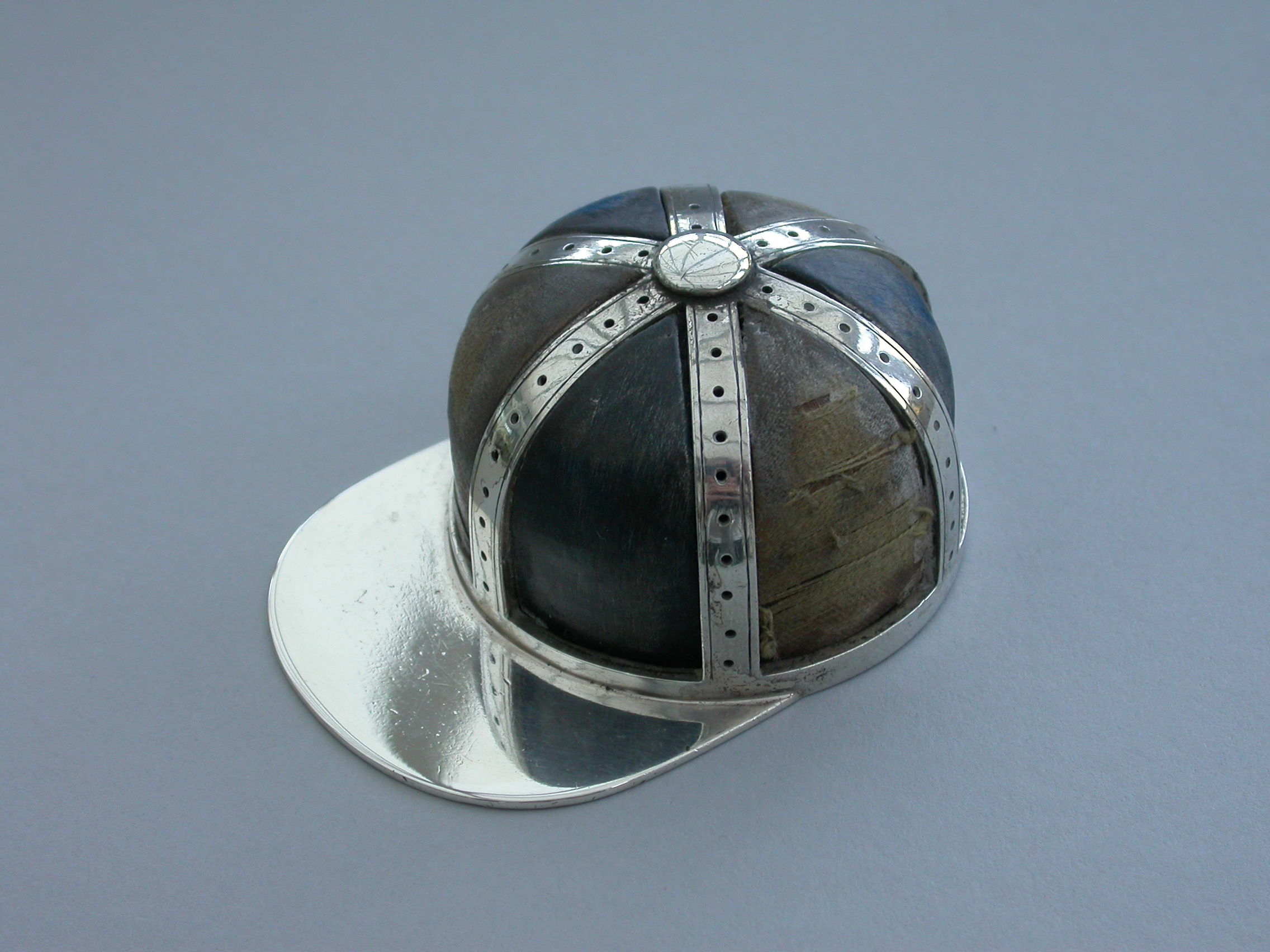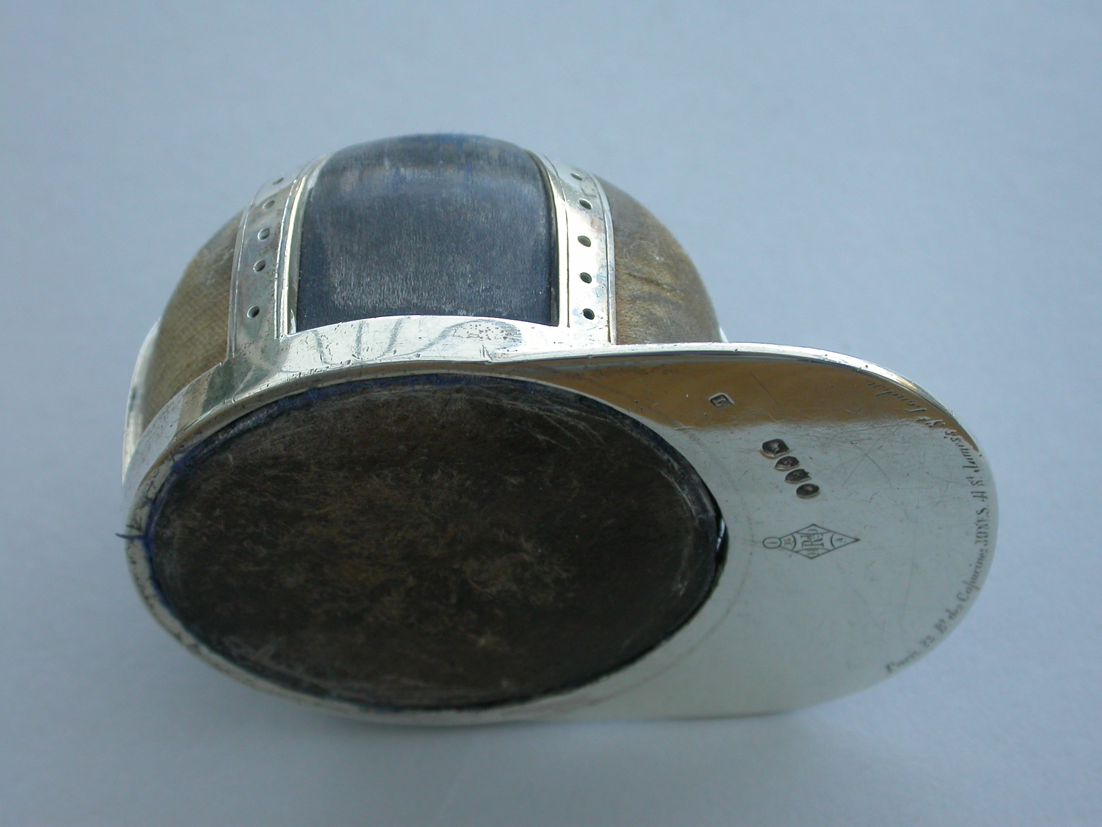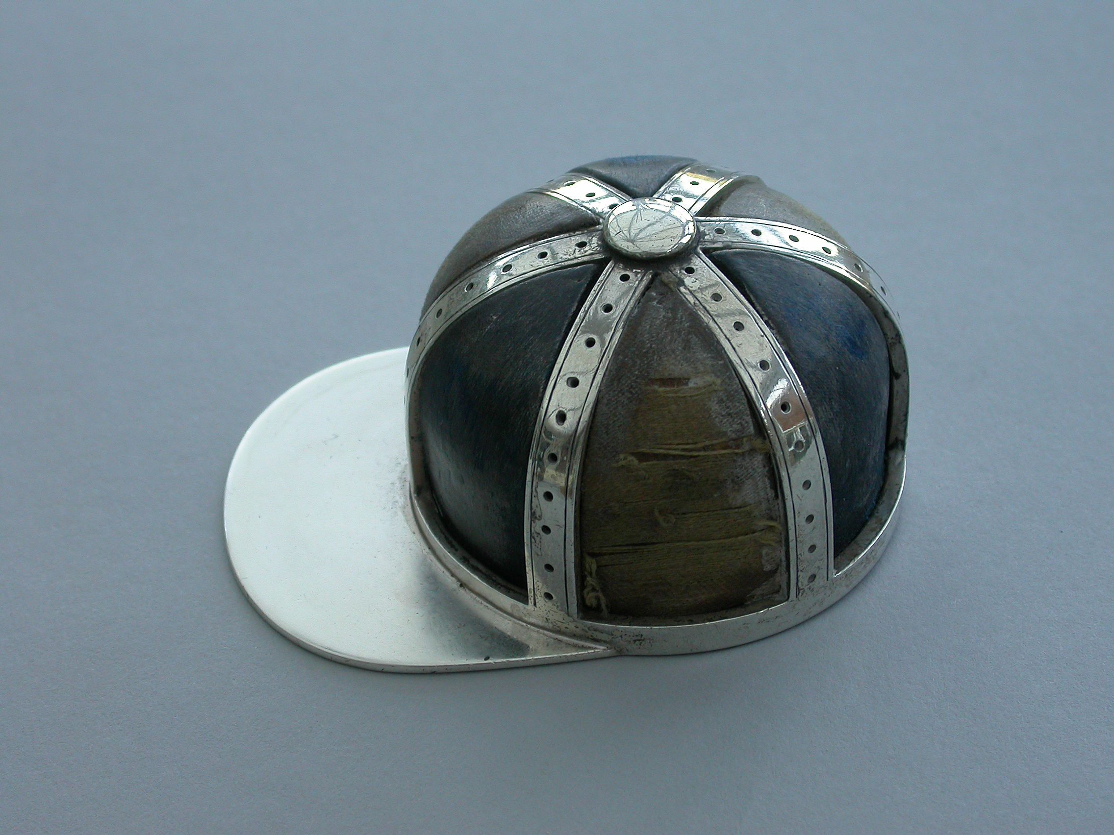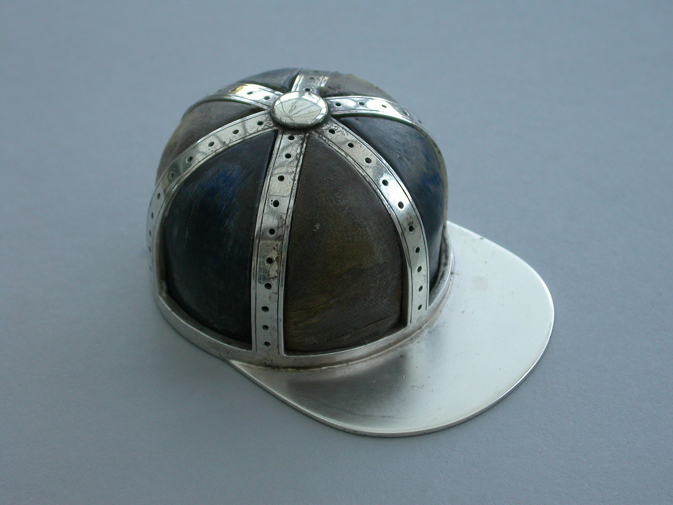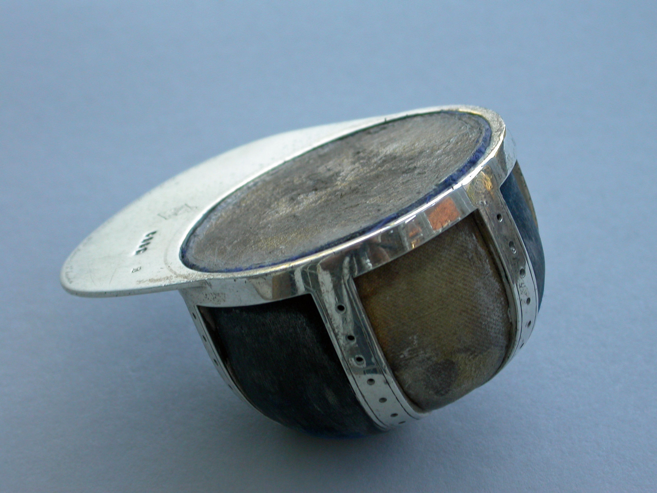 A large Victorian novelty silver Pin Cushion made in the form of a Jockey Cap with a plain silver peak. The cap divided into six sections by pierced straps, the six original velvet covered cushion sections alternating blue and white. Leather base.