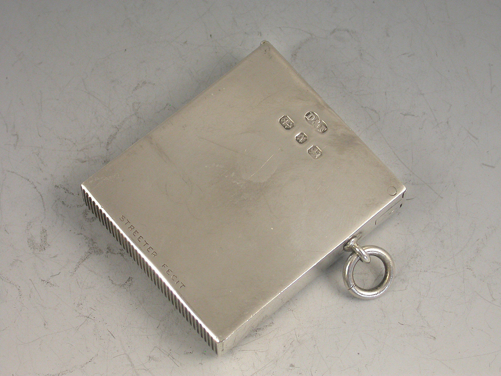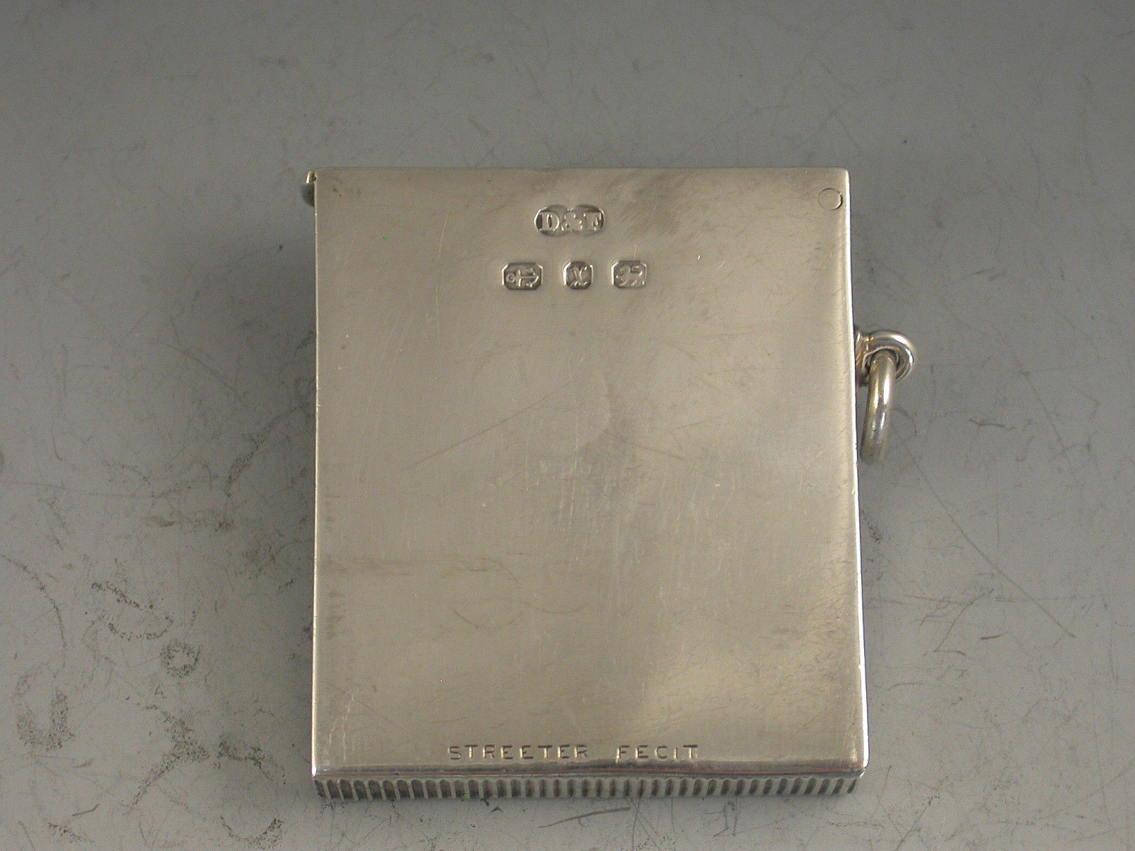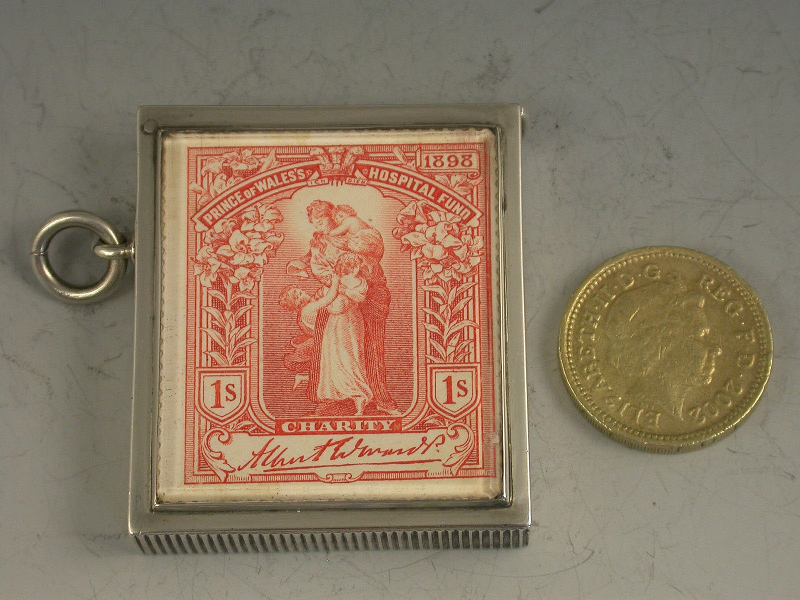 A fine and rare Victorian silver Vesta Case of large rectangular form with flat hinged lid and attached suspension ring. The face set with a glass panel covering a red one shilling charity stamp, silver gilt interior.