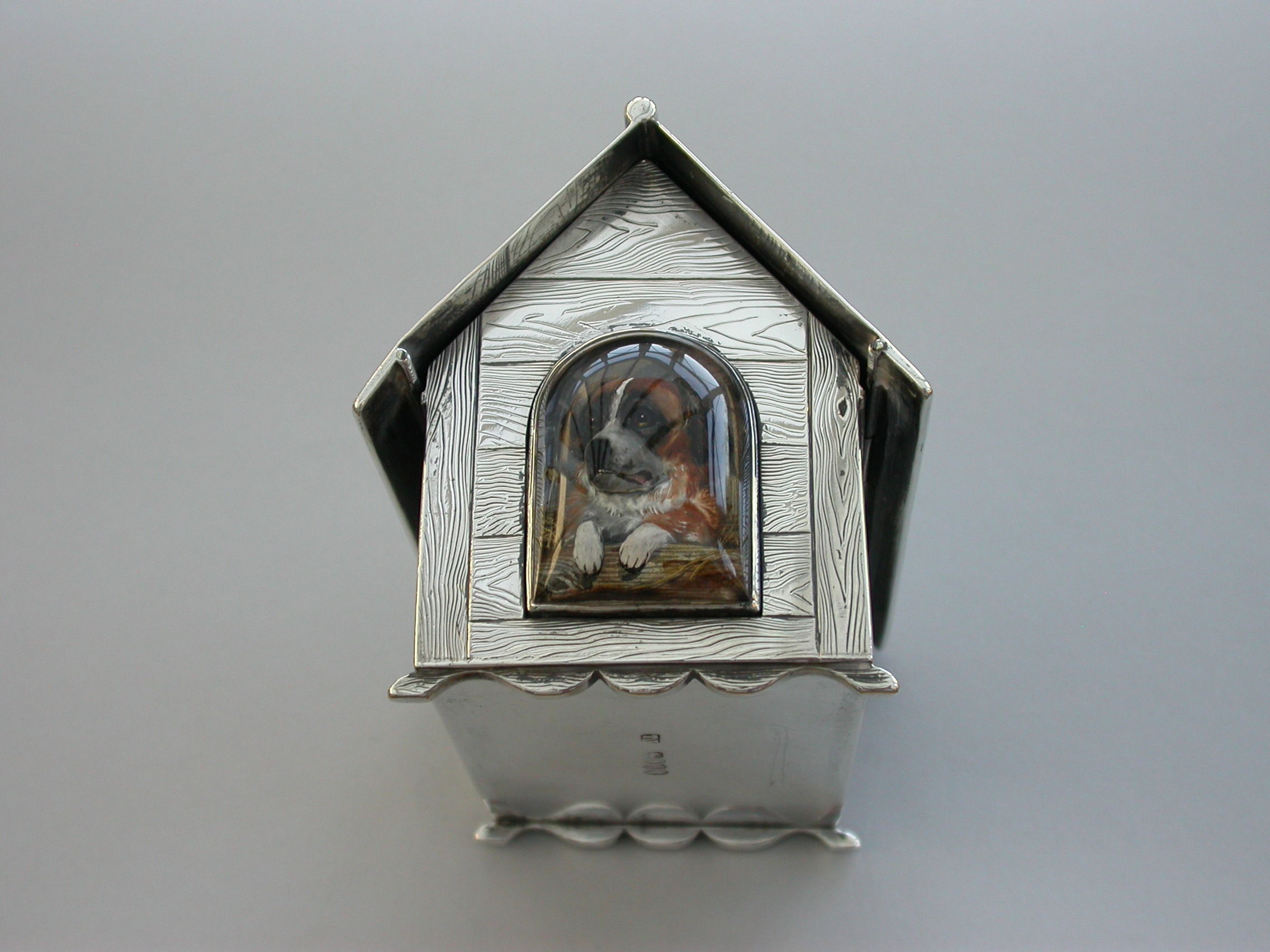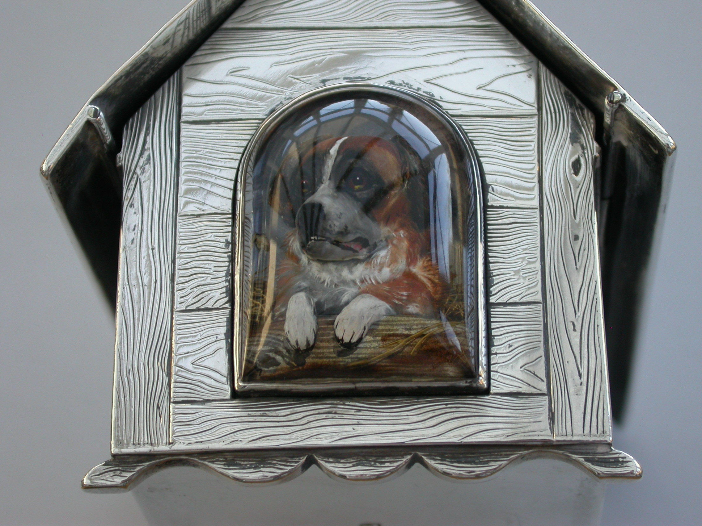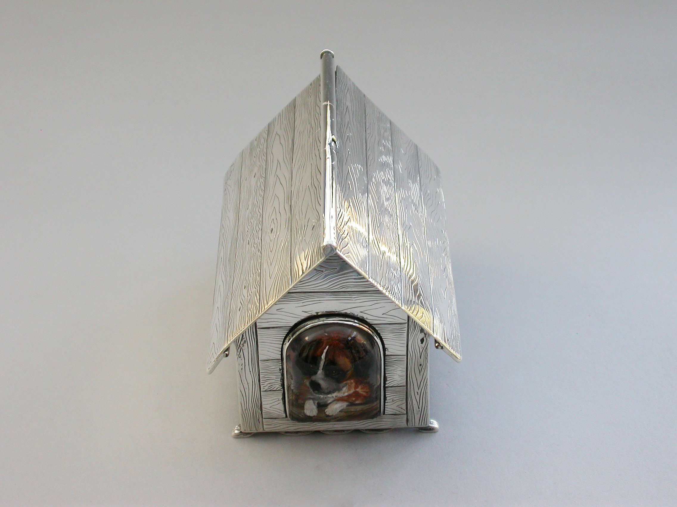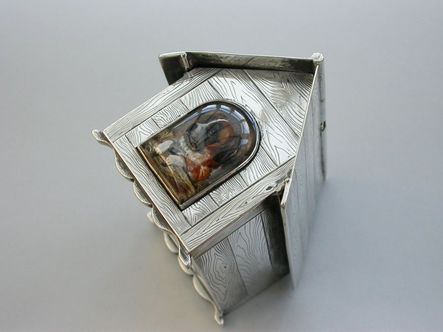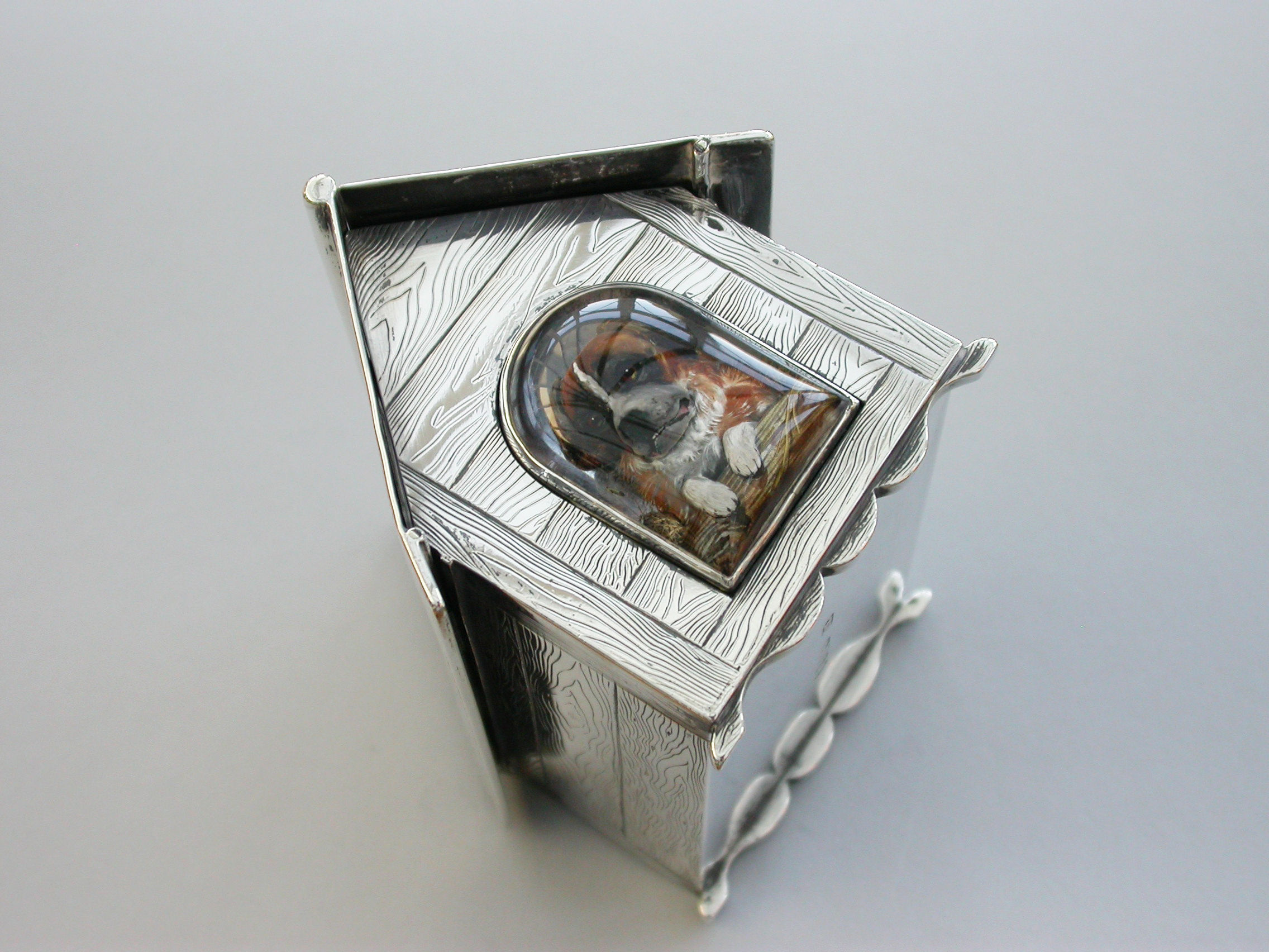 A very fine large Victorian novelty silver and Essex rock crystal Cigarette Box, modeled as a slatted wooden dog kennel, the front with an applied Essex rock crystal panel depicting a St Bernard dog. The roof of the kennel with push-button sprung opening mechanism and silver gilt interior.