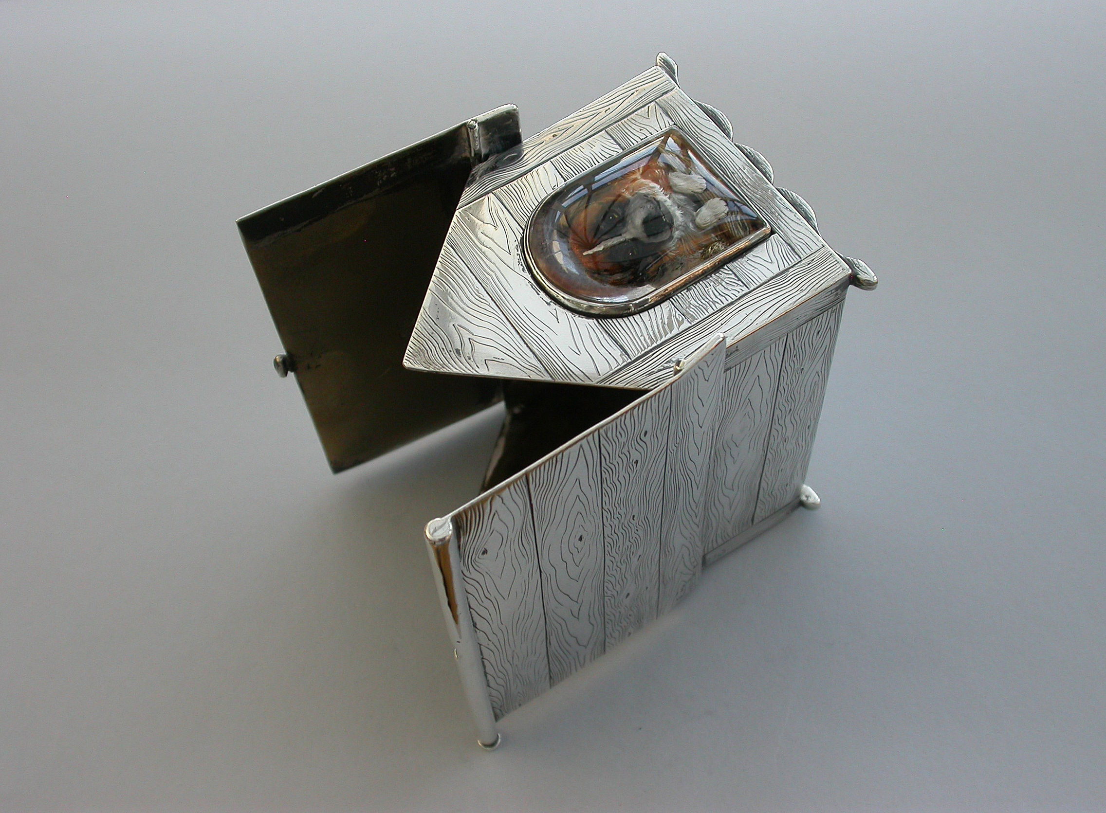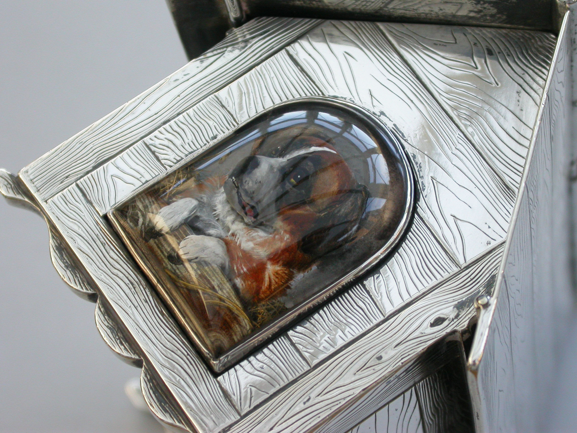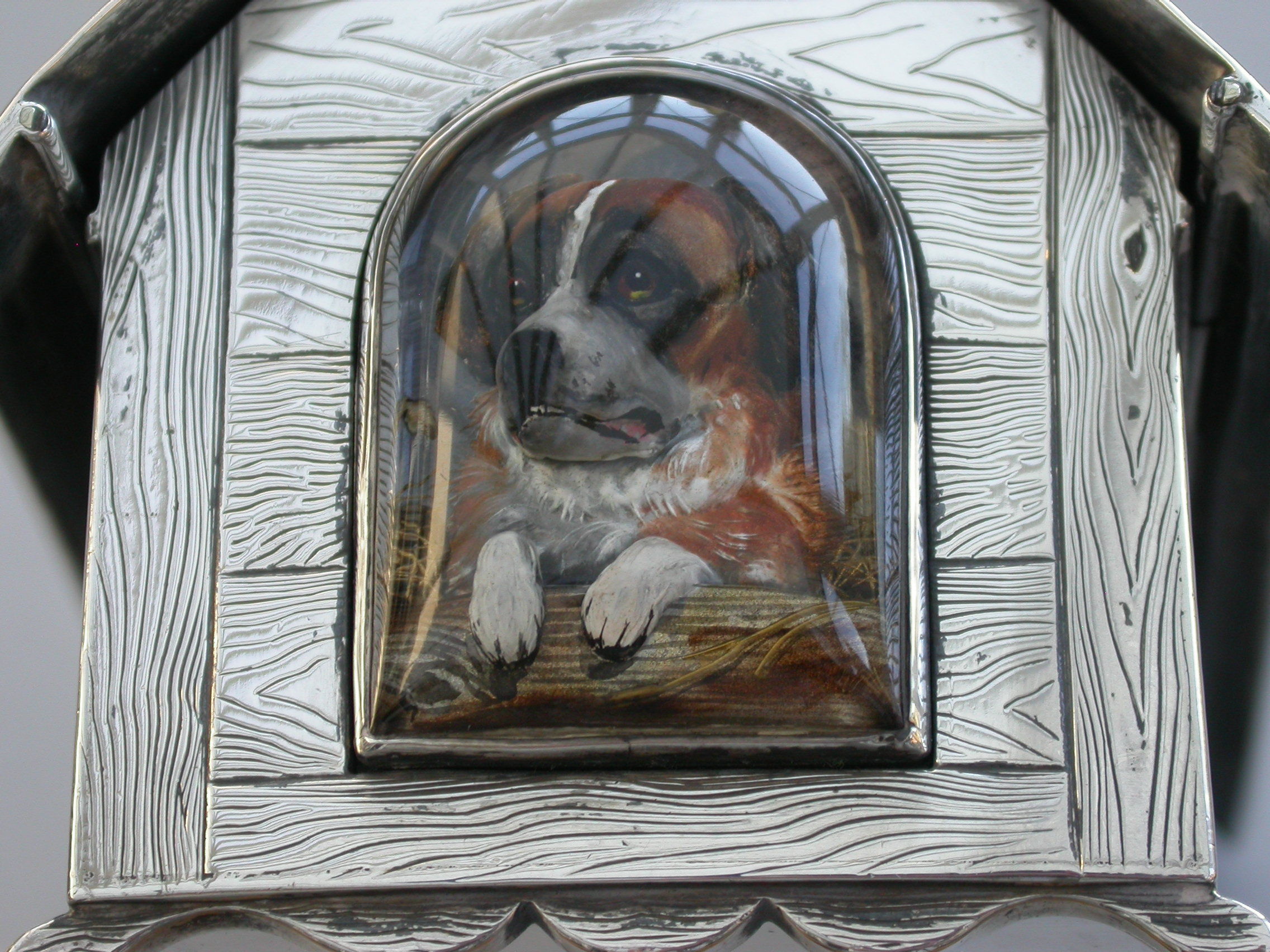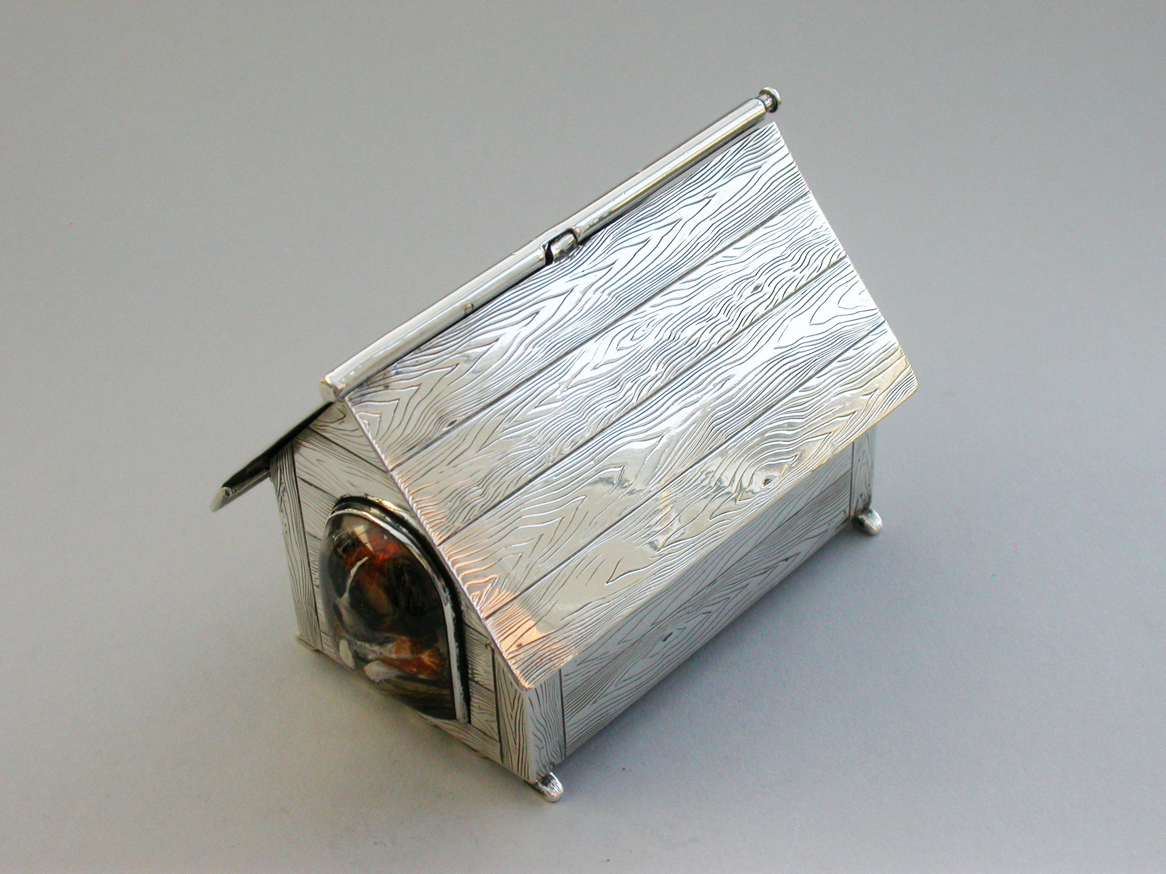 A very fine large Victorian novelty silver and Essex rock crystal Cigarette Box, modeled as a slatted wooden dog kennel, the front with an applied Essex rock crystal panel depicting a St Bernard dog. The roof of the kennel with push-button sprung opening mechanism and silver gilt interior.
