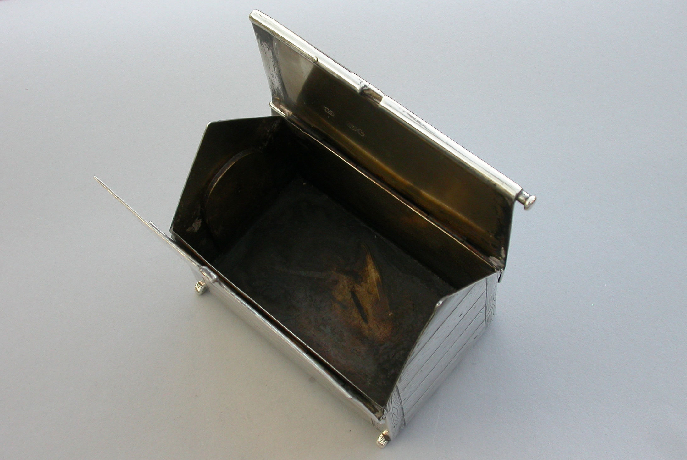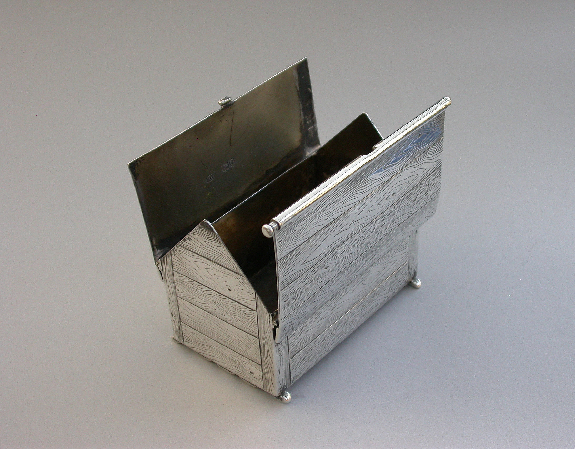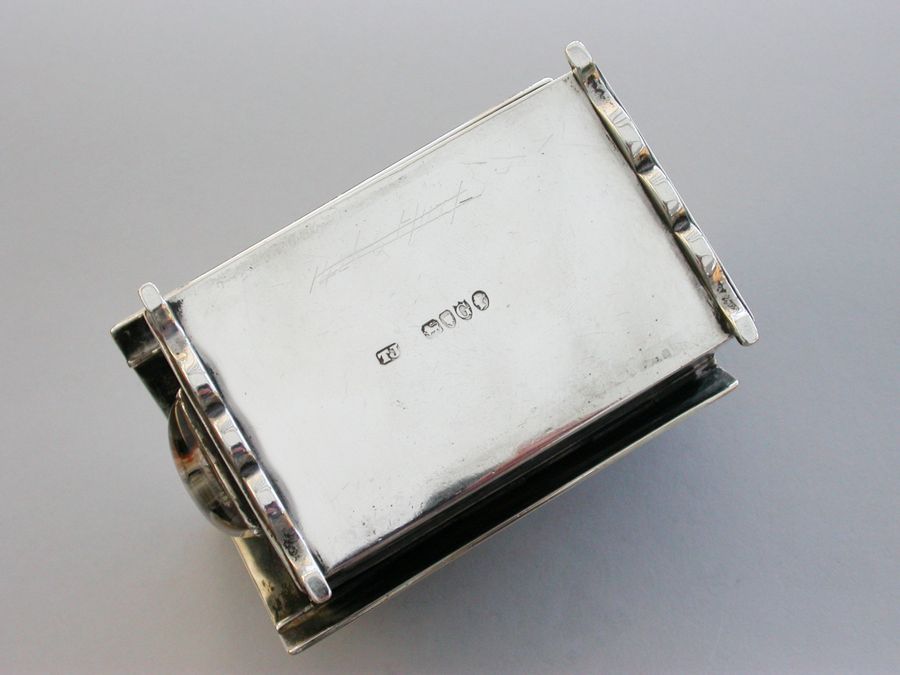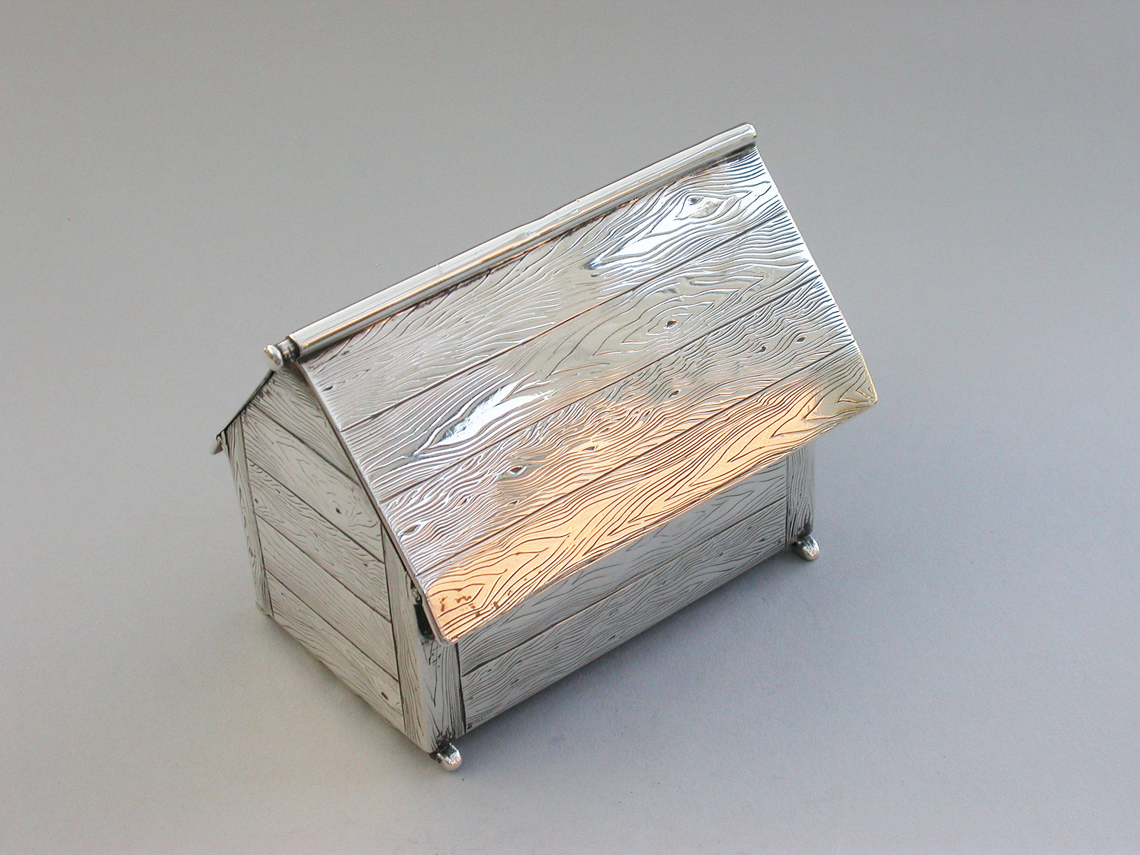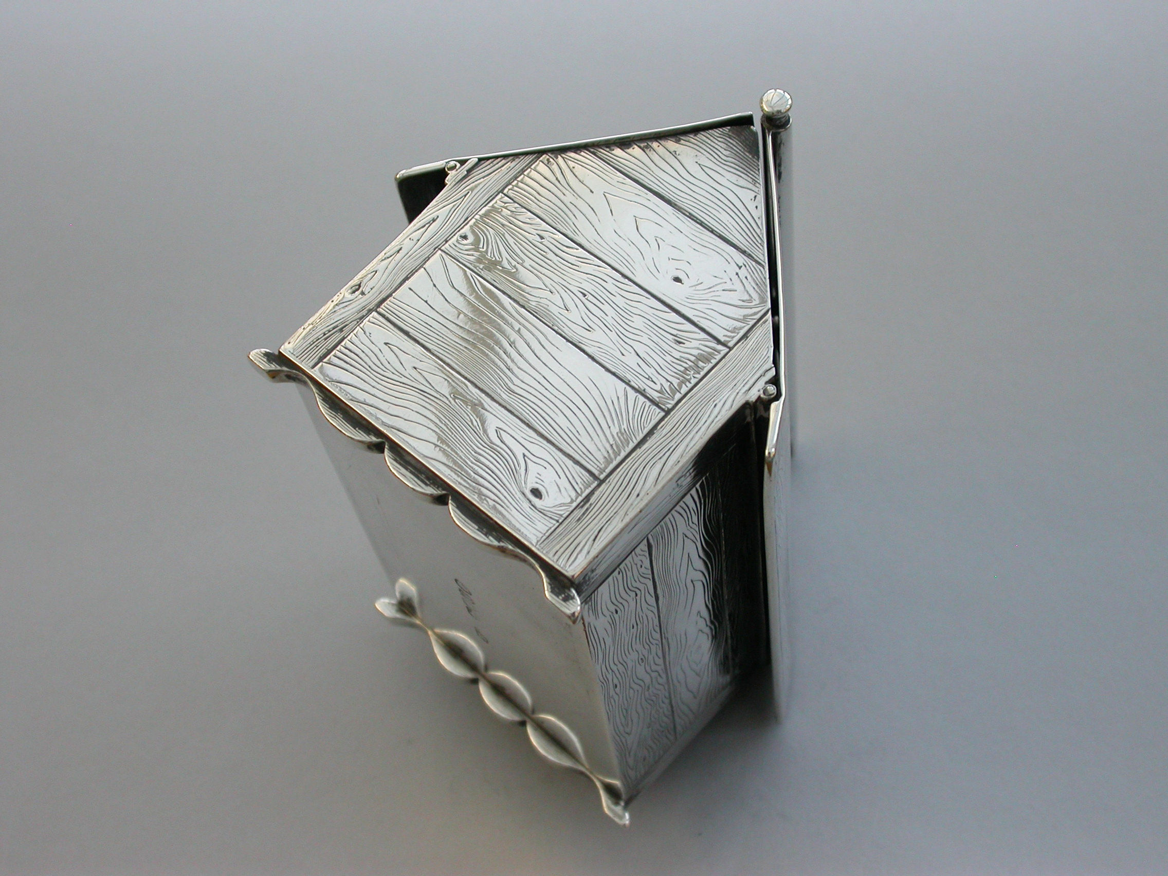 A very fine large Victorian novelty silver and Essex rock crystal Cigarette Box, modeled as a slatted wooden dog kennel, the front with an applied Essex rock crystal panel depicting a St Bernard dog. The roof of the kennel with push-button sprung opening mechanism and silver gilt interior.