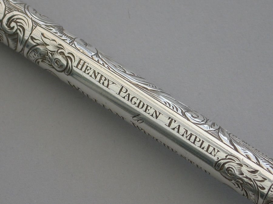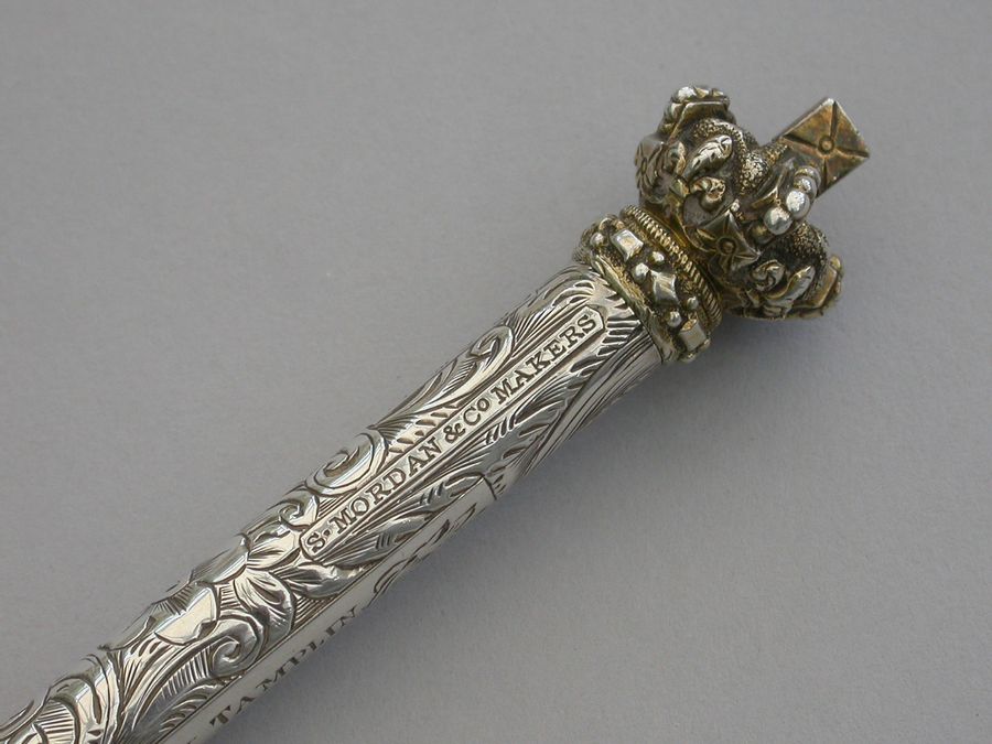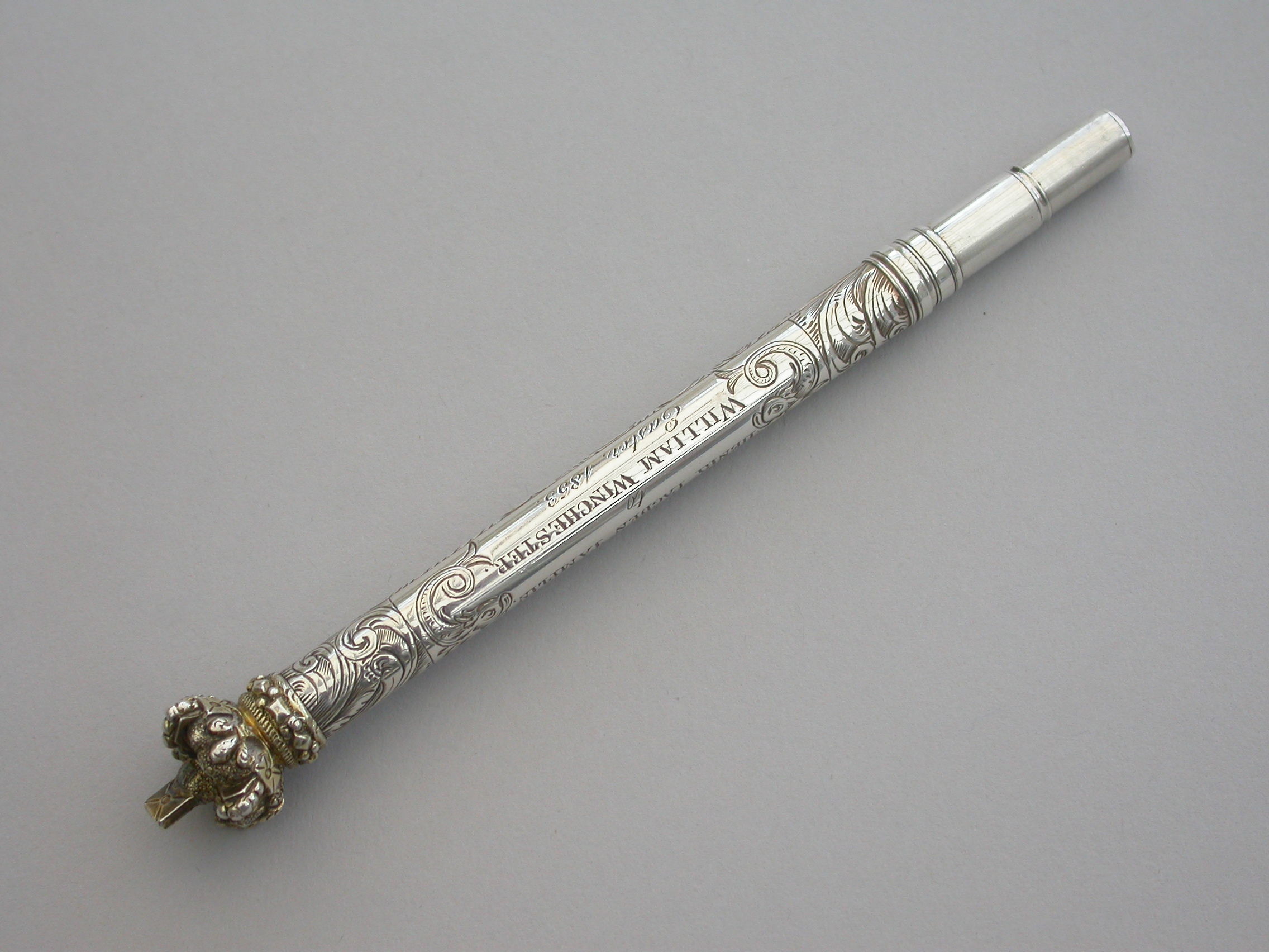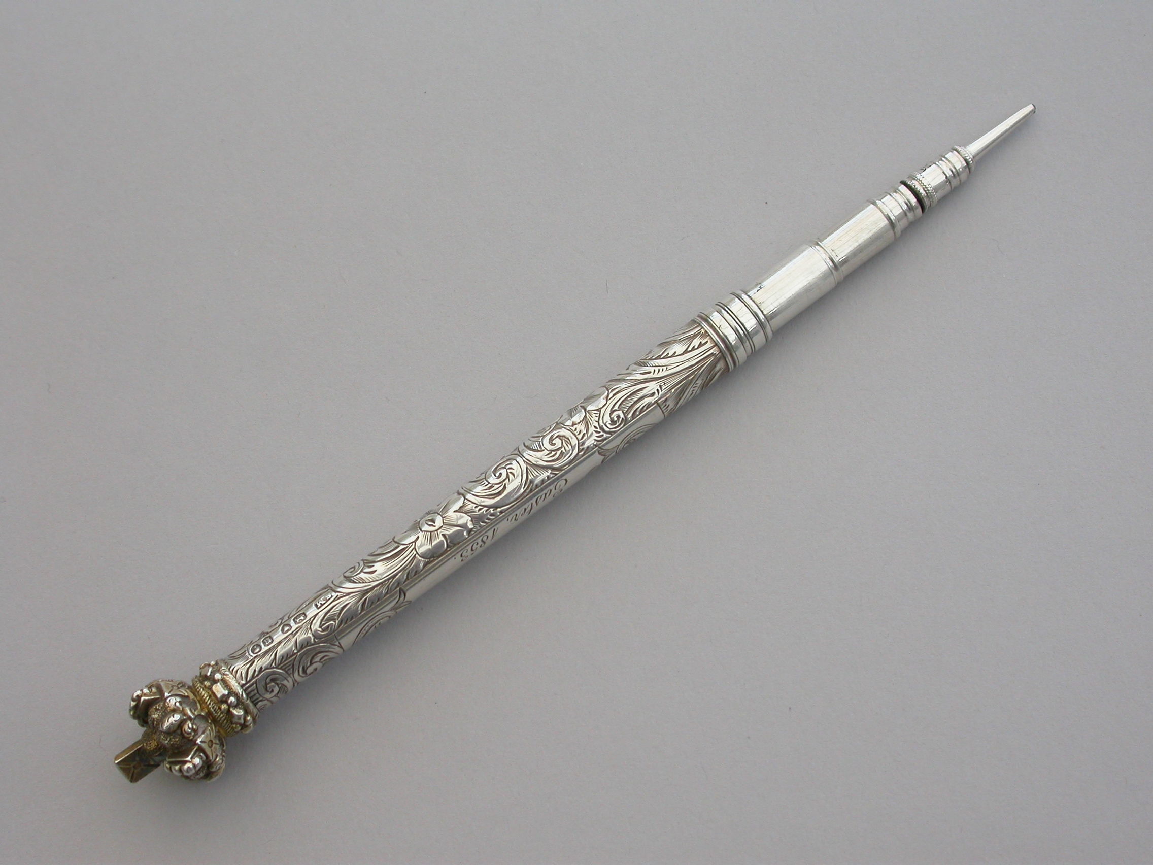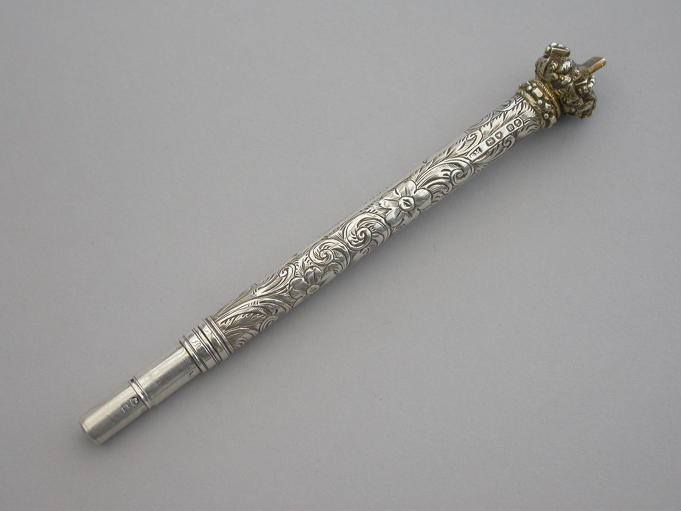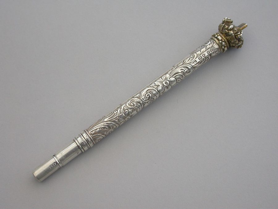 A large and very fine quality Victorian silver combined Propelling Pencil and Pen Holder made in the form of a Tipstaff, the body hand engraved with flowers and scrolls surrounding an engraved cartouche with a dolphin at either end. The silver gilt terminal formed as a Royal Crown and unscrewing to reveal a rifled lead reservoir. Both the pen and pencil components reversing and fitting inside the tubular body.