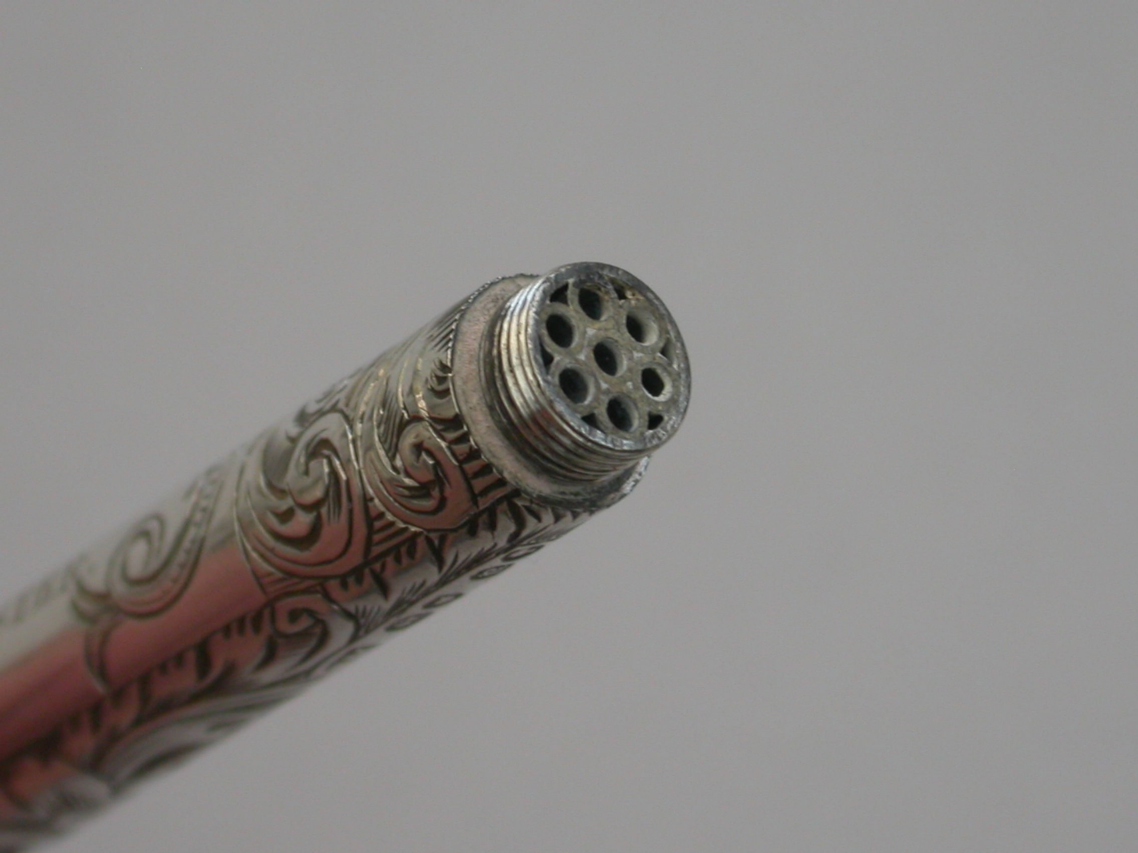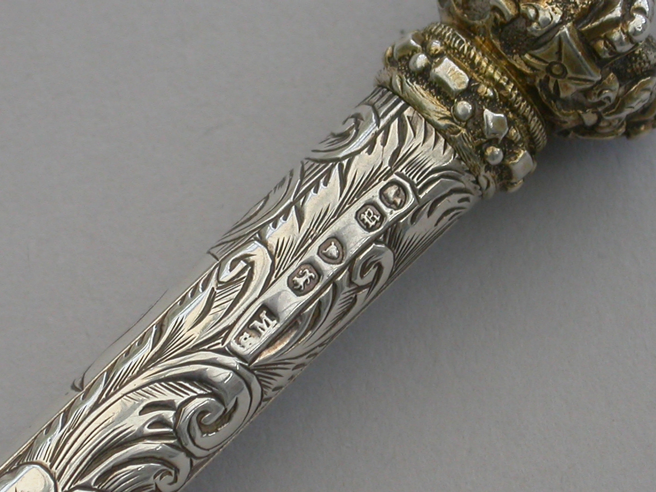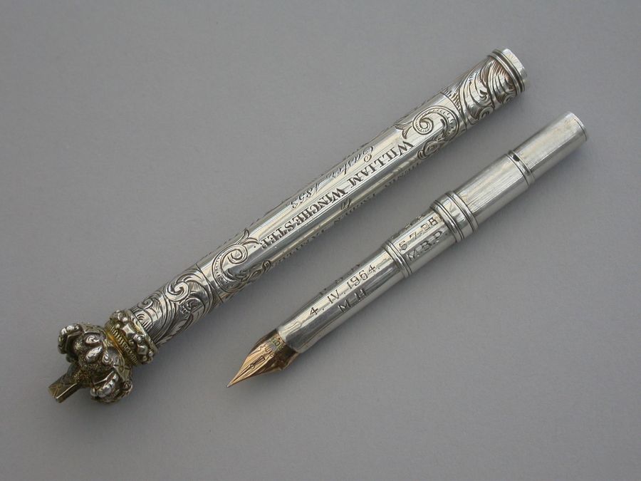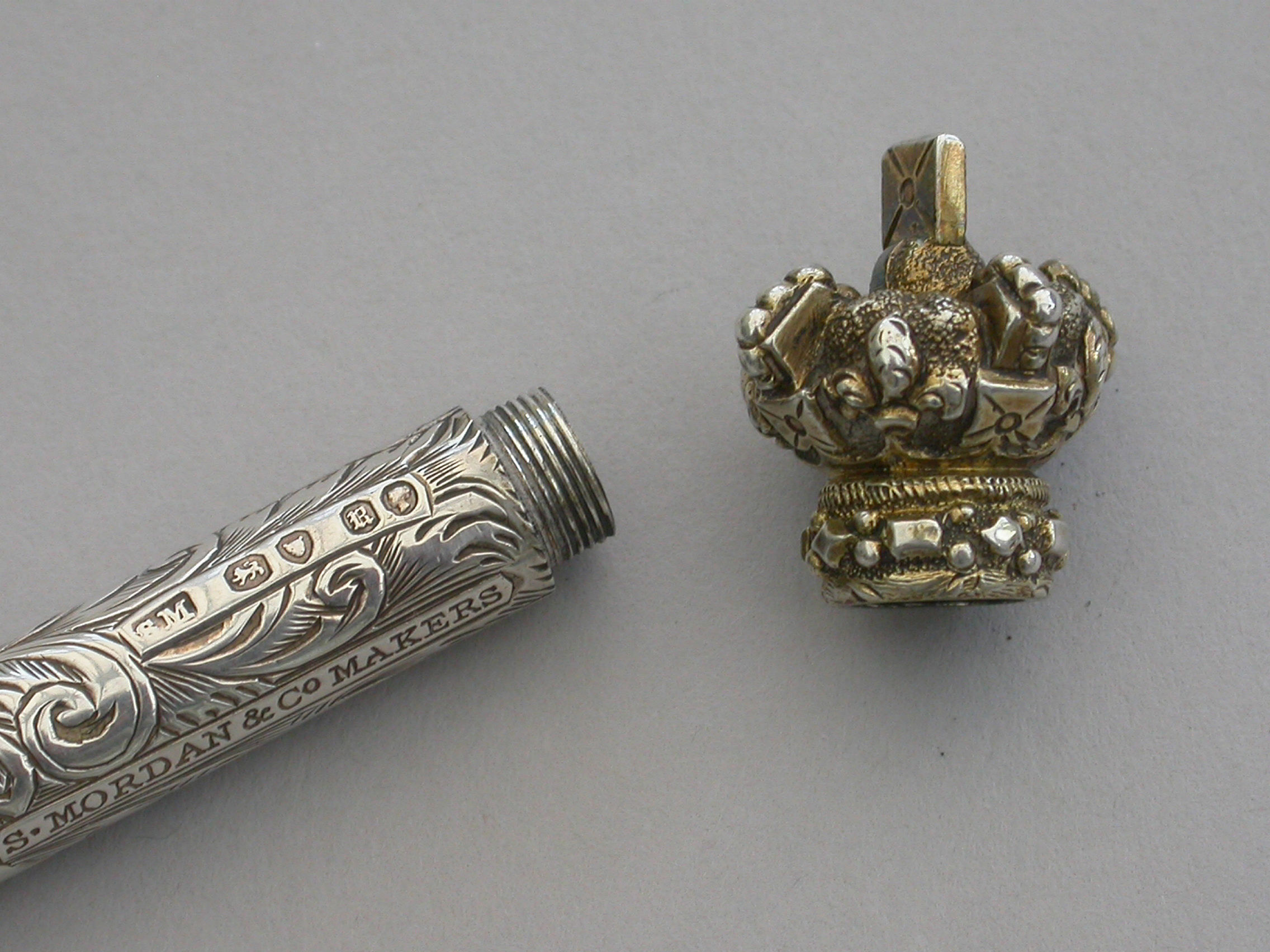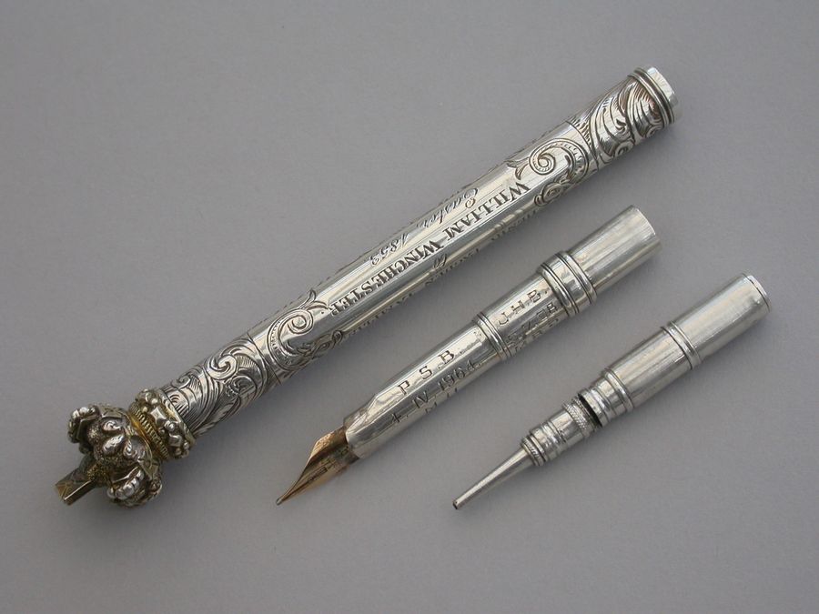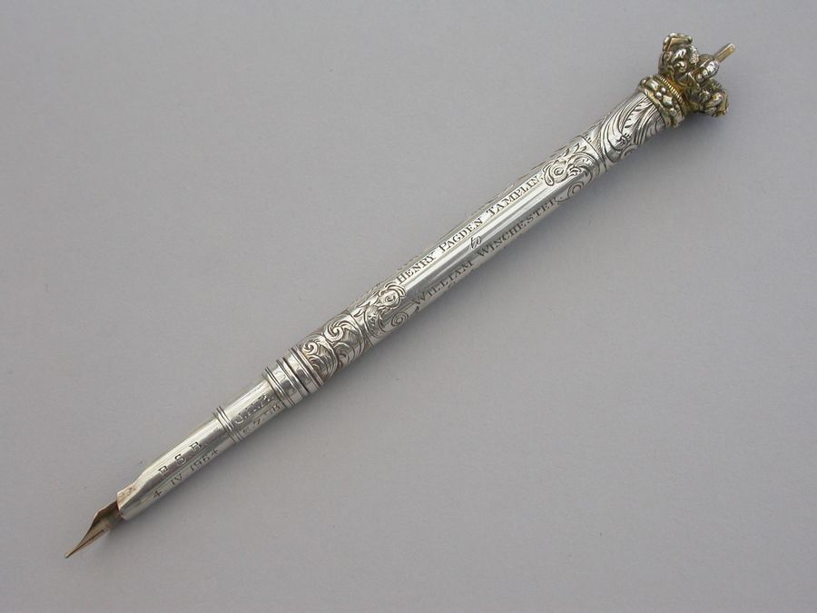 A large and very fine quality Victorian silver combined Propelling Pencil and Pen Holder made in the form of a Tipstaff, the body hand engraved with flowers and scrolls surrounding an engraved cartouche with a dolphin at either end. The silver gilt terminal formed as a Royal Crown and unscrewing to reveal a rifled lead reservoir. Both the pen and pencil components reversing and fitting inside the tubular body.