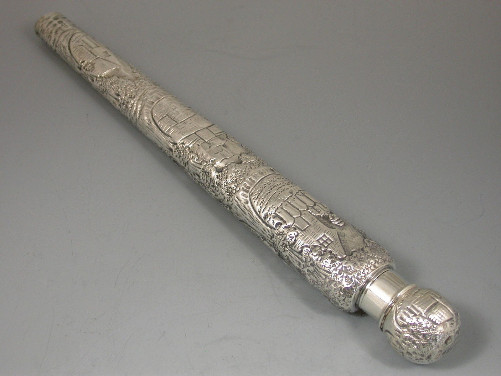 A good quality large Victorian silver Perfume Flask with long icicle form, the body chased and embossed with Teniers style figures and landscape scenes, screw off lid.