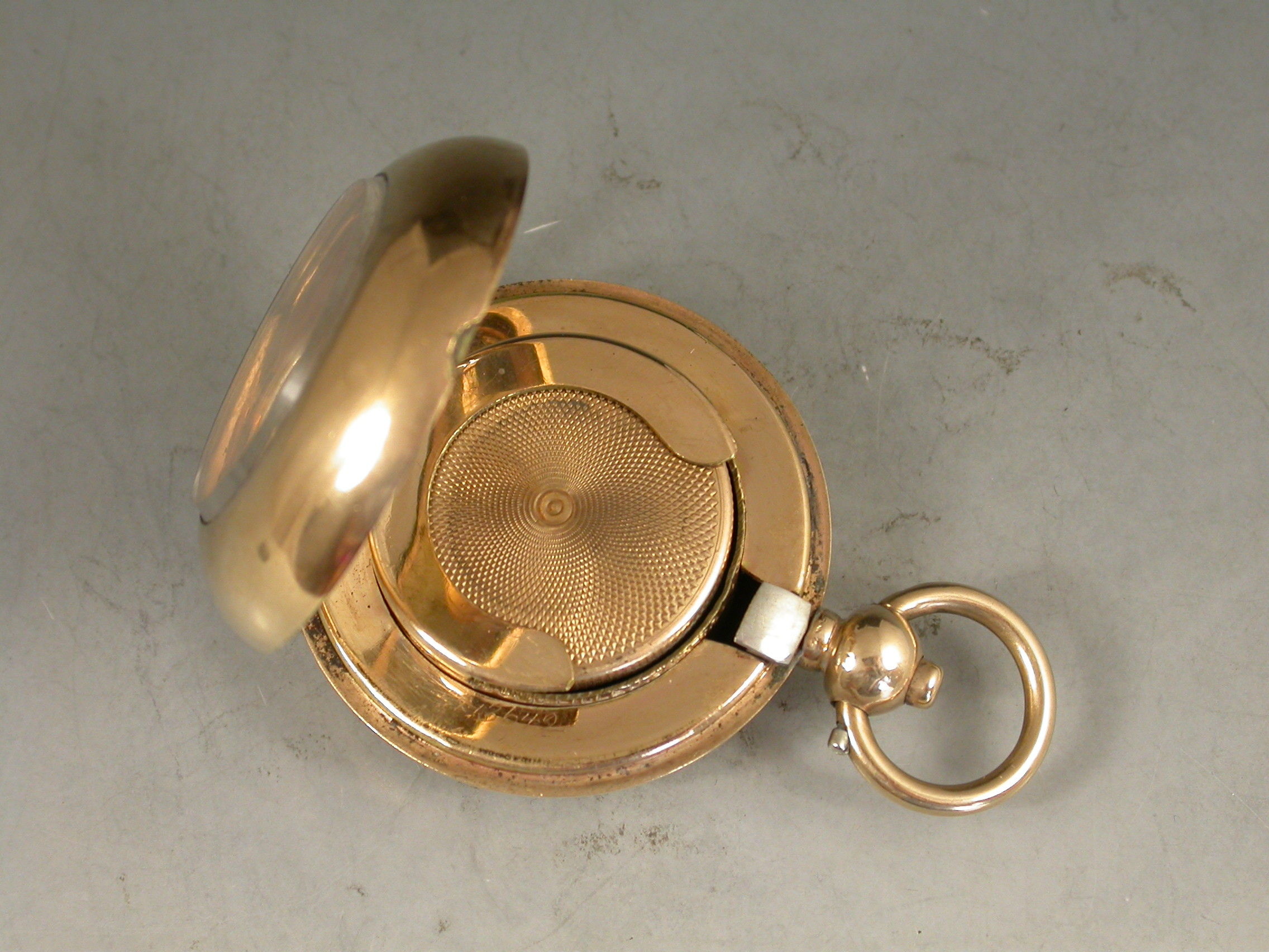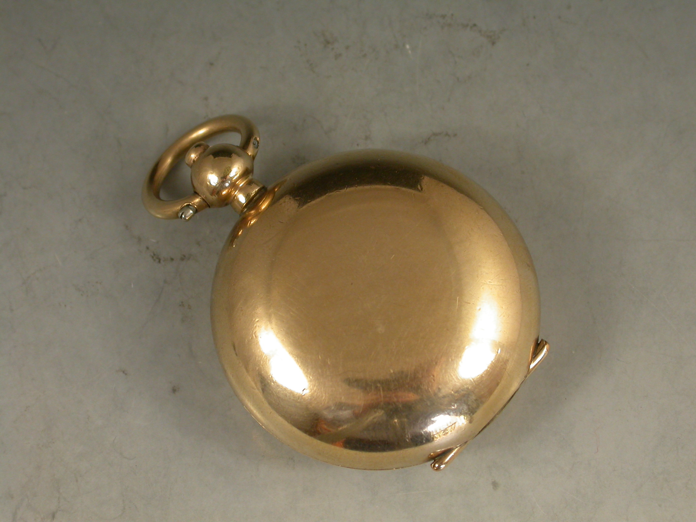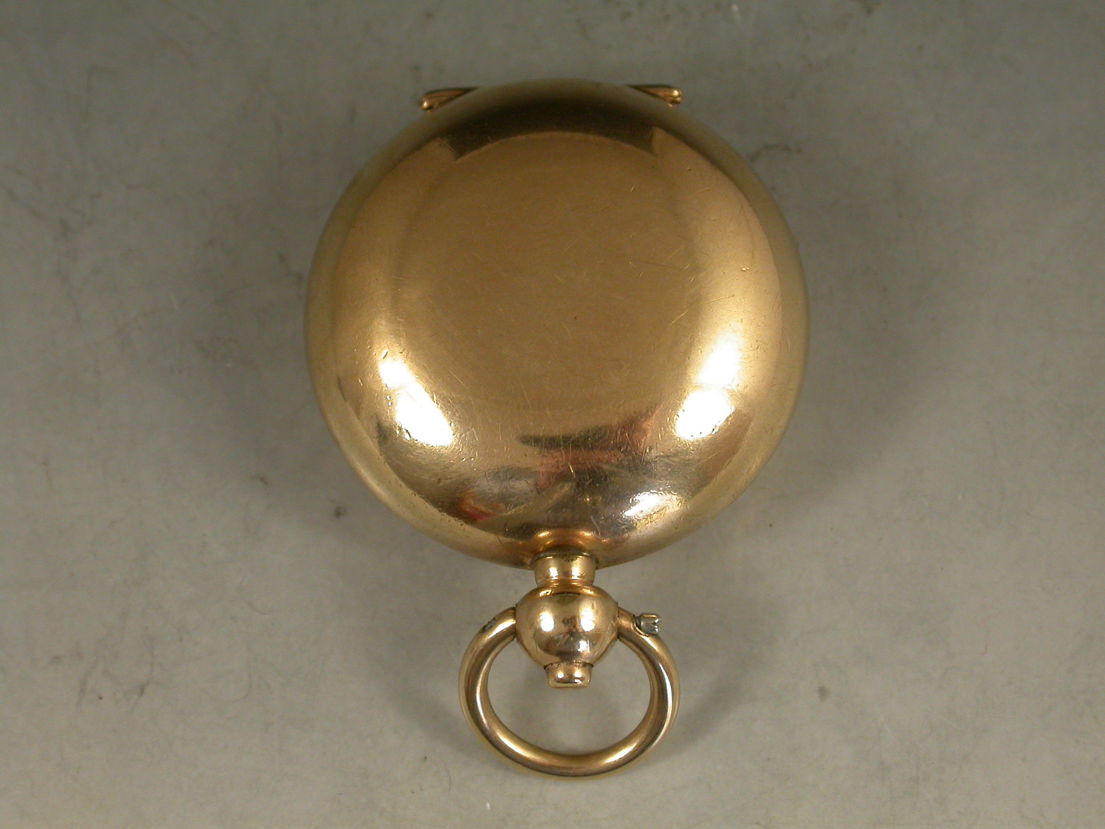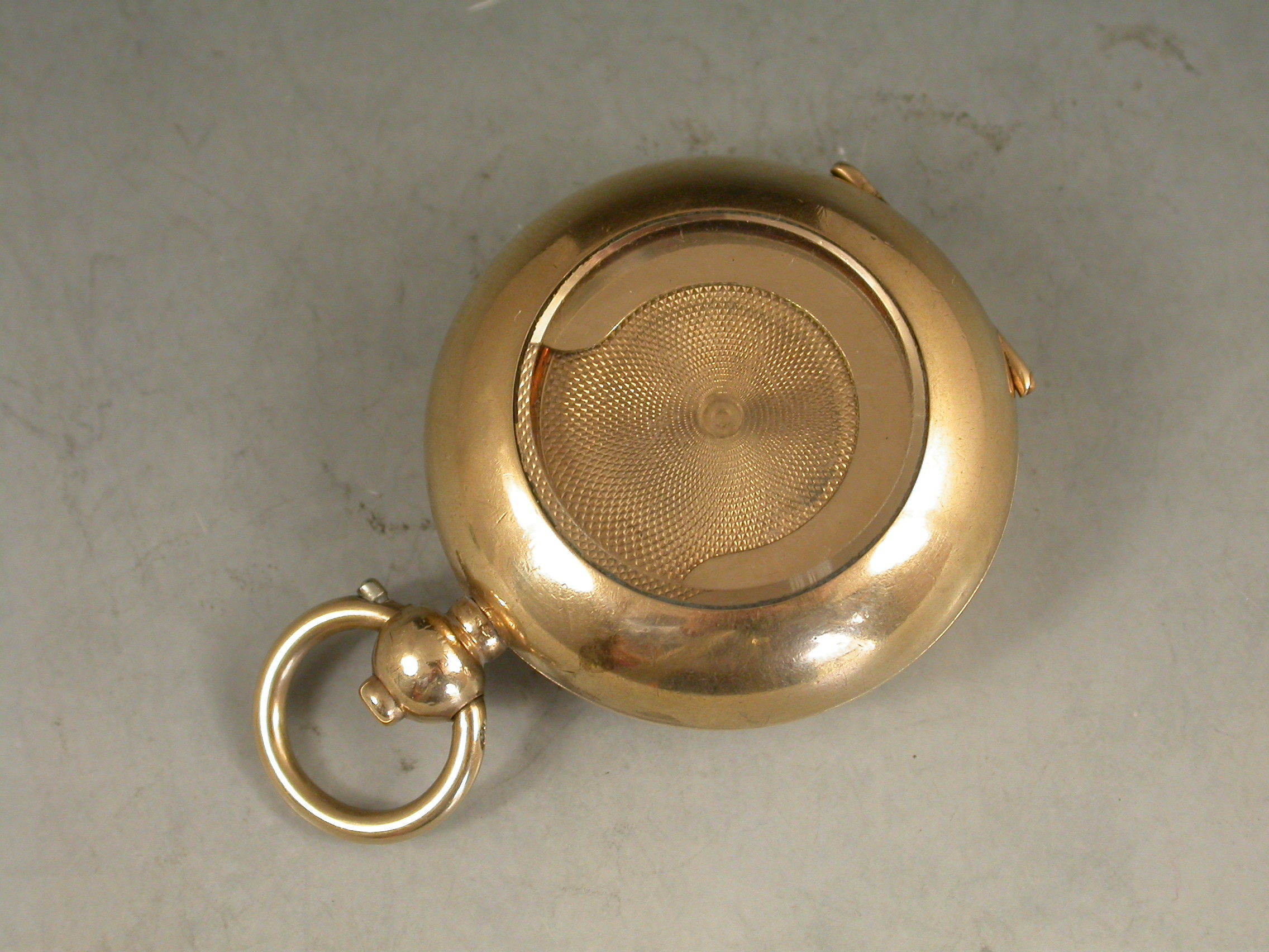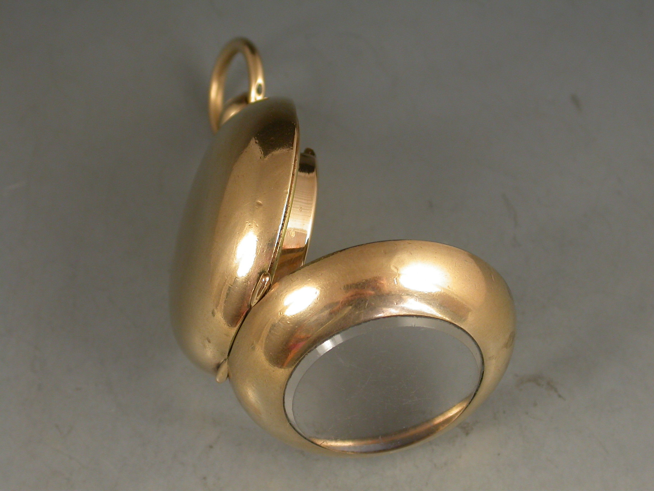 A late 19th century 9 carat gold plated Exhibition glass fronted full Sovereign Case with push button opening mechanism and attached suspension ring. The single sprung sovereign holder stamped with the 20 year plate guarantee.