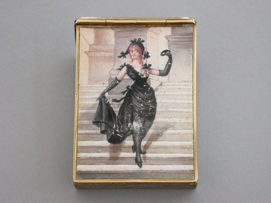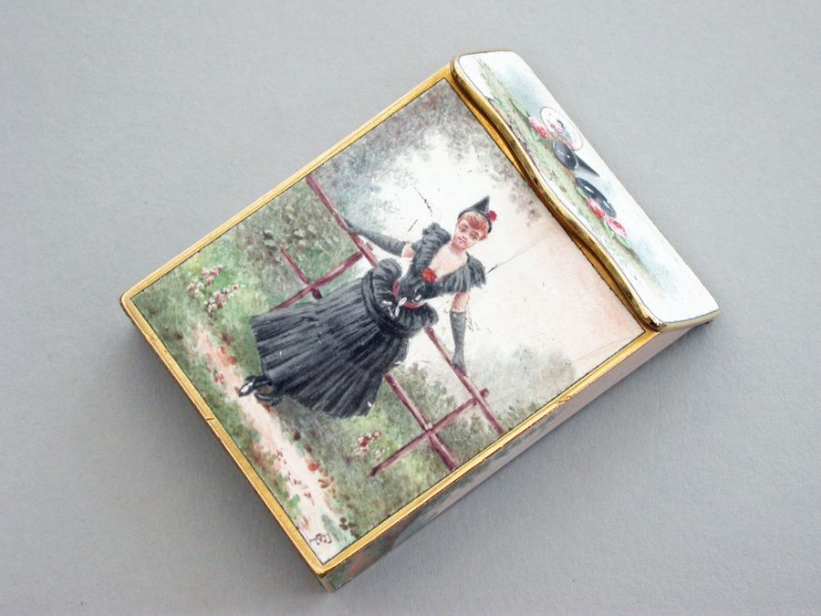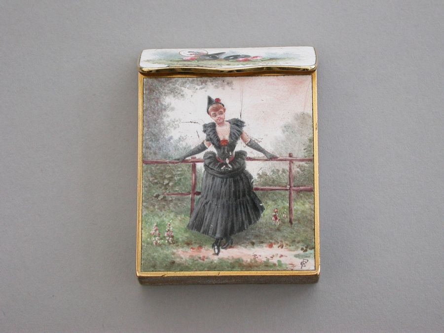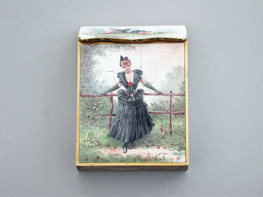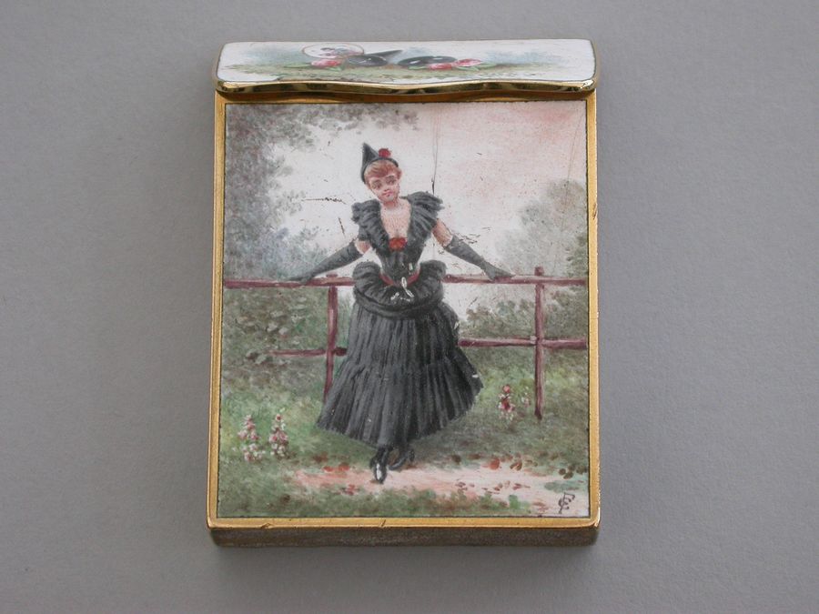 A late 19th century French gold and enamel Vesta Case of rectangular form with sloping sprung hinged lid, enameled on all surfaces apart from the base with images of glamorous ladies.