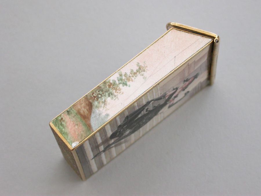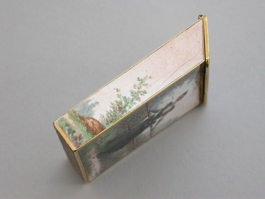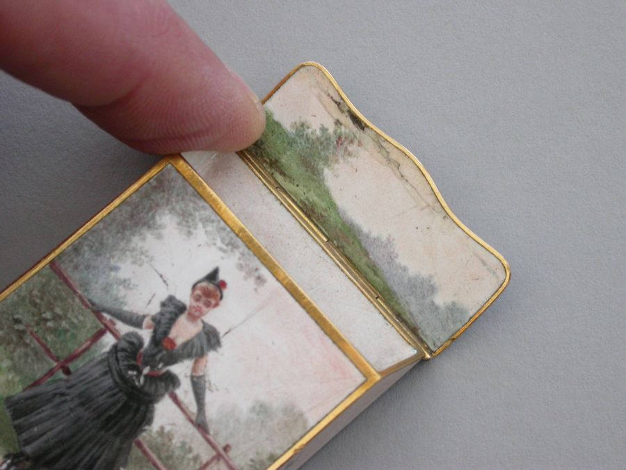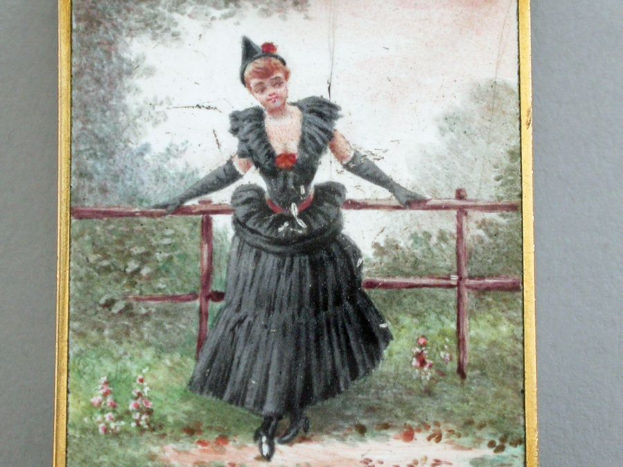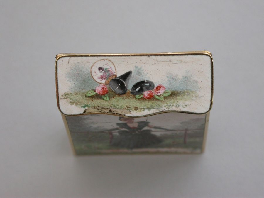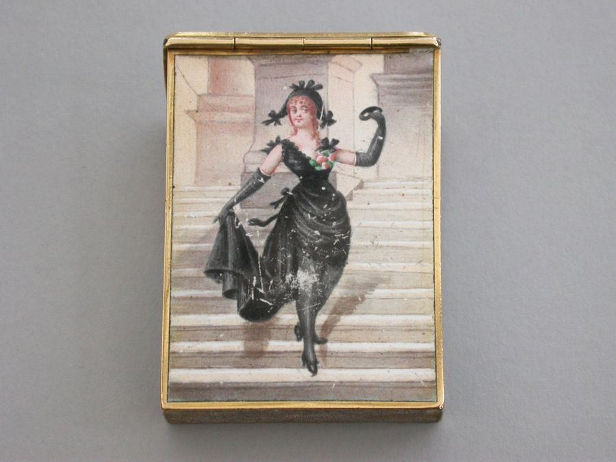 A late 19th century French gold and enamel Vesta Case of rectangular form with sloping sprung hinged lid, enameled on all surfaces apart from the base with images of glamorous ladies.