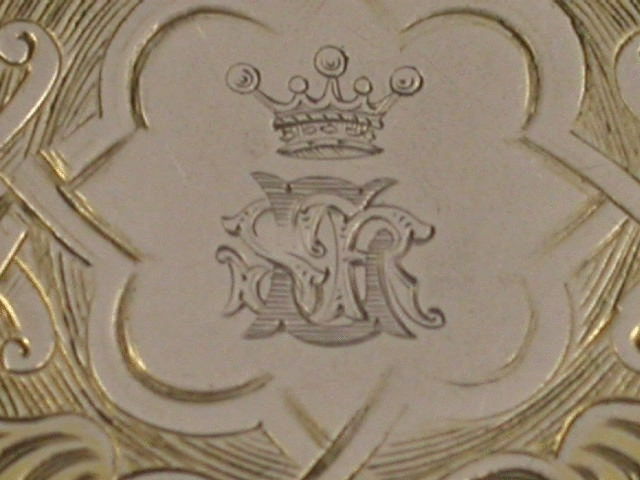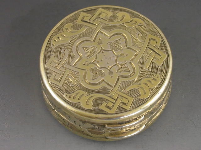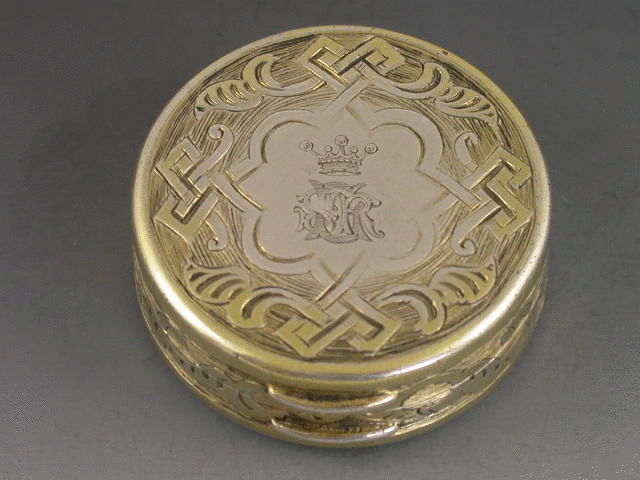 A very fine Victorian parcel gilt Vinaigrette of disc shape, engraved with geometric scroll design, the central shaped cartouche to the lid engraved with a monogram below a coronet, finely pierced grille and silver gilt interior.