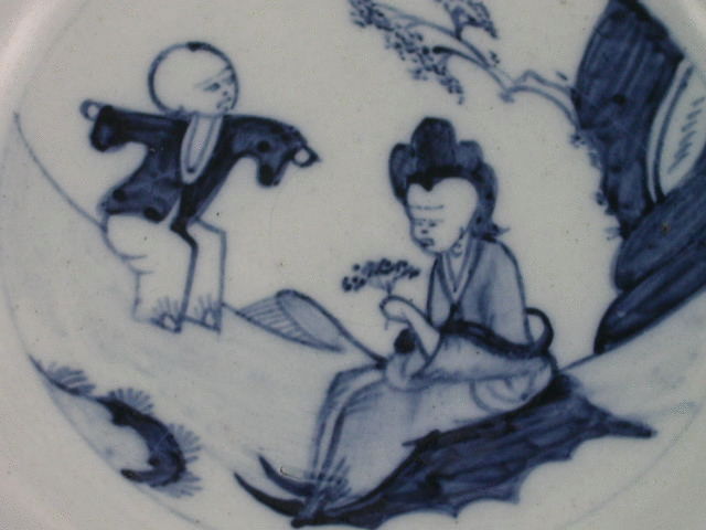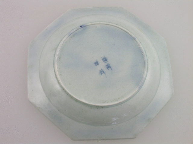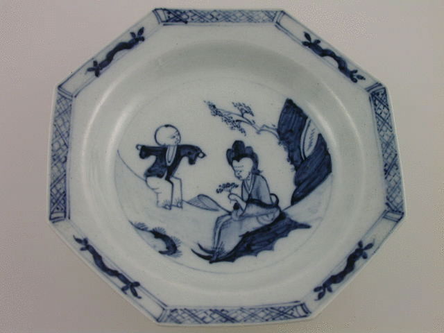 A fine and rare Richard Chaffers Liverpool octagonal Saucer with the so called “Jumping Boy” pattern printed in underglaze blue depicting a young boy jumping for joy, his mother seated in a garden holding a spray of flowers, within panelled diaper border.