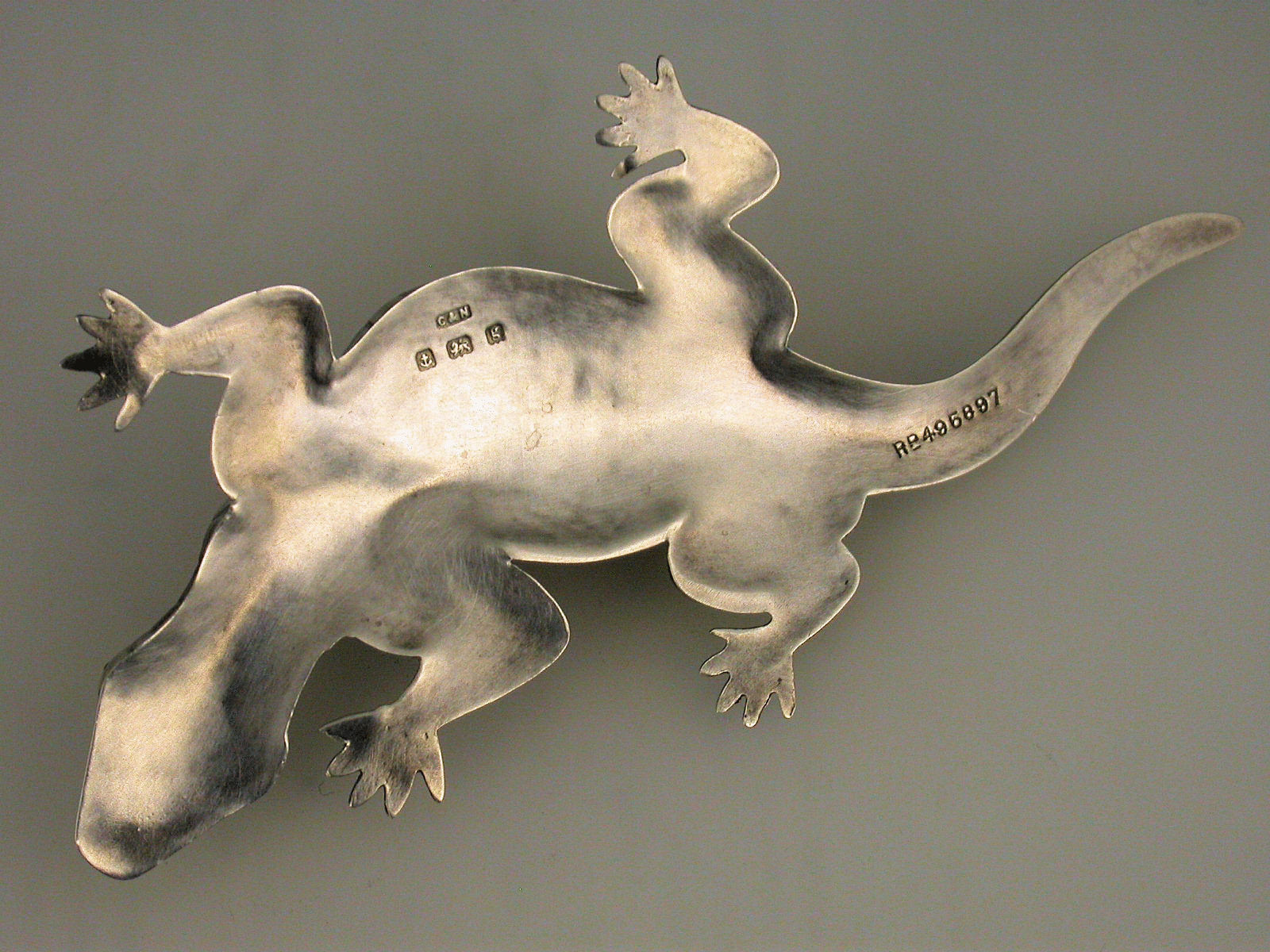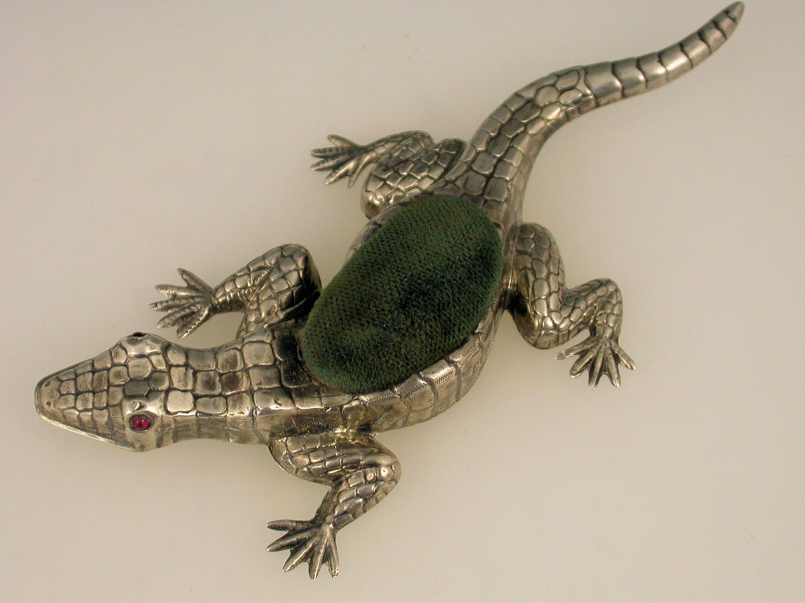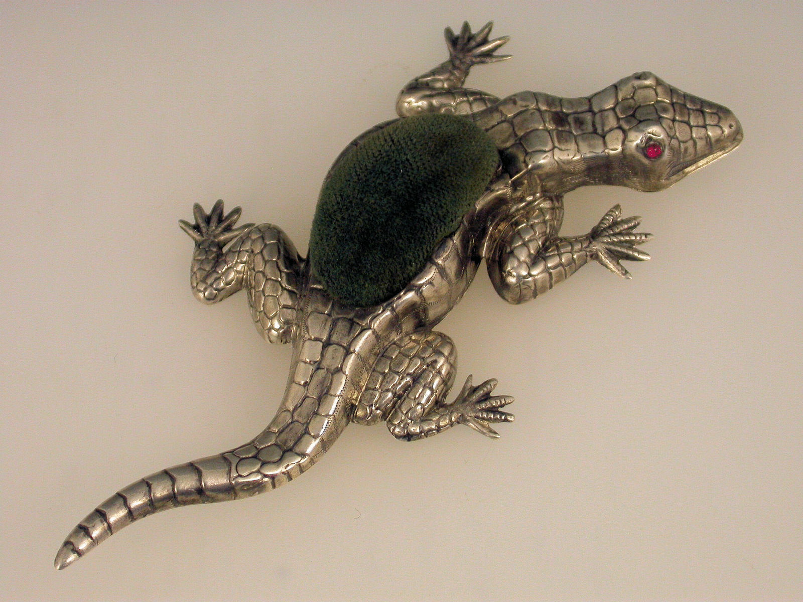 A rare Edwardian silver Pin Cushion modelled in the form of a Lizard, with ruby red garnet eyes and original green velvet cushion.