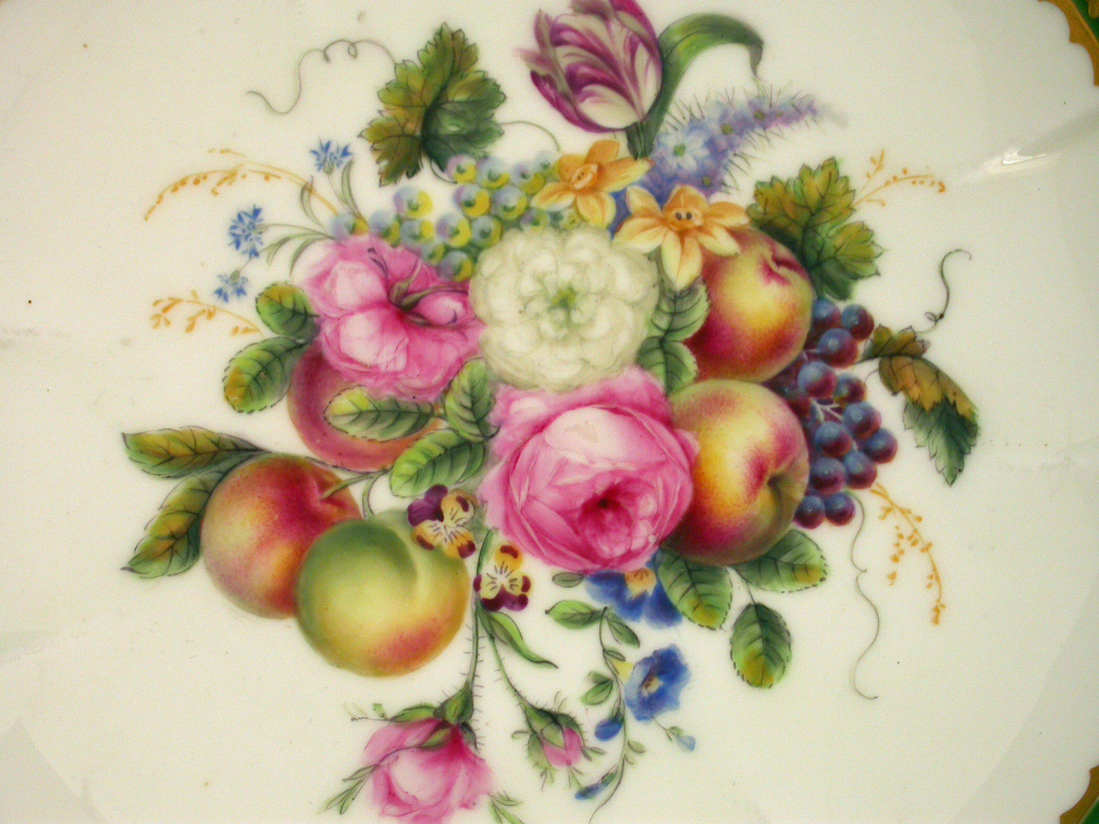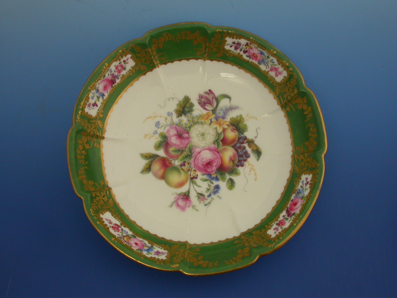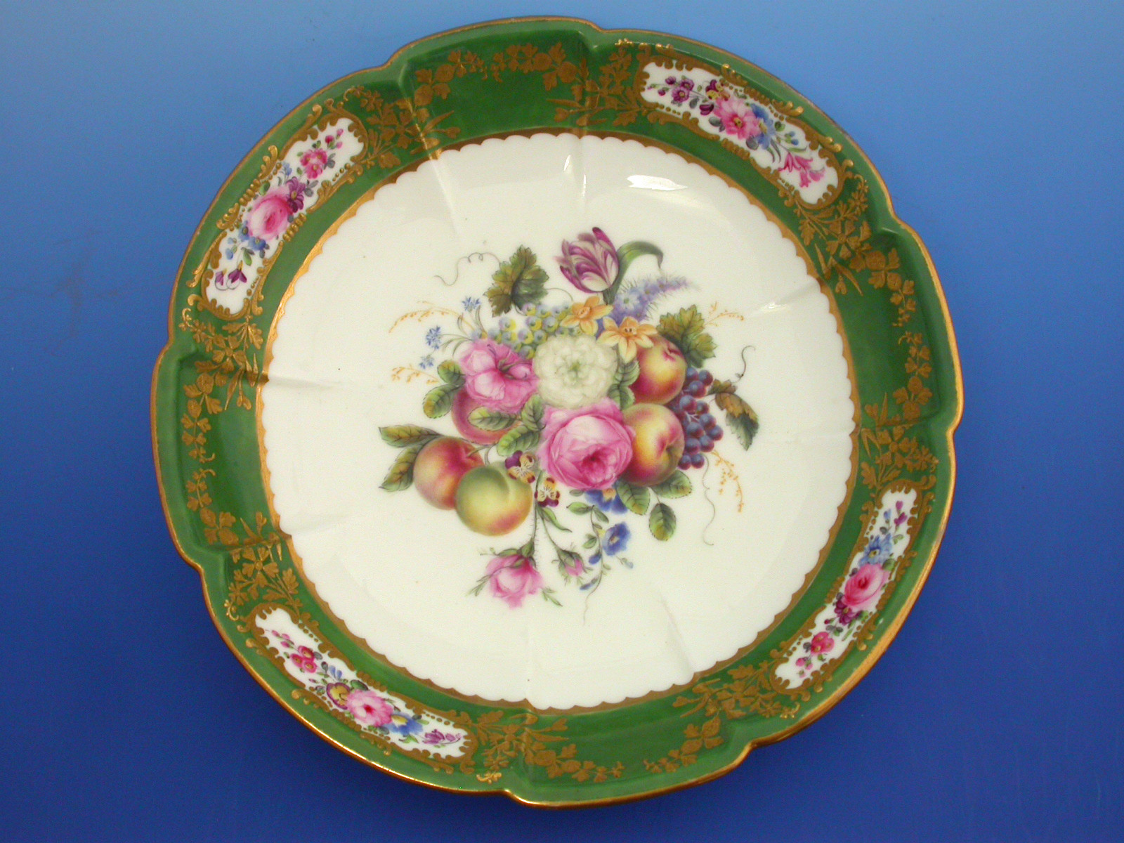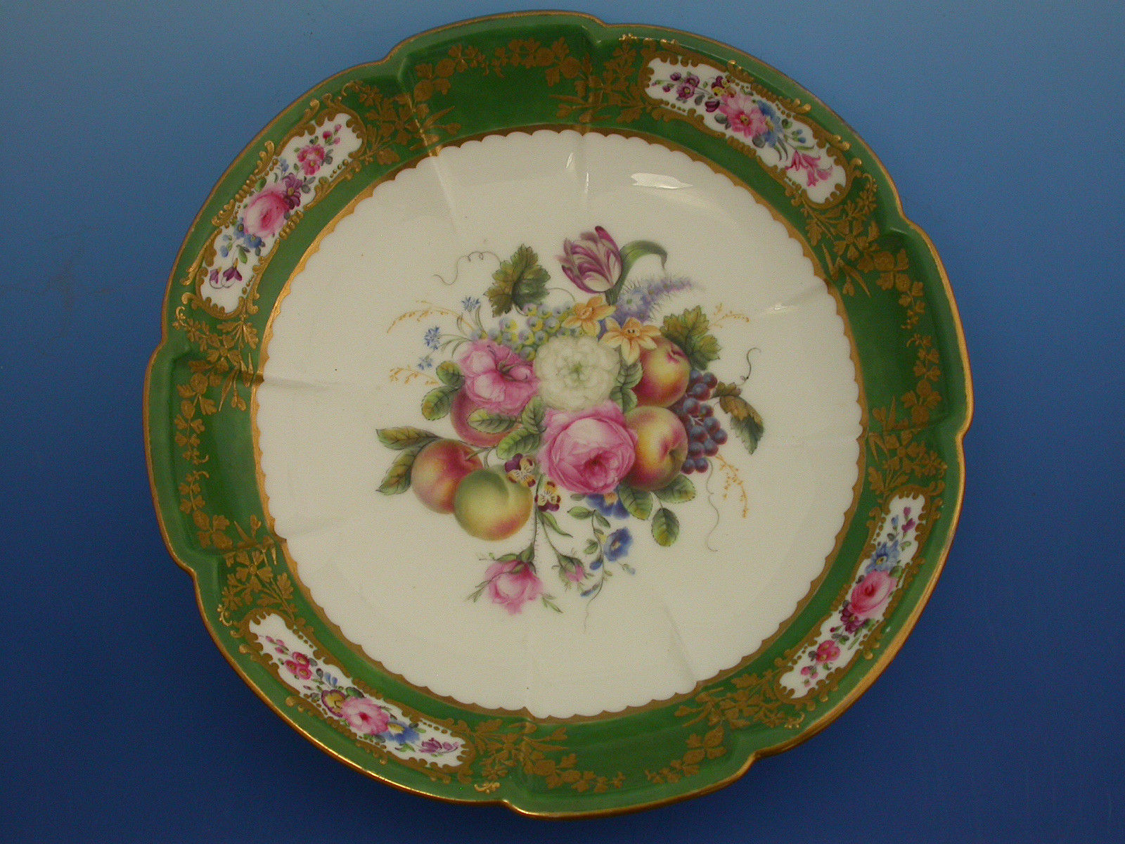 A fine early 19th century Nantgarw shaped circular cruciform Dish, decorated in London with a central bouquet of English flowers within a Ciselle gilt enriched apple green border and four cartouches of foliate sprays, gilt line rims.