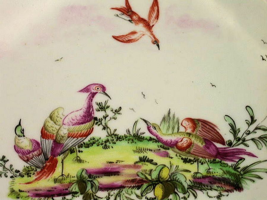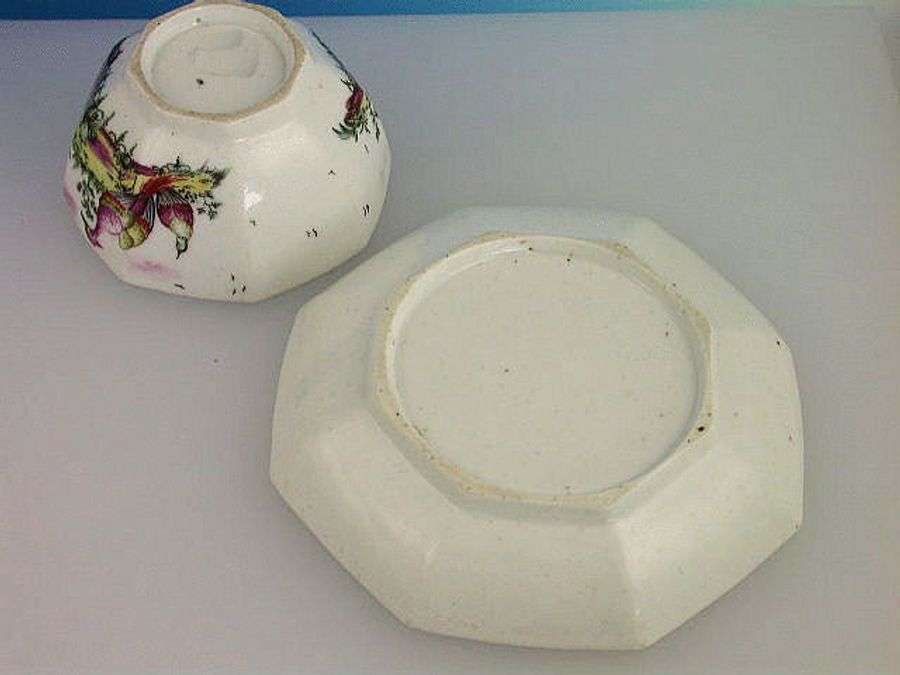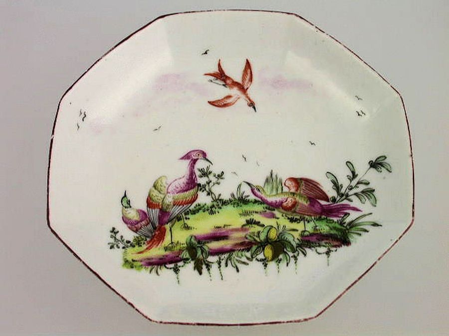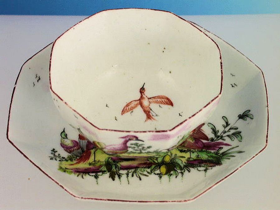 A very fine Longton Hall octagonal Tea Bowl and Saucer painted in polychrome enamels with exotic birds in landscape, all within a chocolate line border.