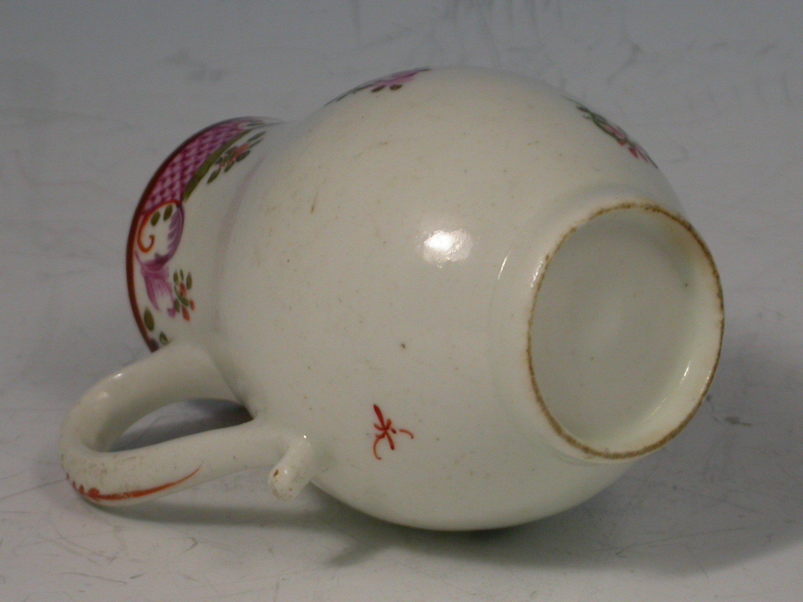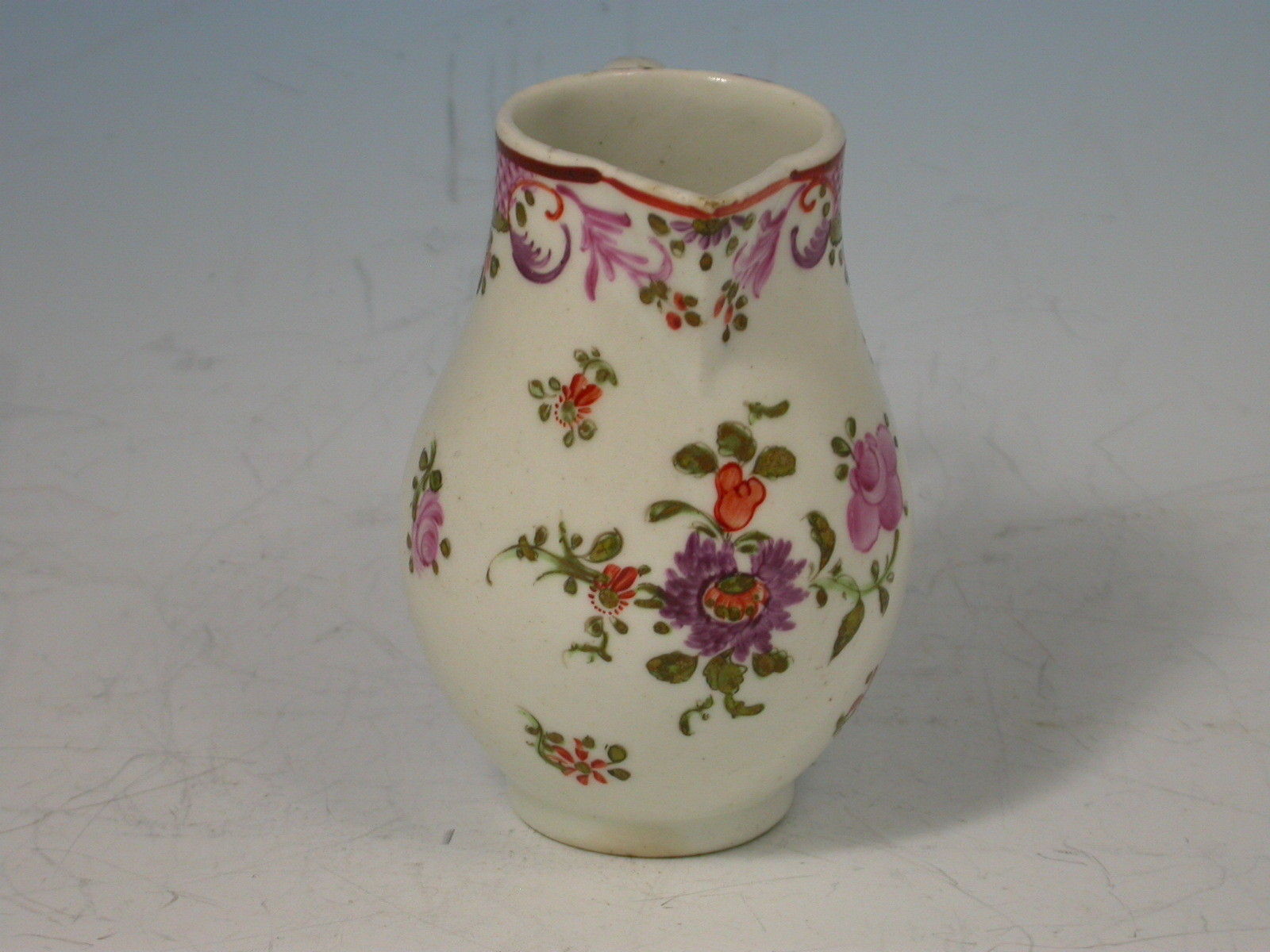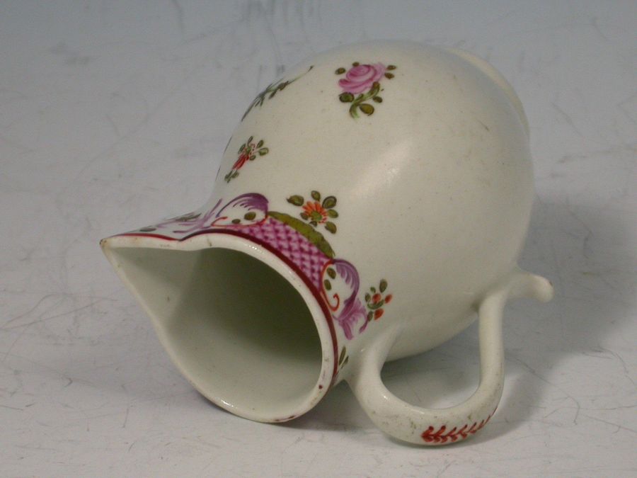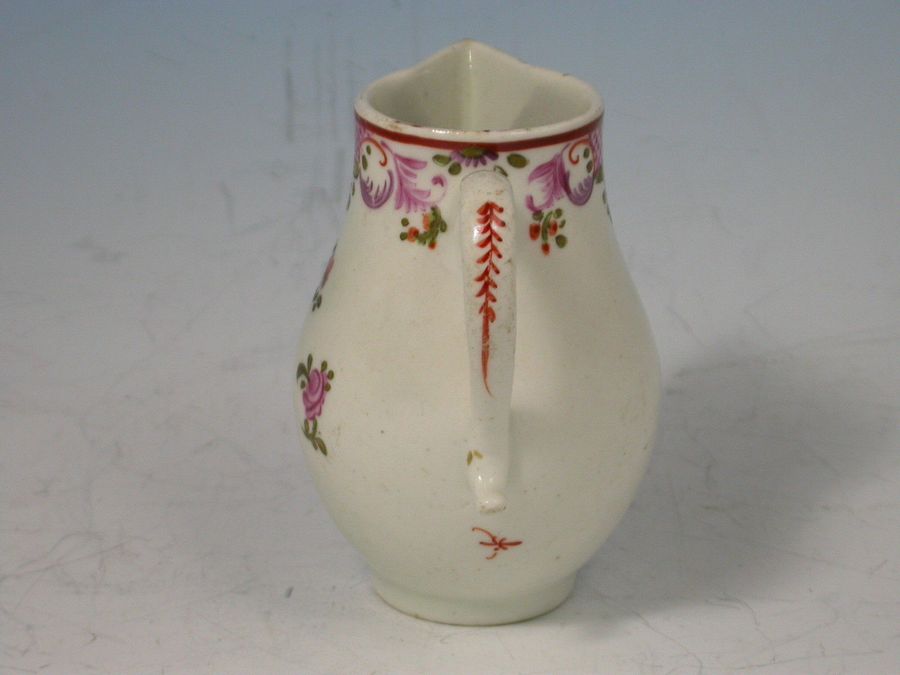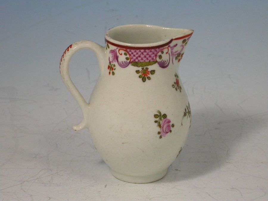 A Lowestoft Sprarrowbeak Jug with solid strap handle, painted in polychrome enamels with Curtis design flowers within a puce hatched border.