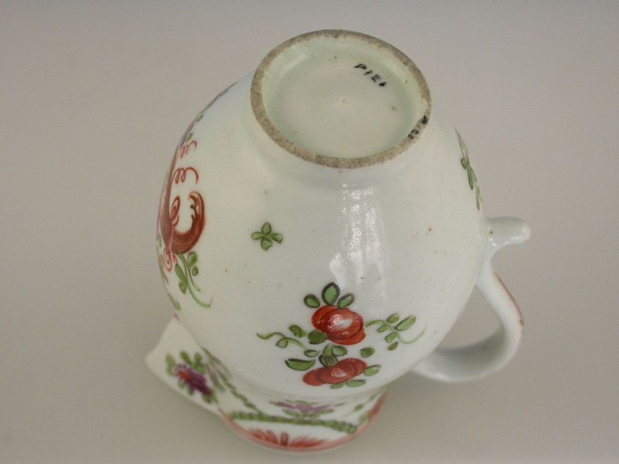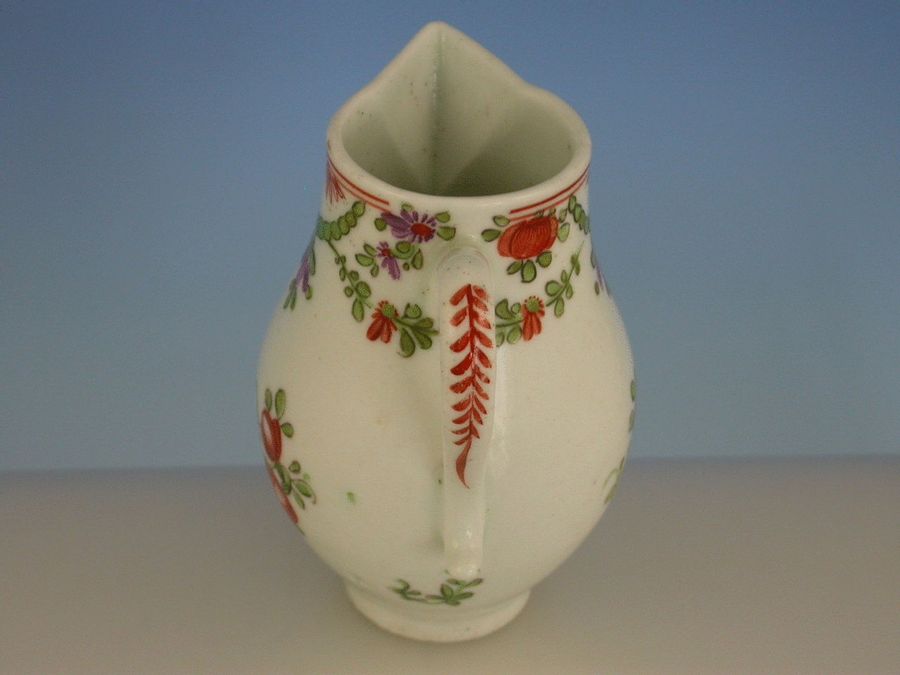 A good Lowestoft Curtis Pattern Sparrowbeak Jug painted with a central bouquet of flowers within a garlanded floral border, solid loop handle.