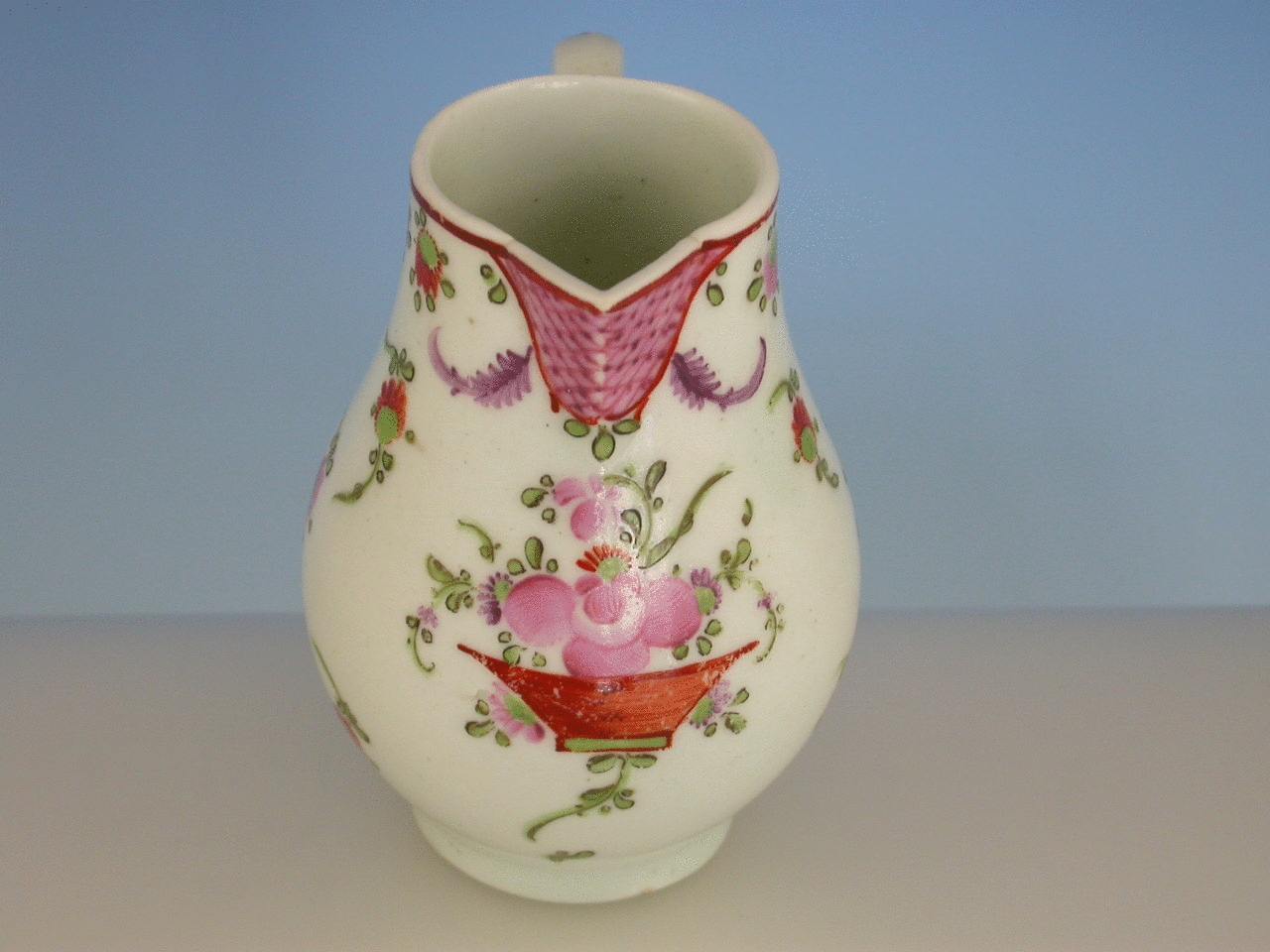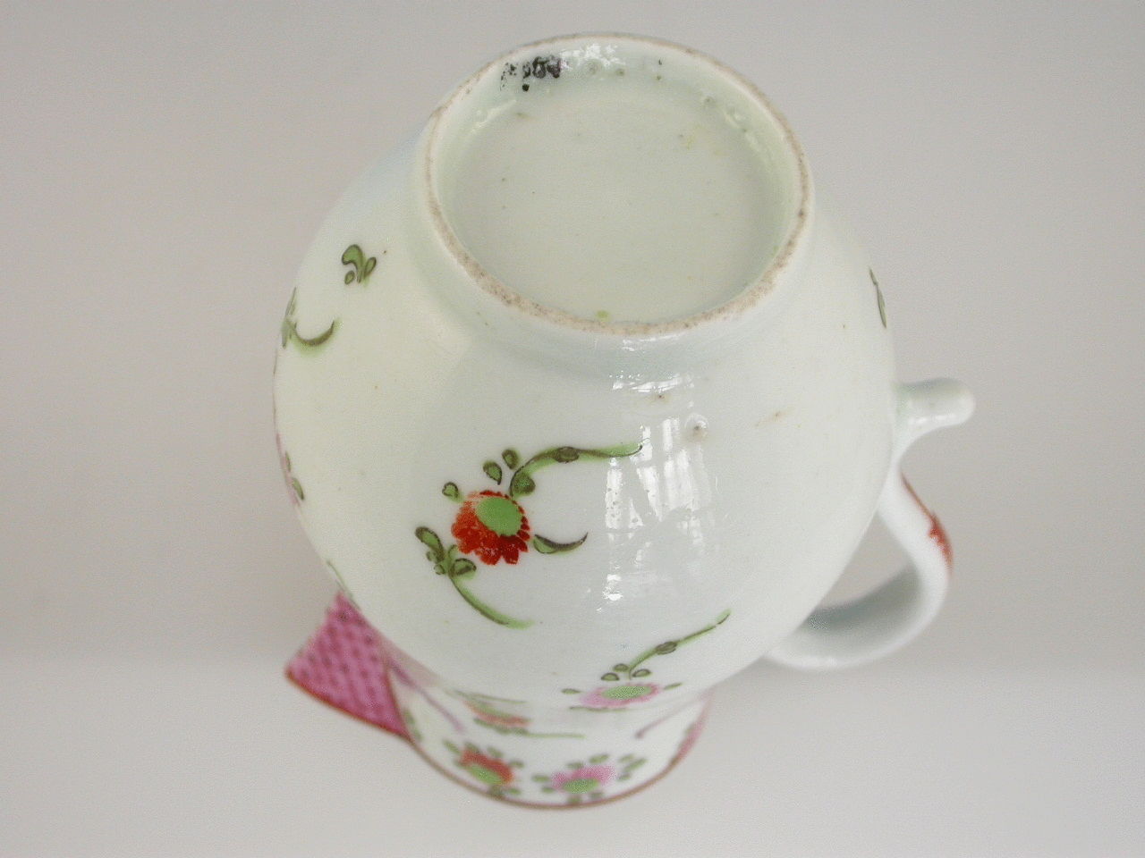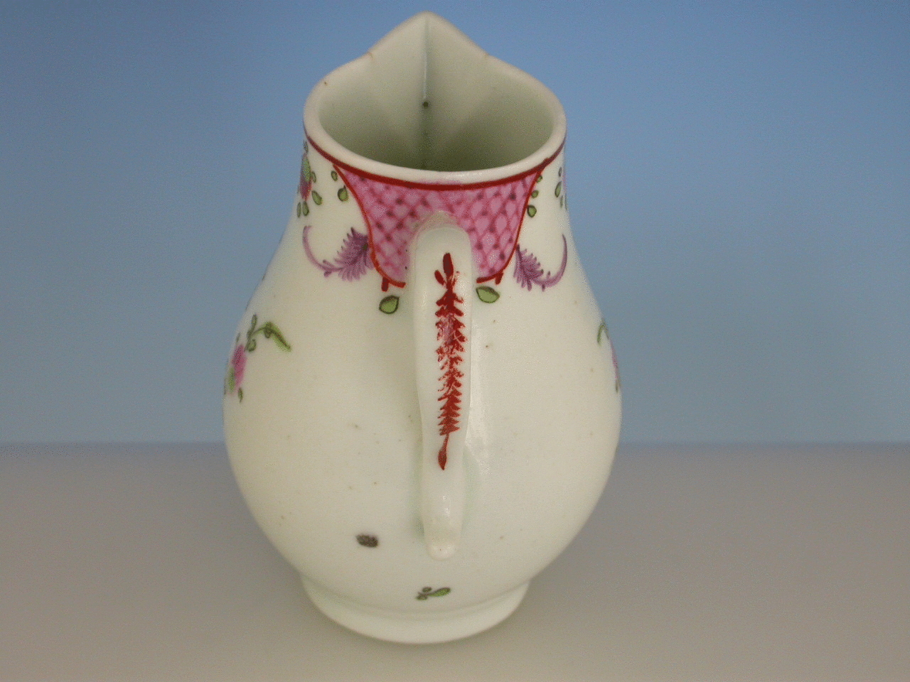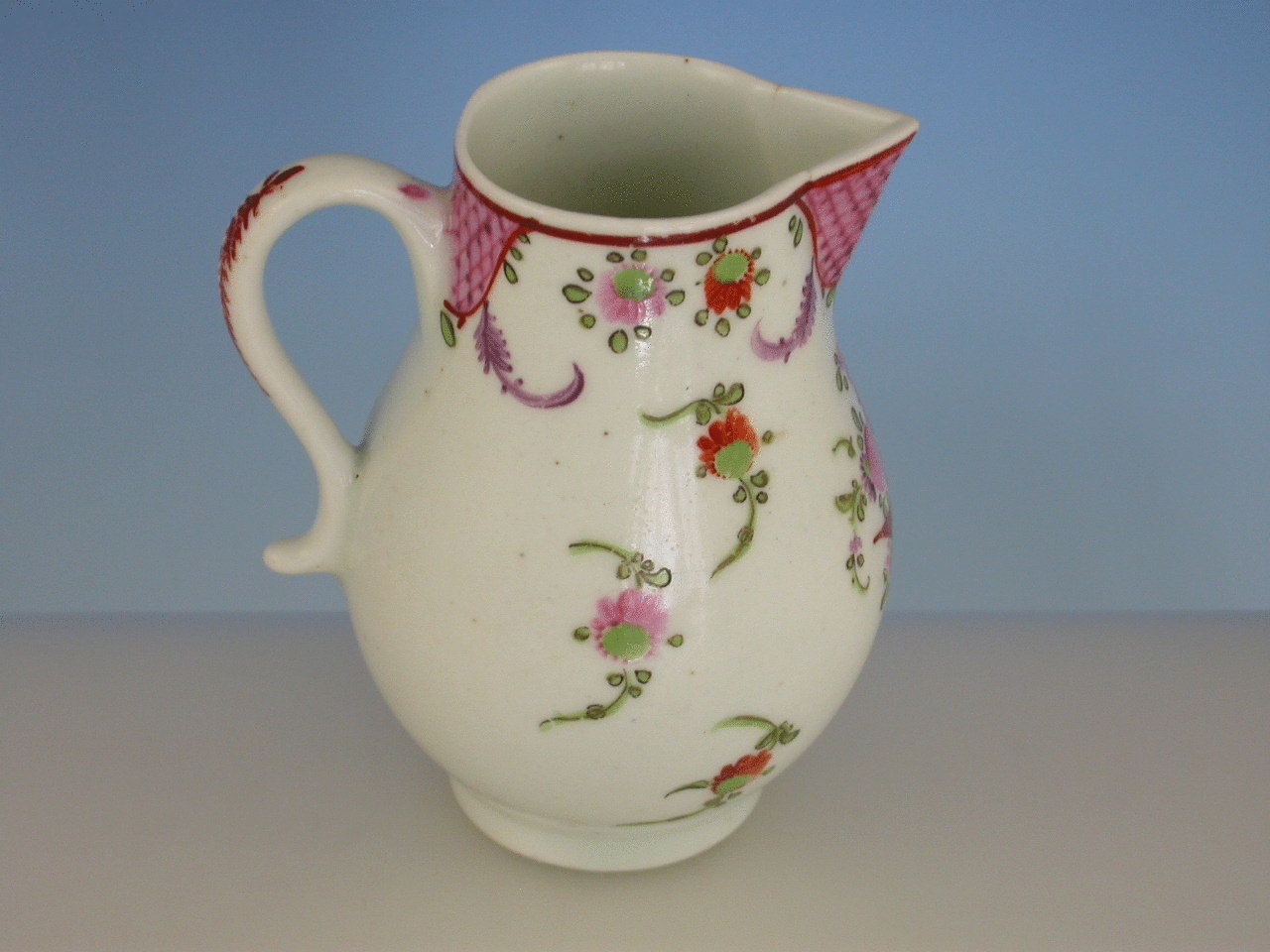 A good Lowestoft Curtis Pattern Sparrowbeak Jug painted with a central rouge de fer bowl of pink flowers with green sprays, solid loop handle.