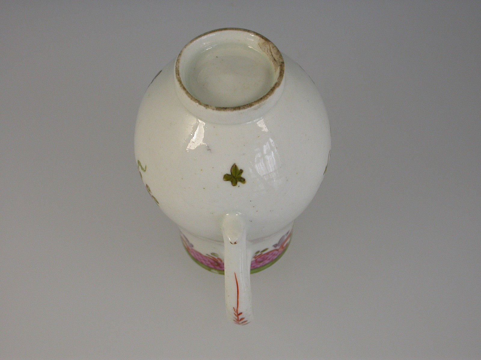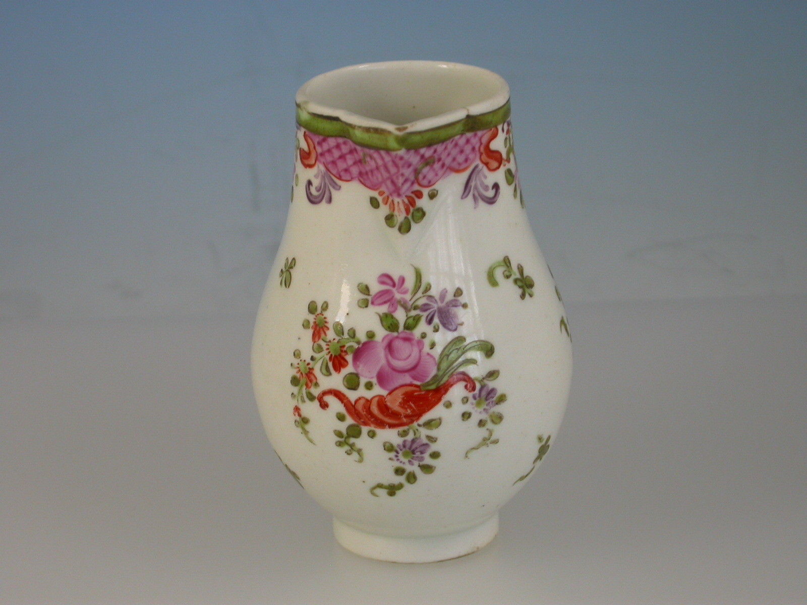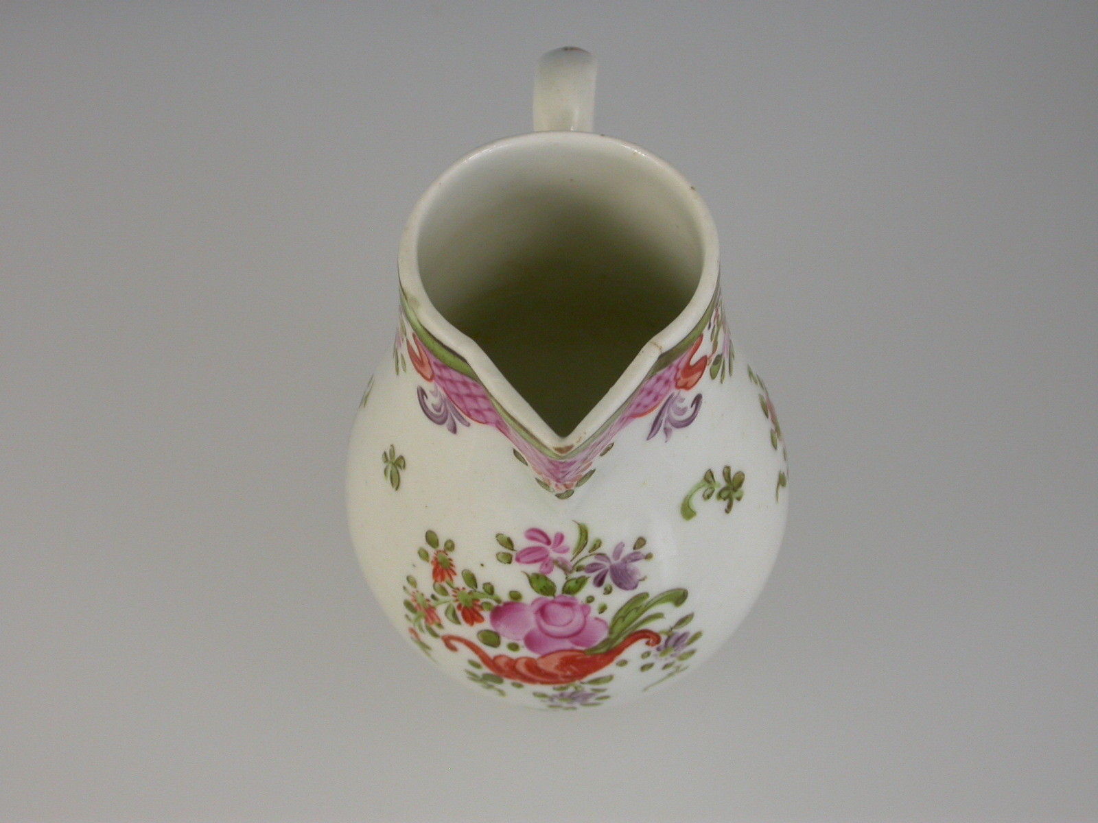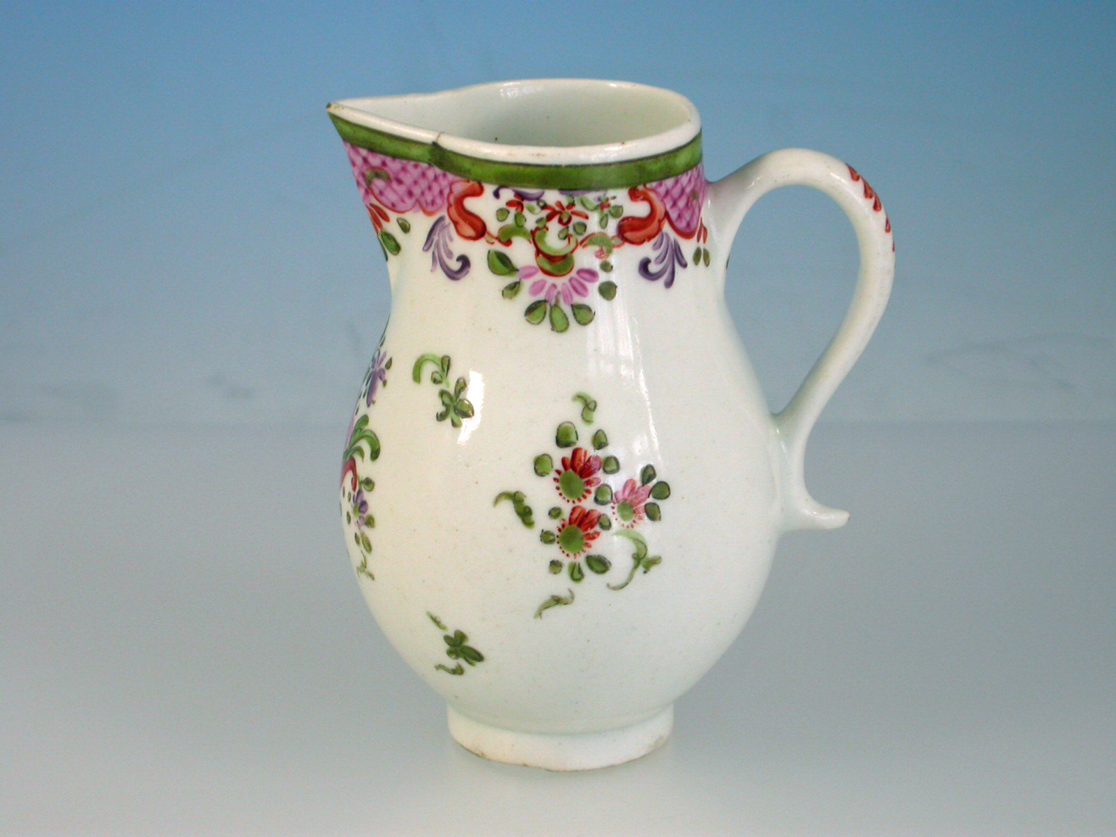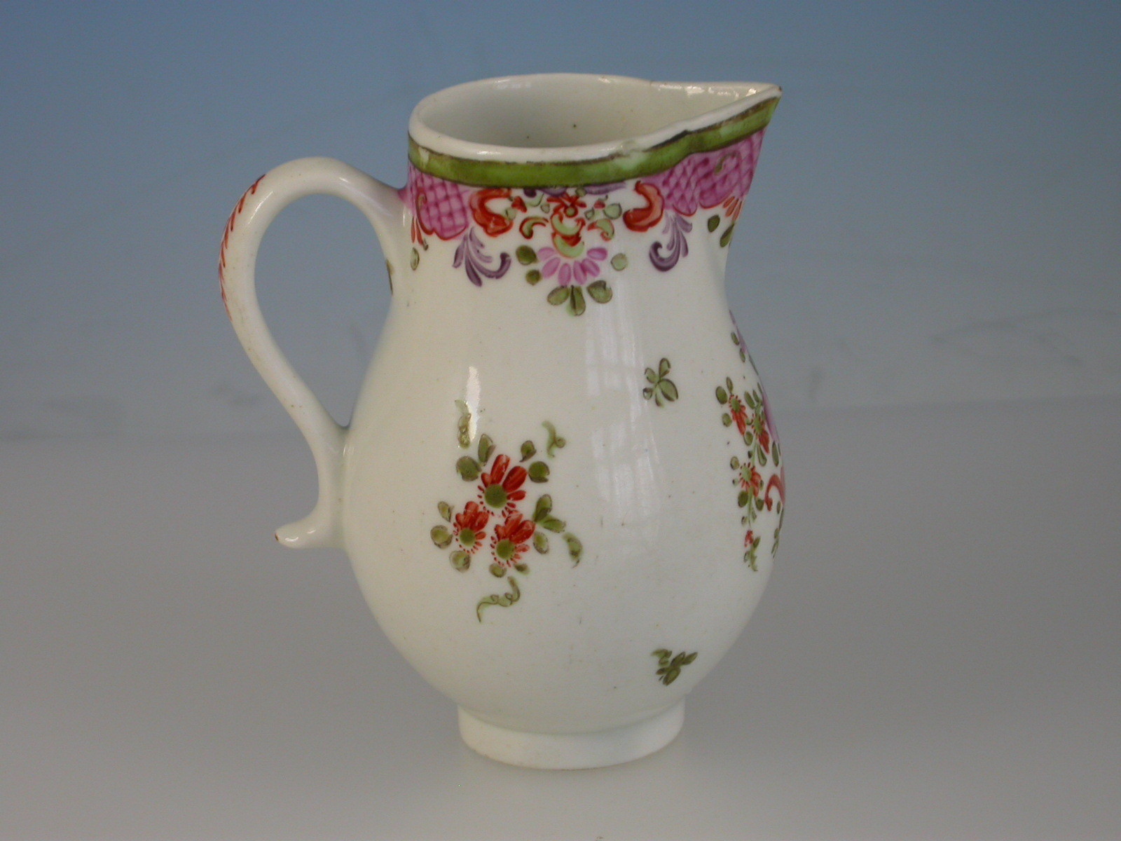A good Lowestoft sparrowbeak Jug of Curtis type with solid loop handle with kick to base, painted in polychrome enamels with a bouquet and sprays of English flowers.
