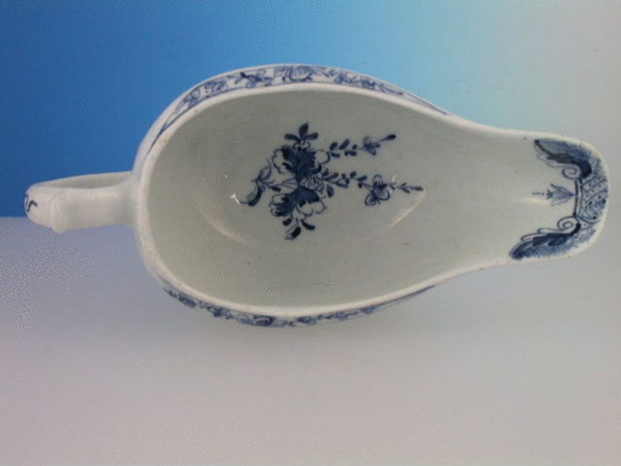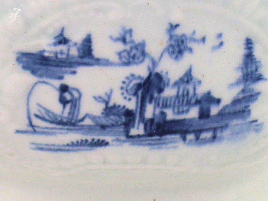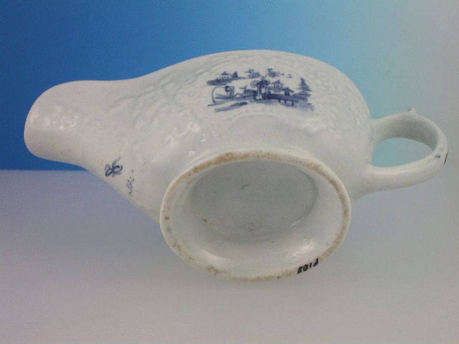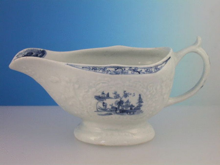 A fine Lowestoft relief moulded Sauceboat on pedestal foot, loop handle with pronounced thumbpiece. The mirror shaped reserves painted in underglaze blue with oriental lakeside scenes including a fisherman in a boat. c1765-70.